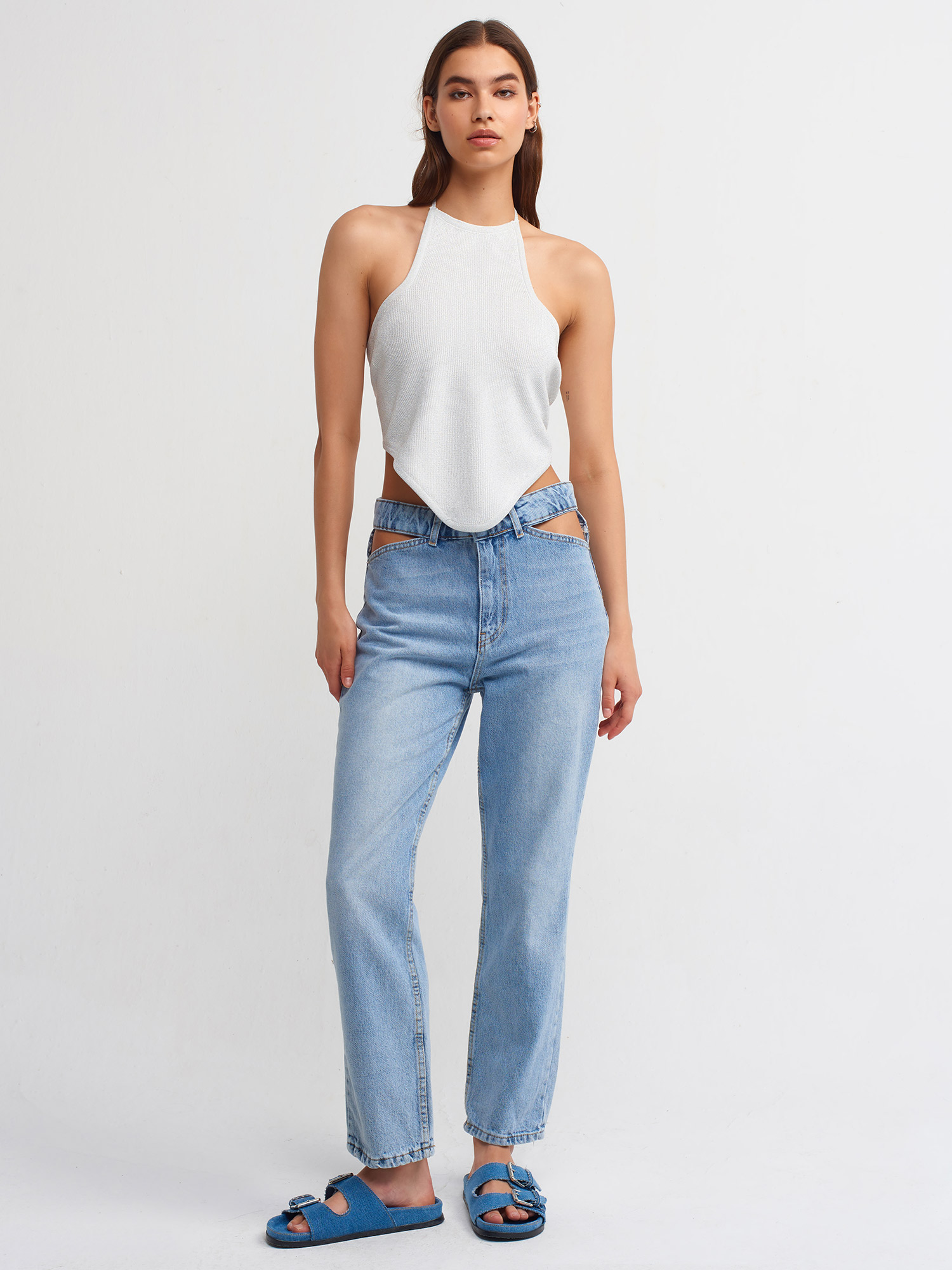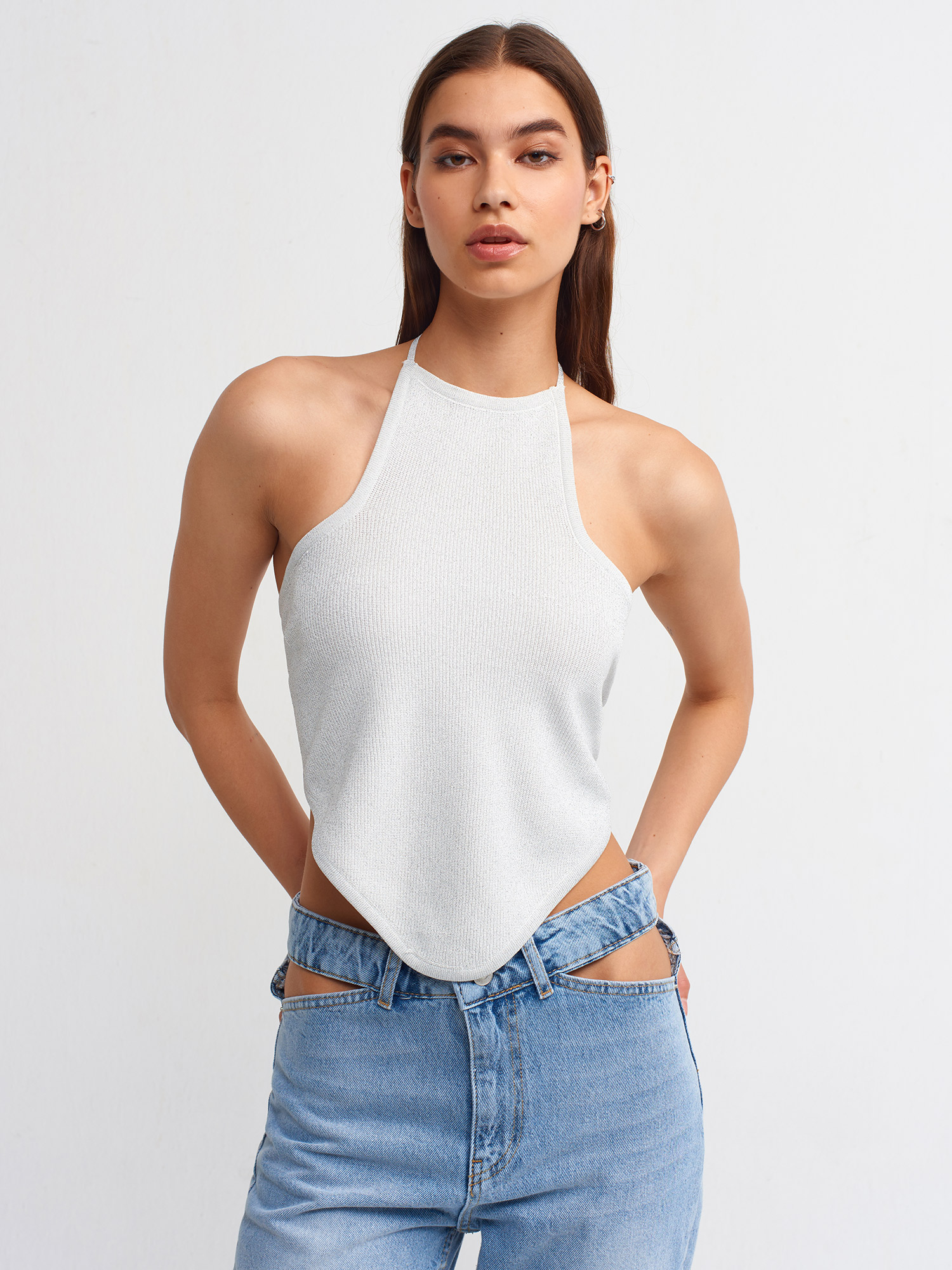 10405 Boyundan Bağcıklı Simli Triko Top-Ekru