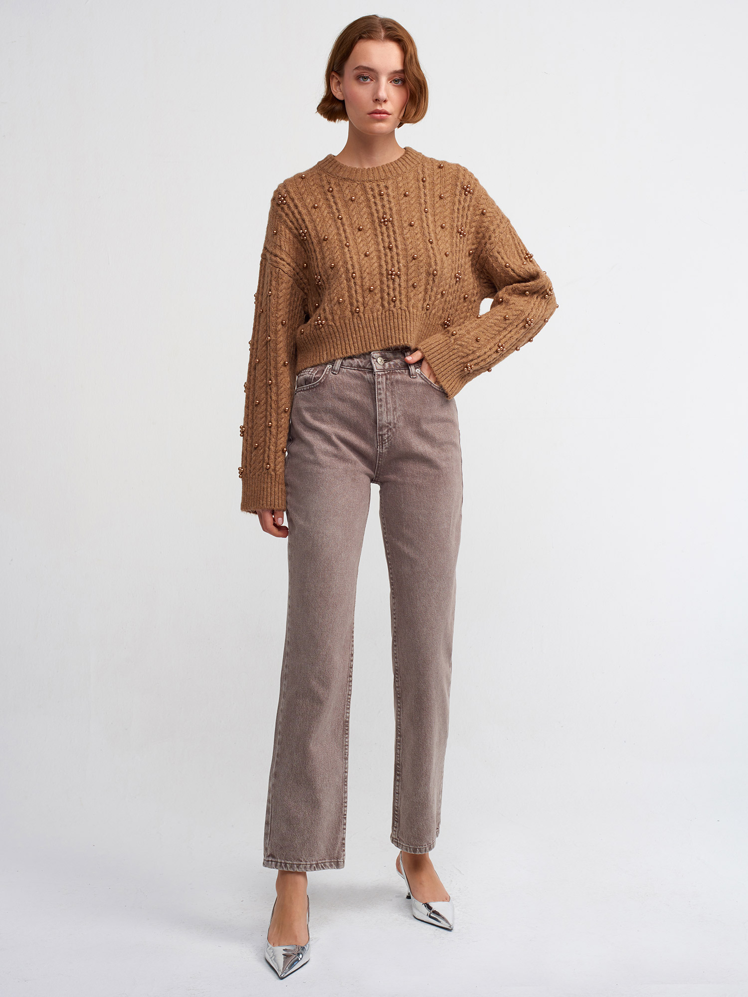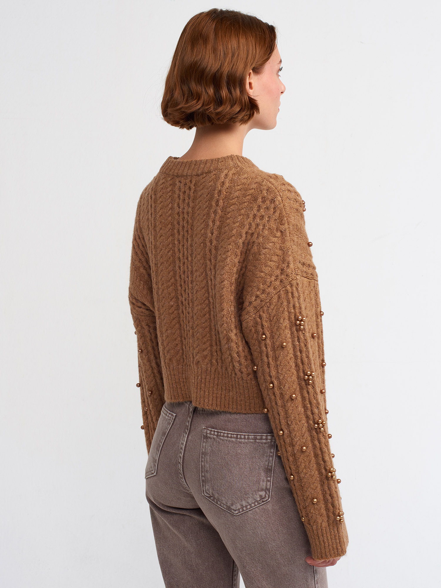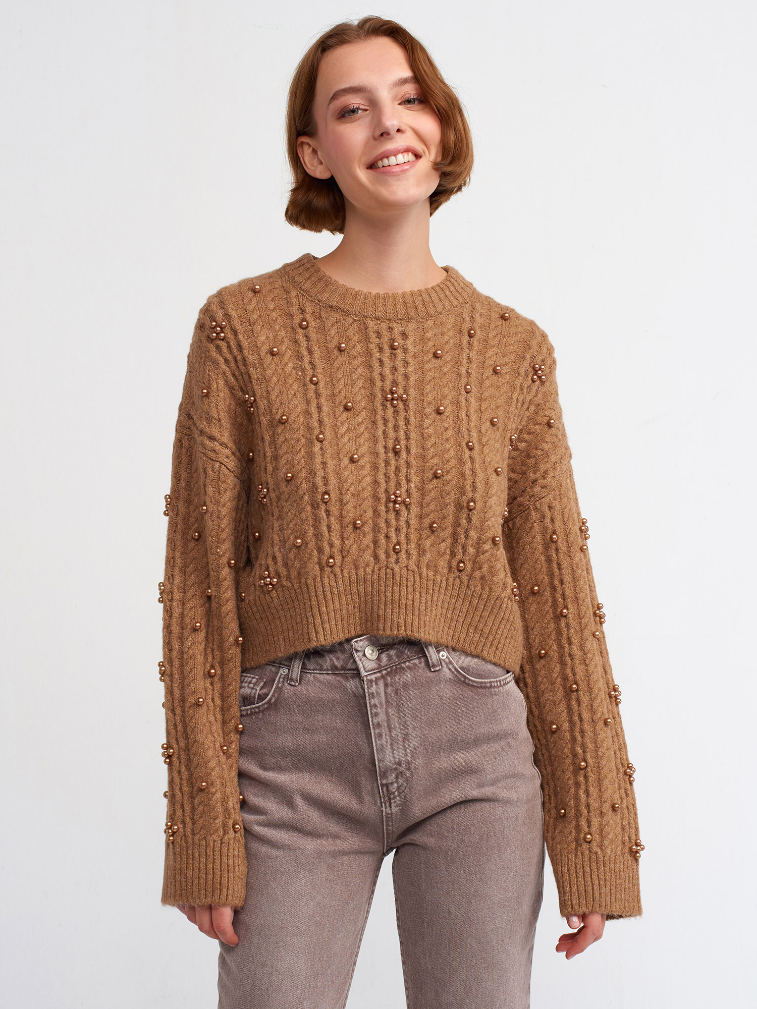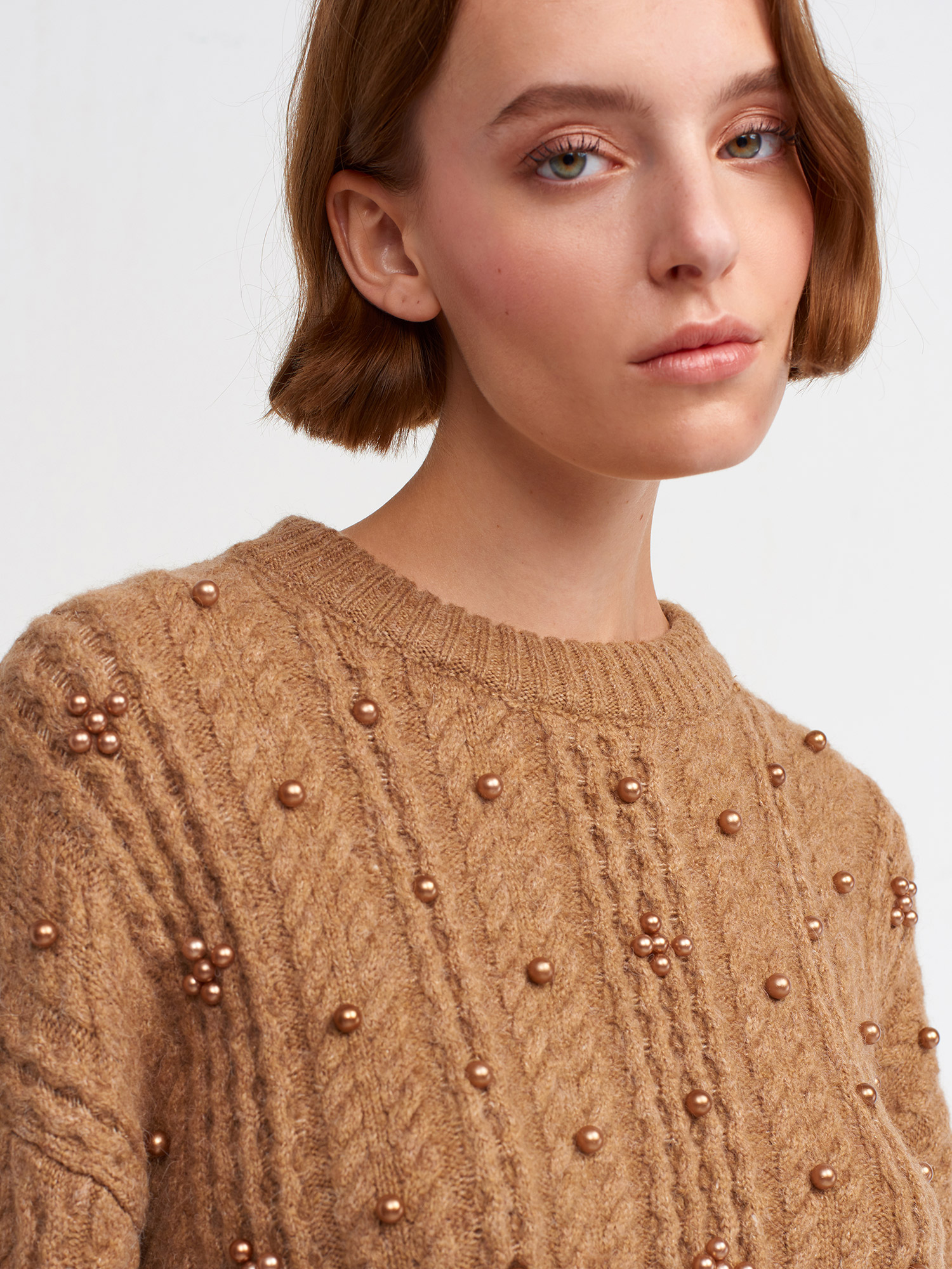 10448 Bisiklet Yaka İnci Çakımlı Kazak-Camel