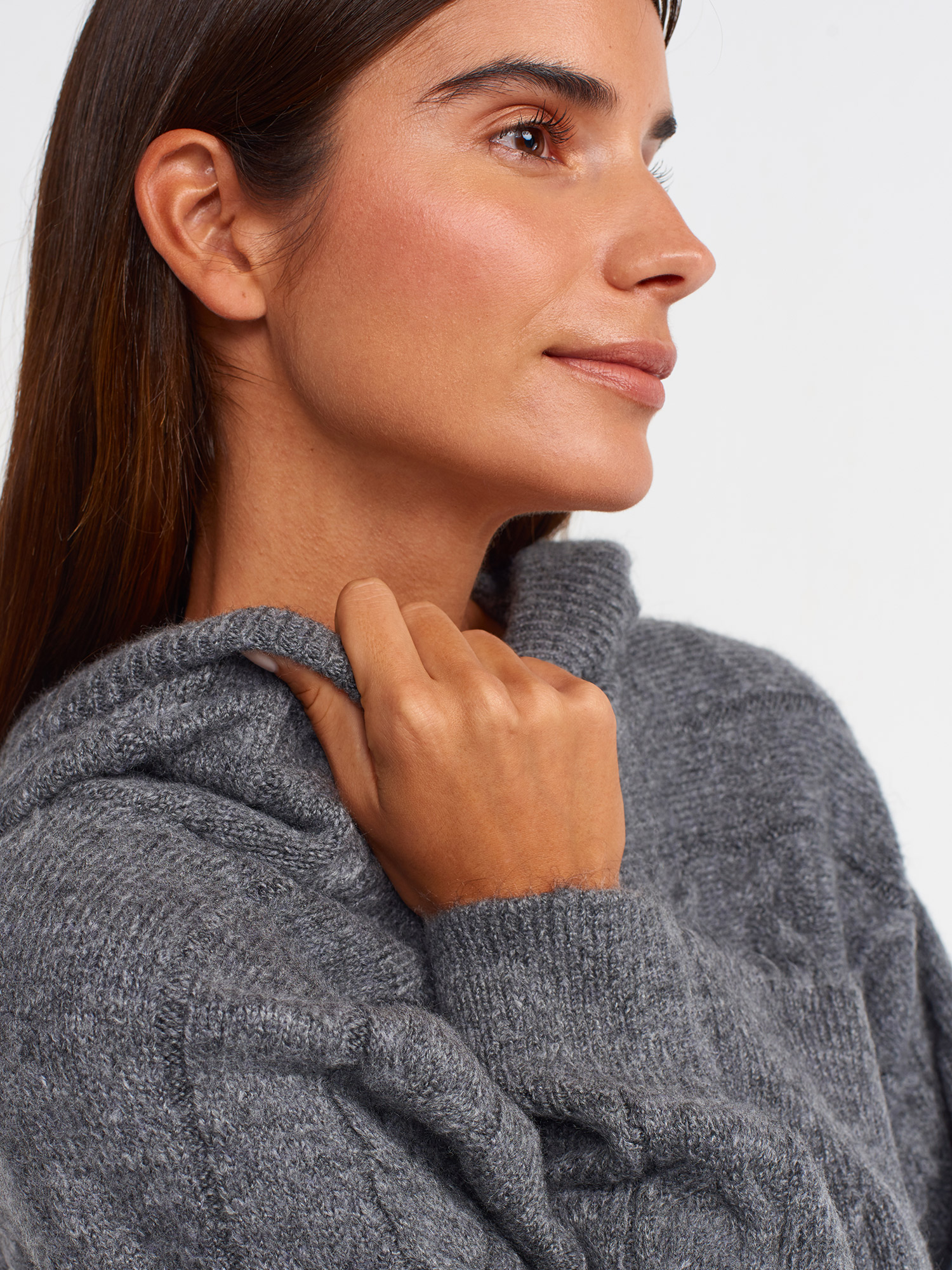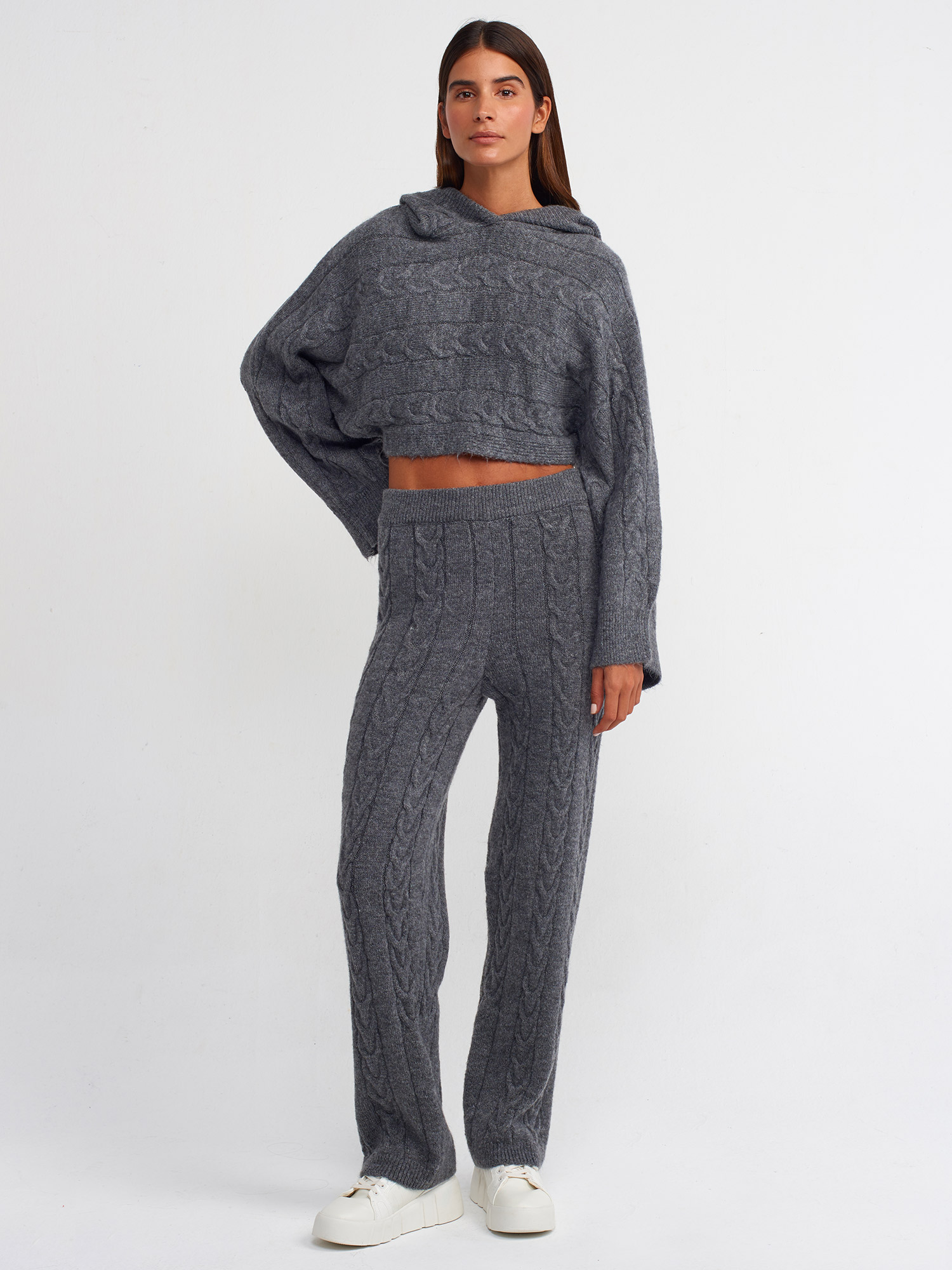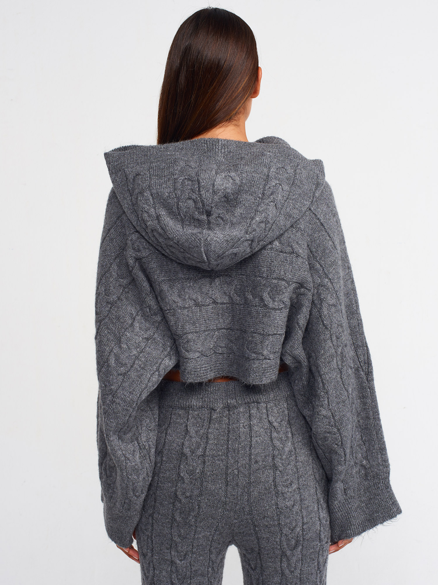 10459 Kapşonlu Kimono Kol Saç Örgü Crop Kazak-Füme