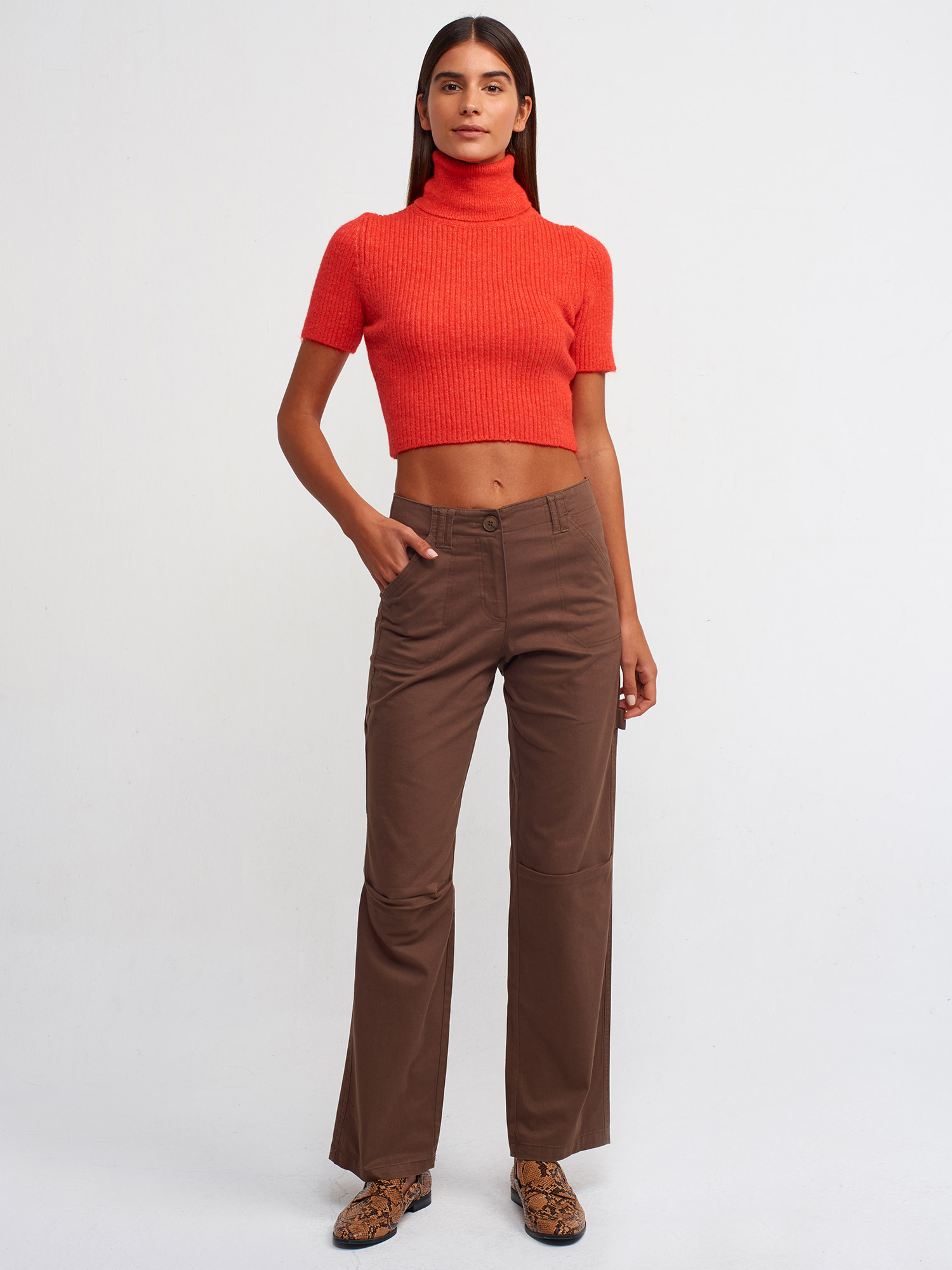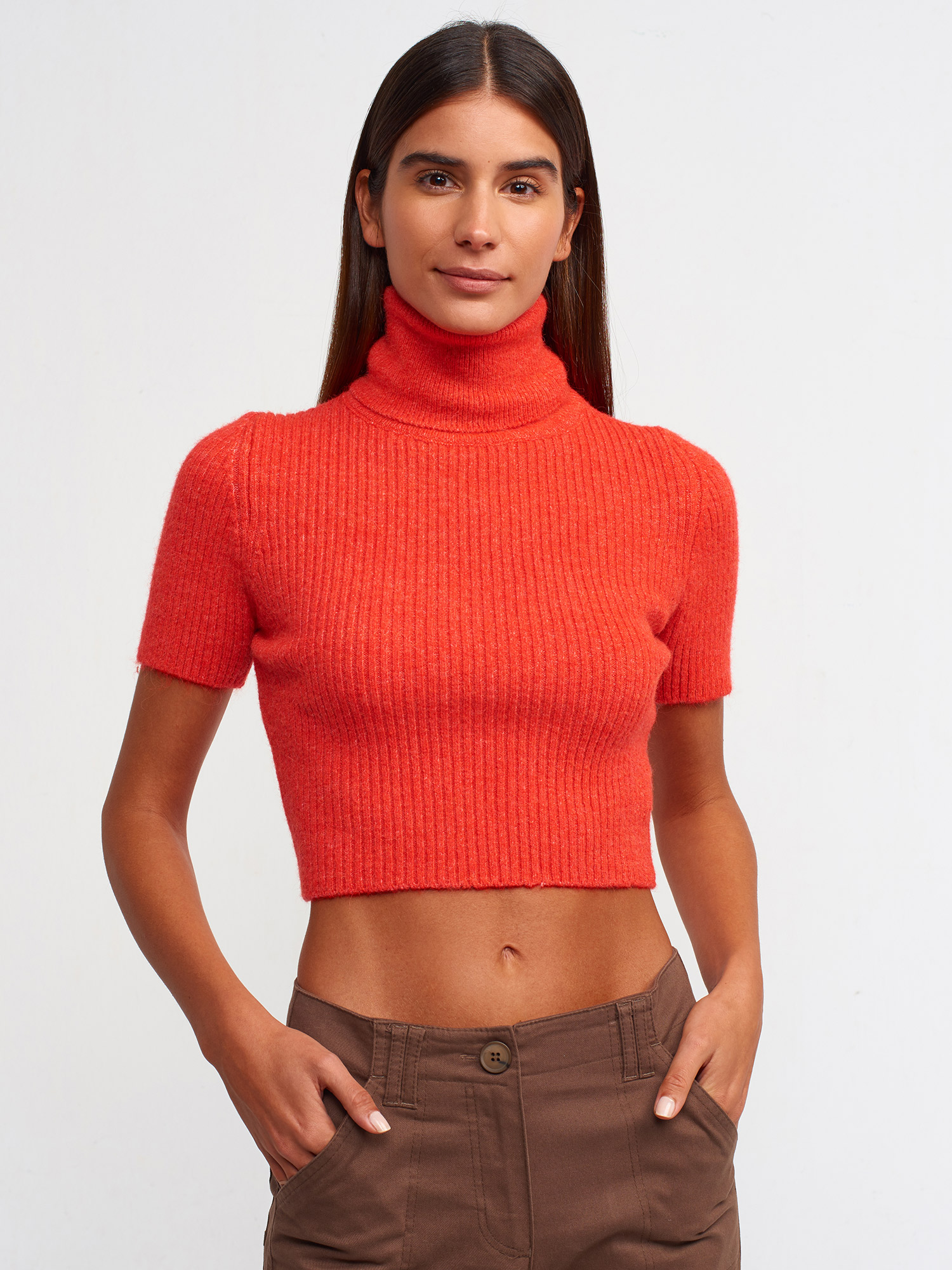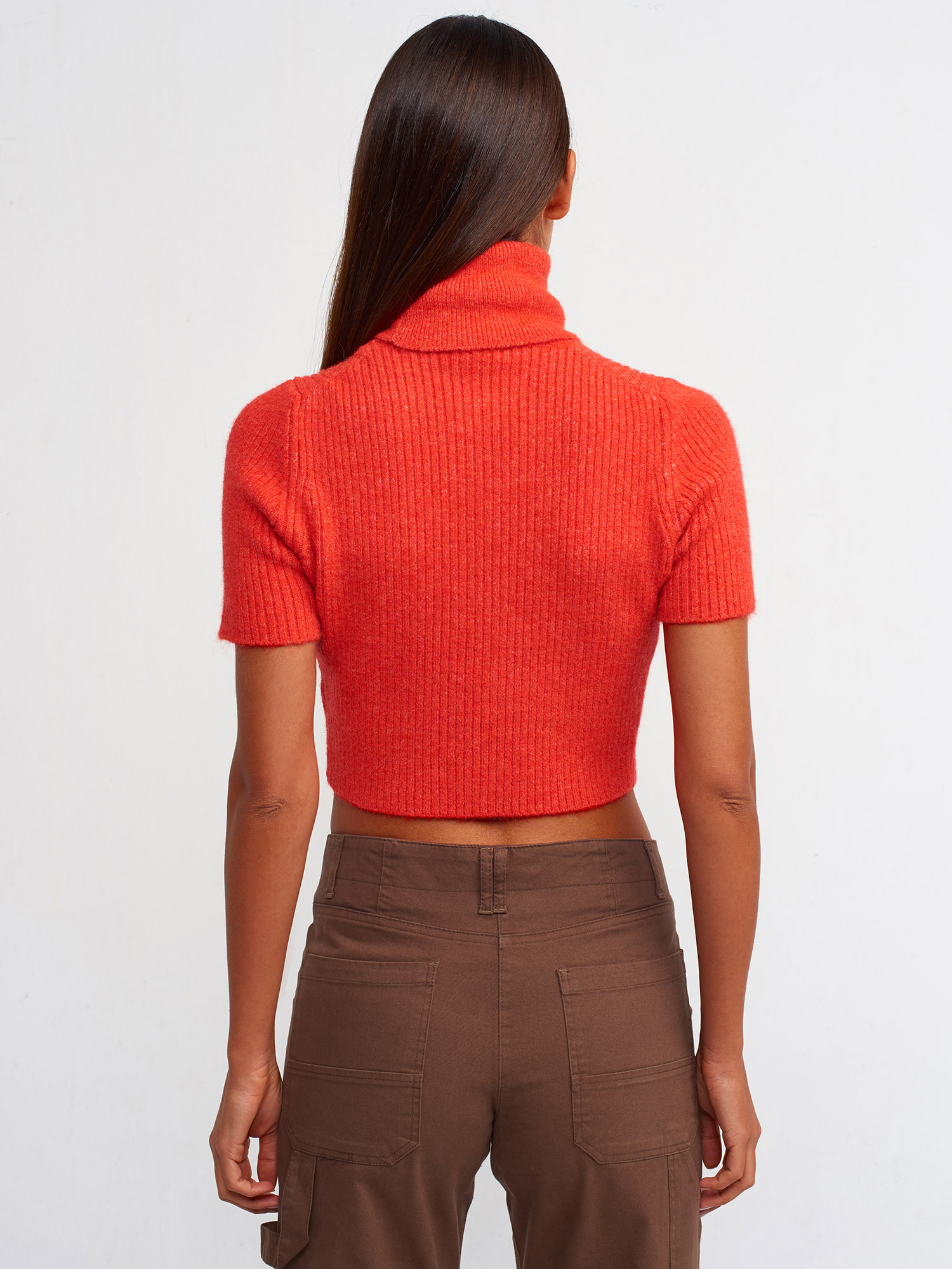 10487 Tam Balıkçı Yaka Fitilli Kısa Kollu Crop Kazak-Kırmızı