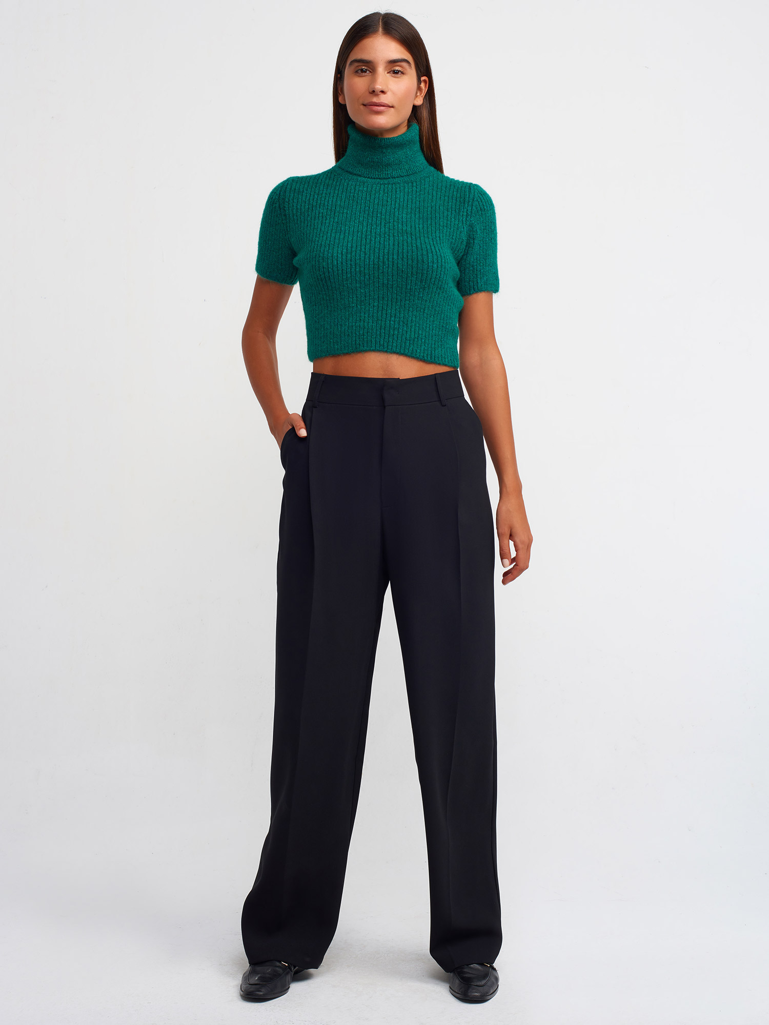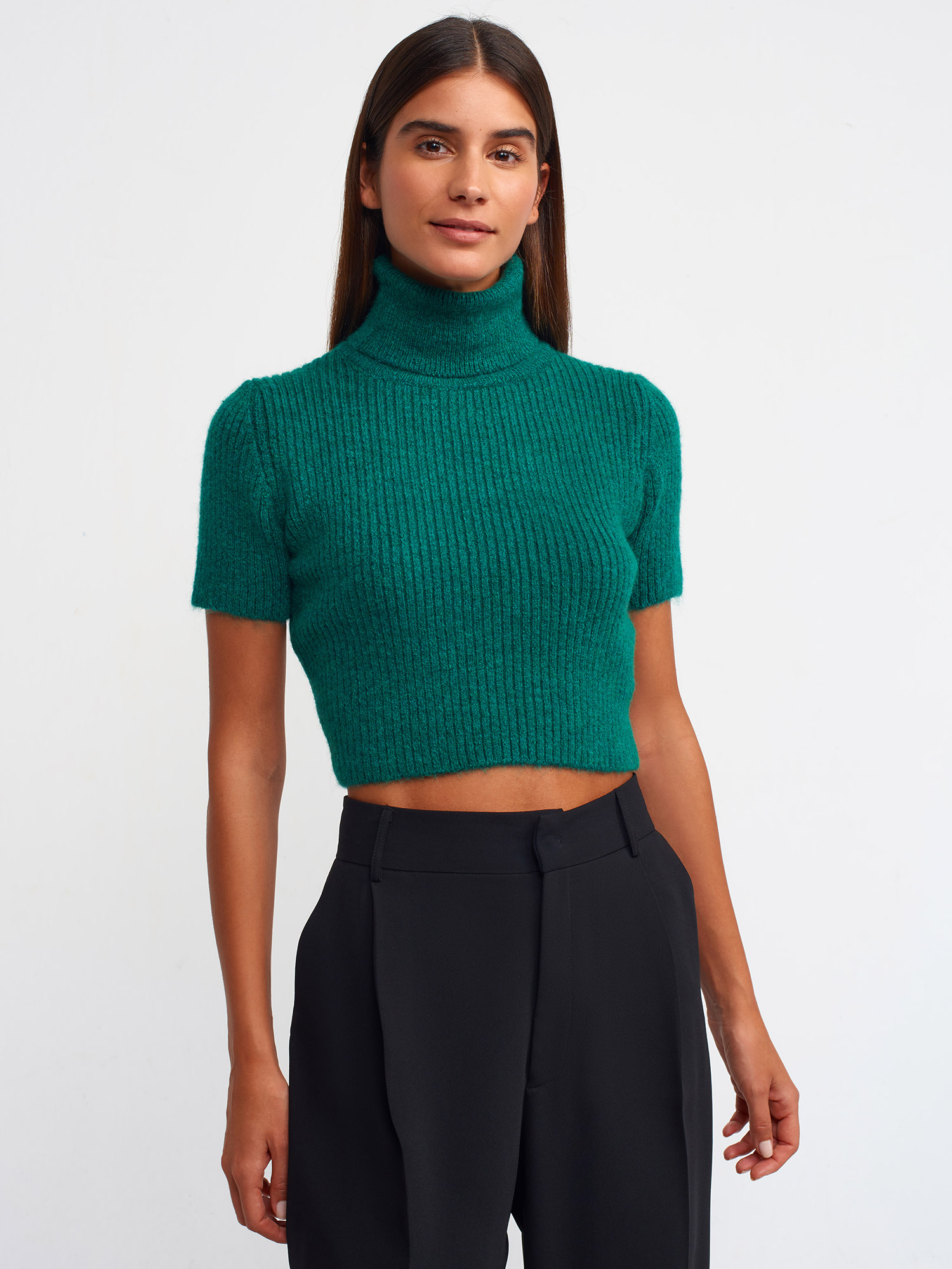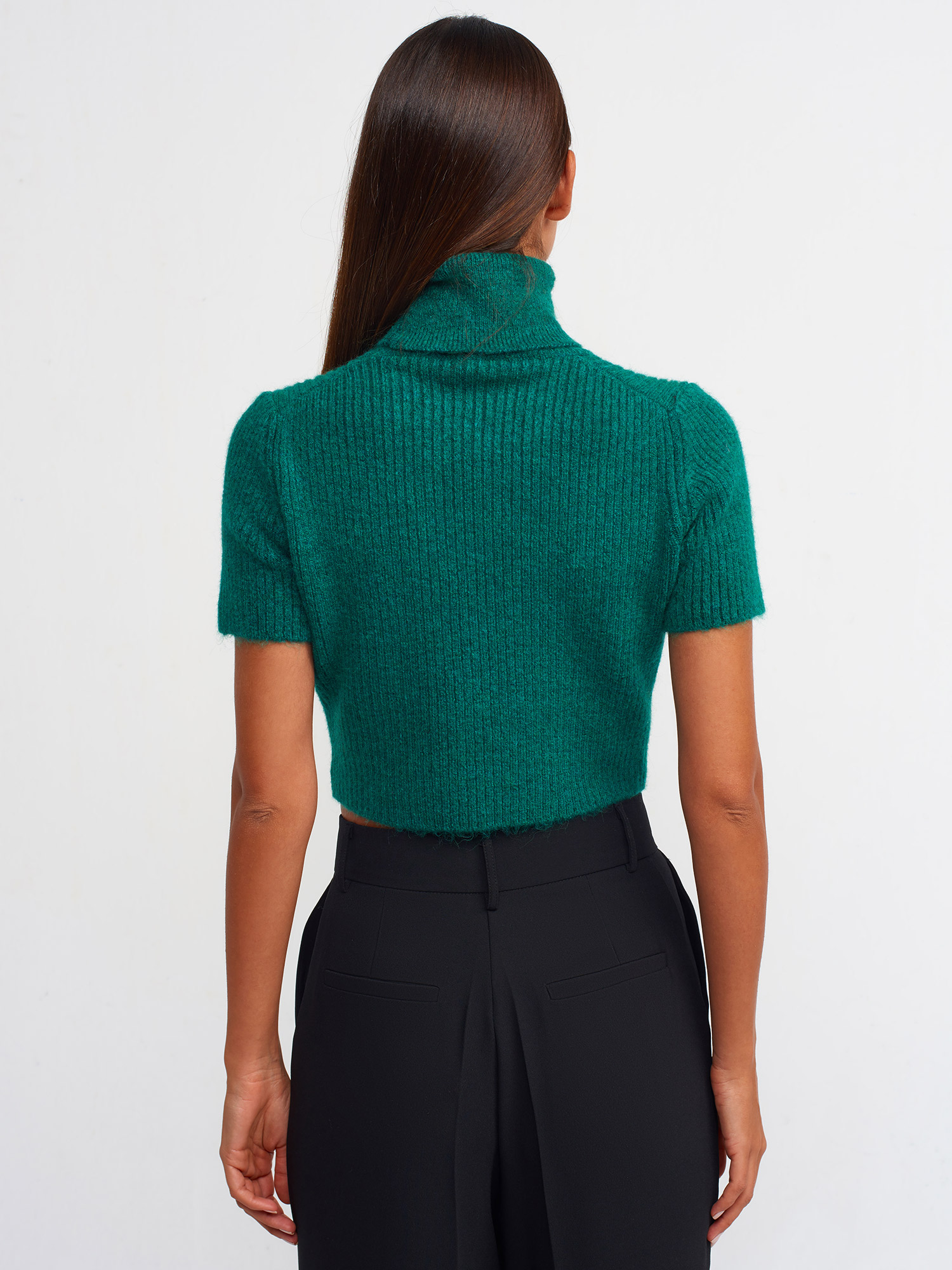10487 Tam Balıkçı Yaka Fitilli Kısa Kollu Crop Kazak-Zümrüt