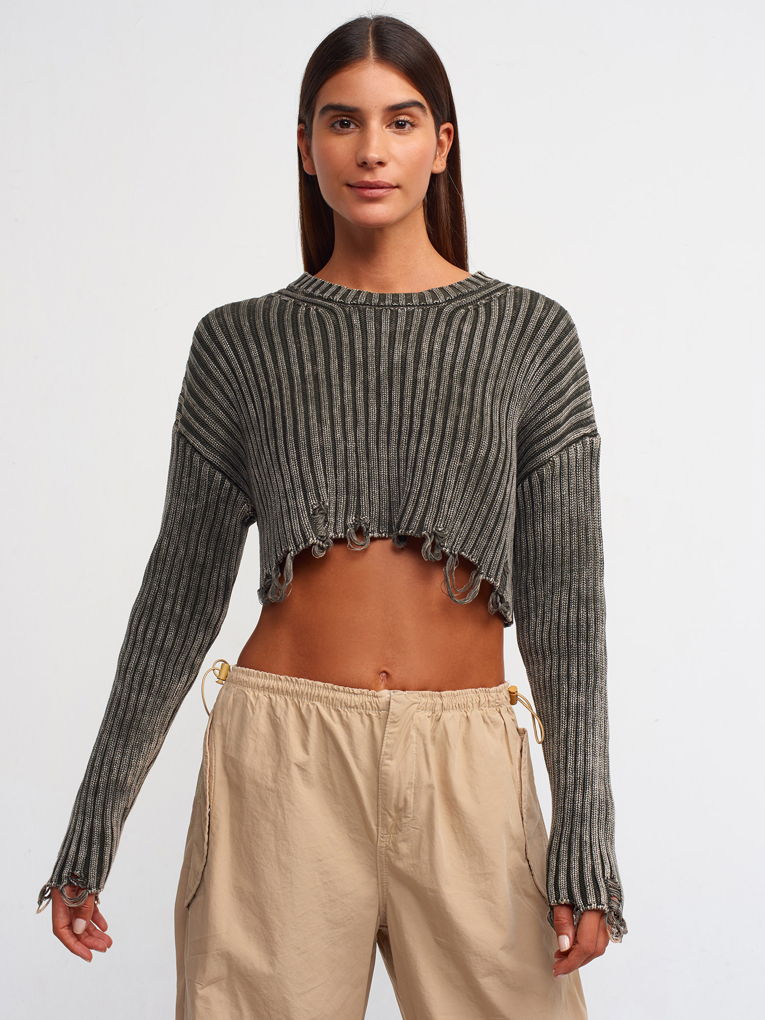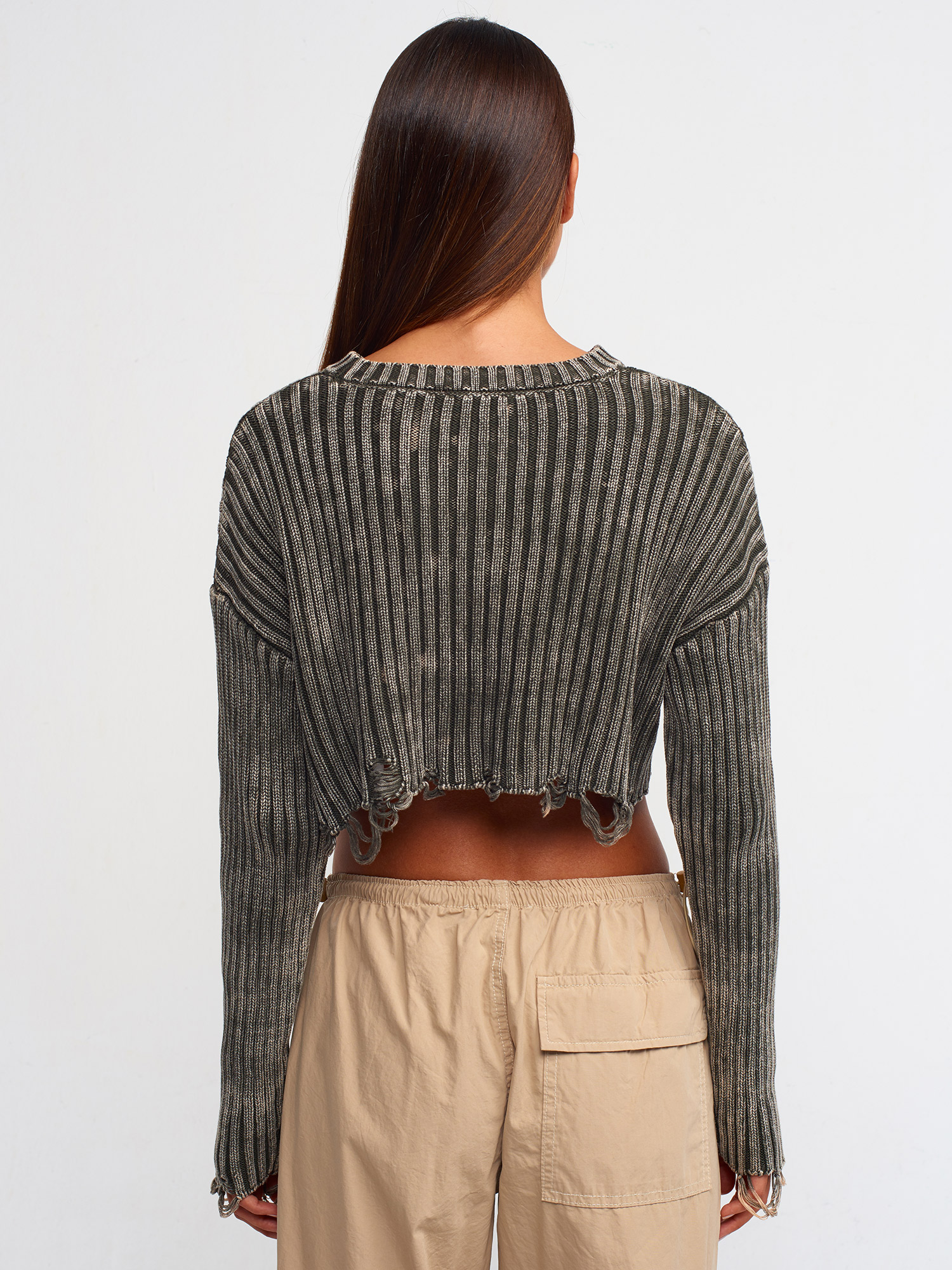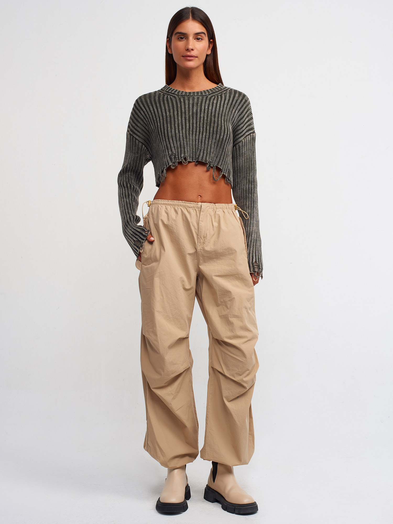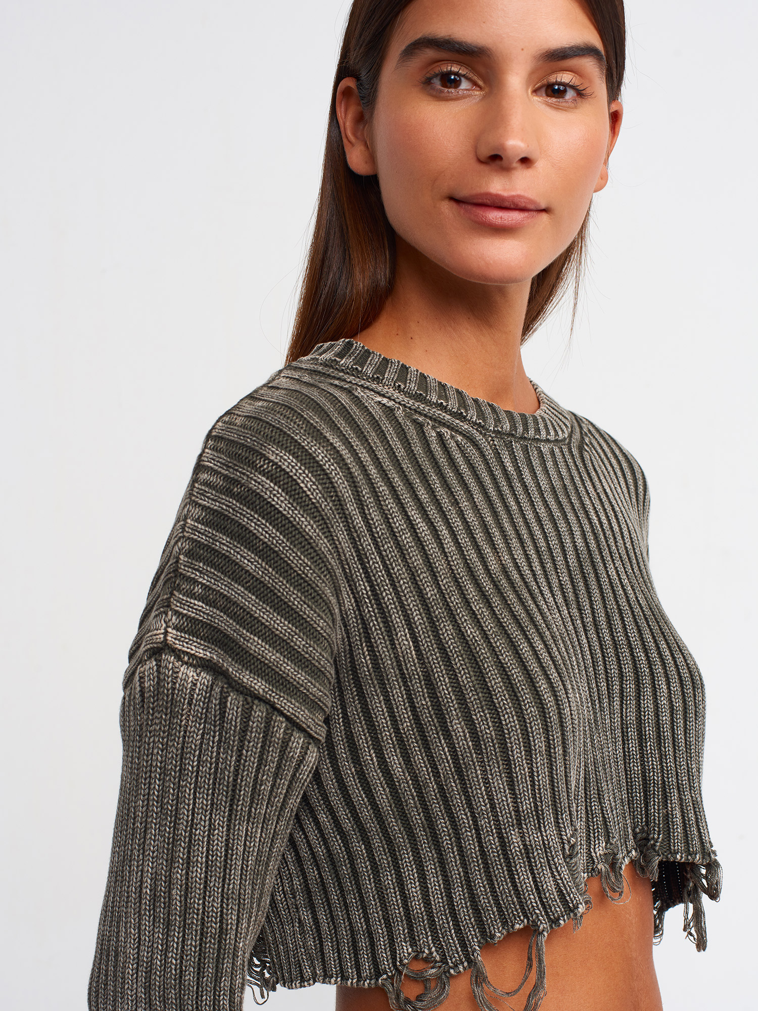 10488 Soluk Efektli Bisiklet Yaka Yırtık Detaylı Crop Kazak-Bej