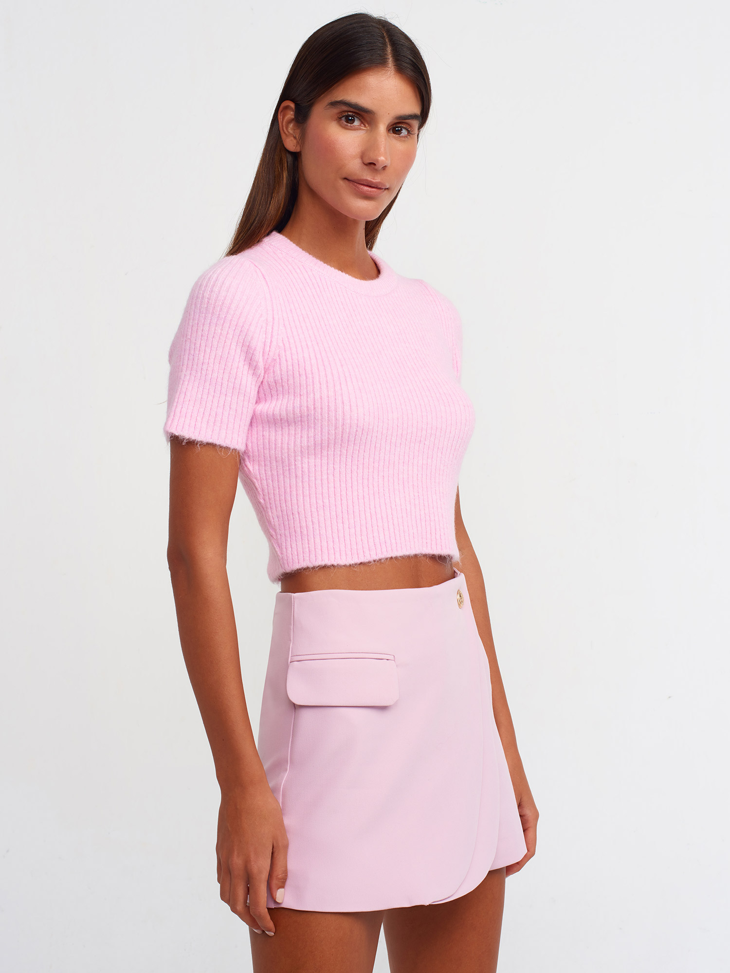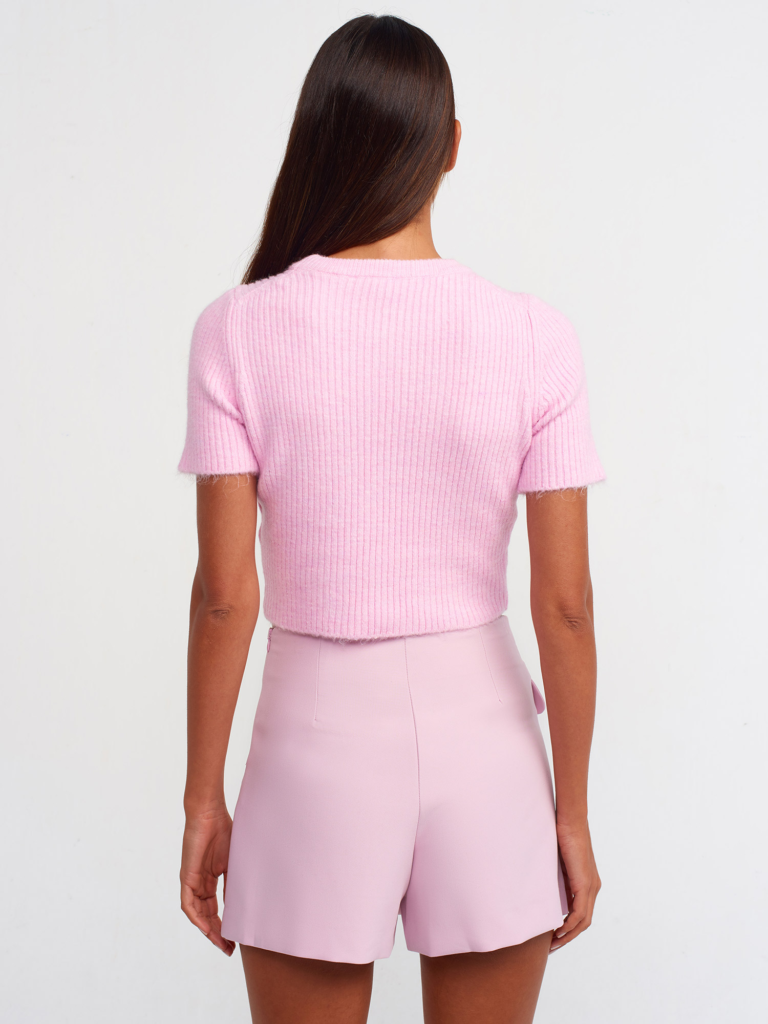 10490 Bisiklet Yaka Fitilli Kısa Kollu Crop Kazak-Pembe