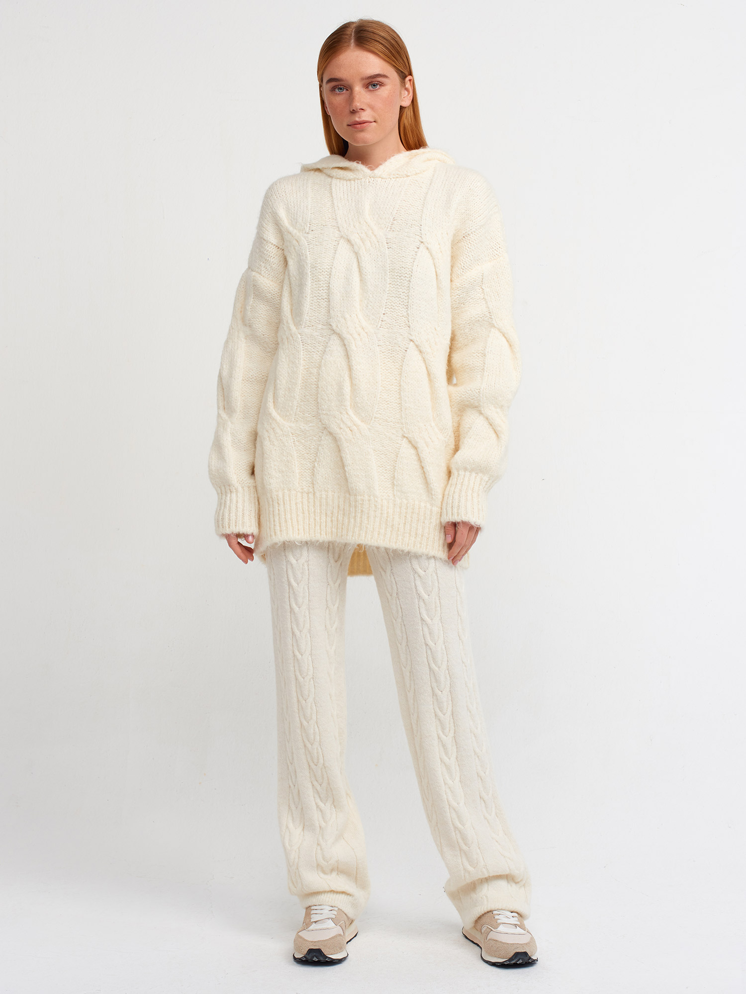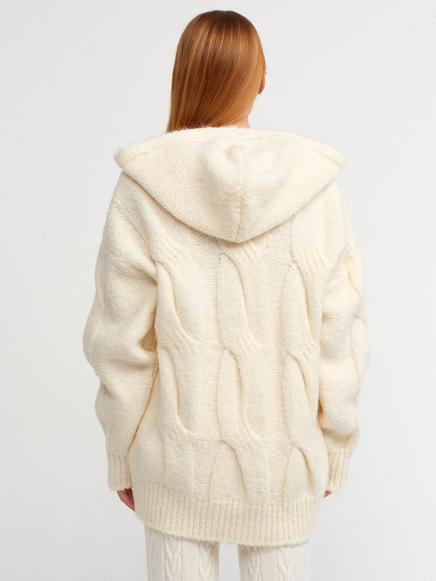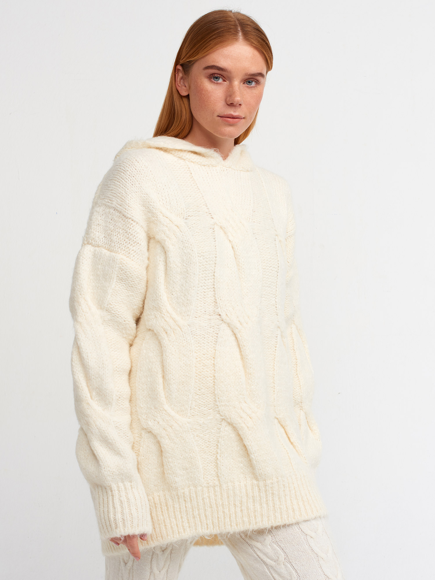 10496 Kapüşonlu Saç Örgü Oversize Kazak-Ekru