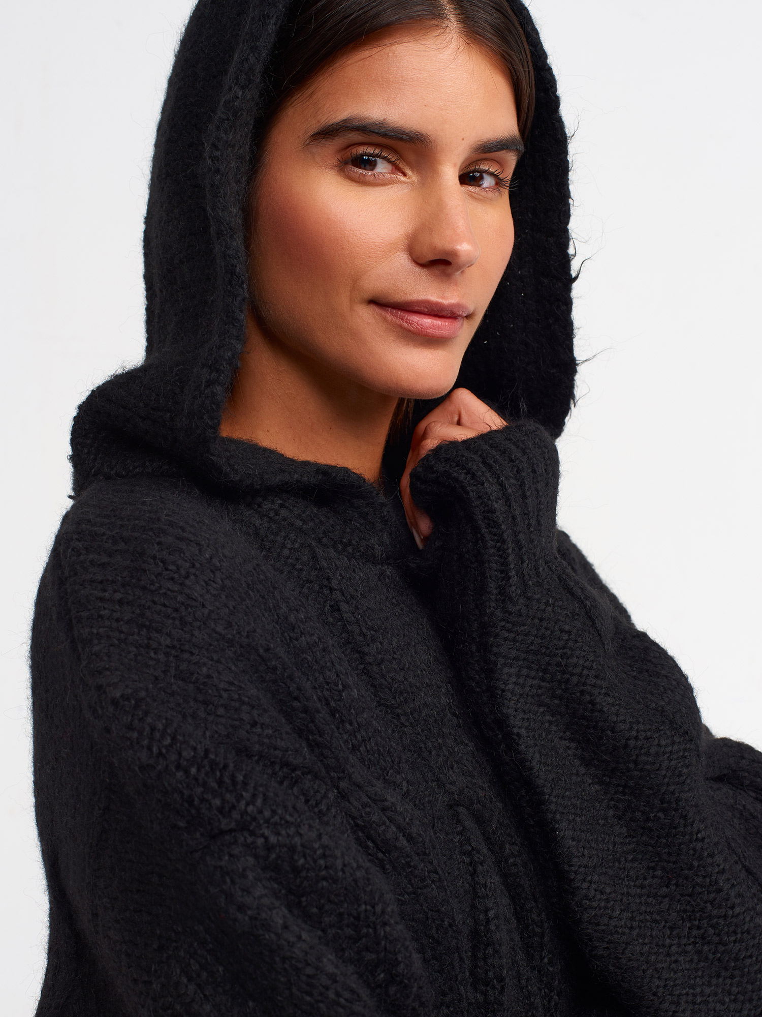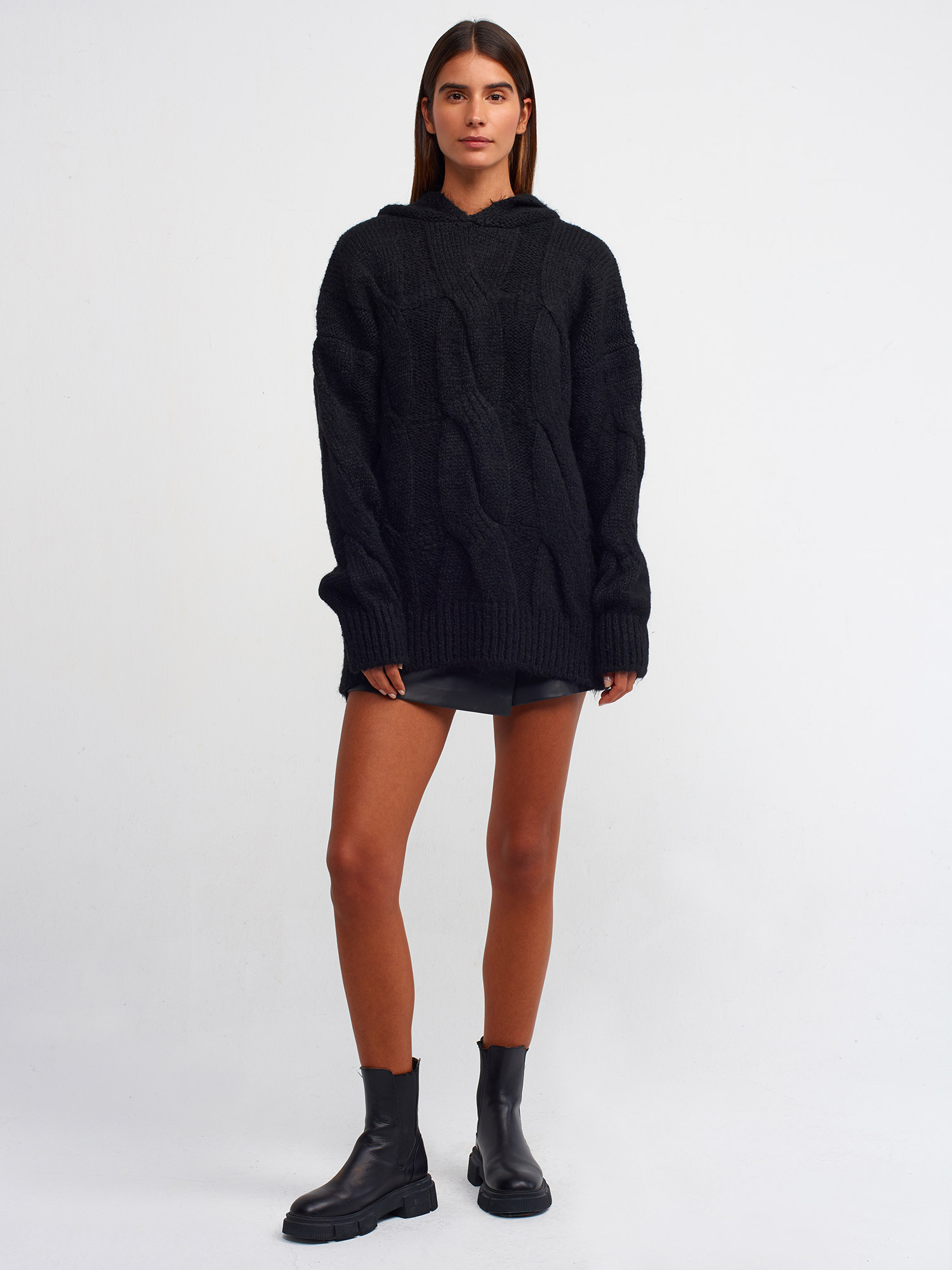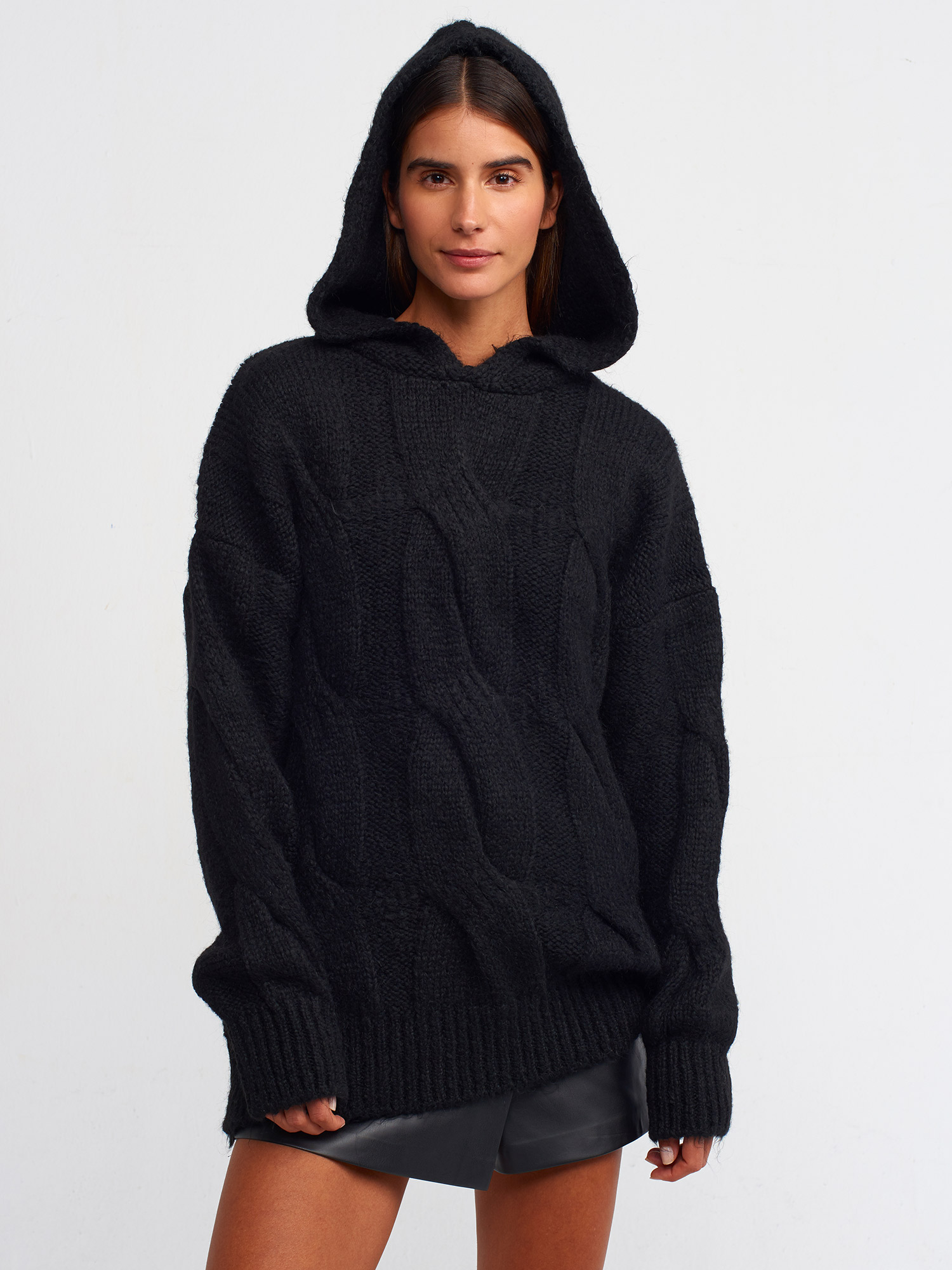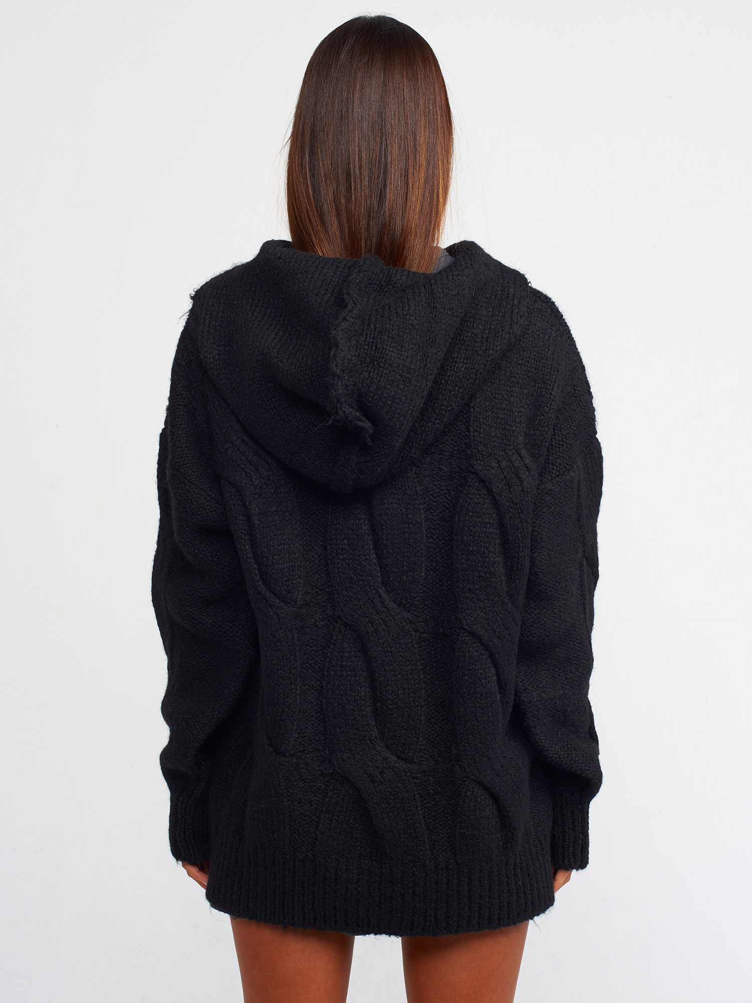 10496 Kapüşonlu Saç Örgü Oversize Kazak-Siyah