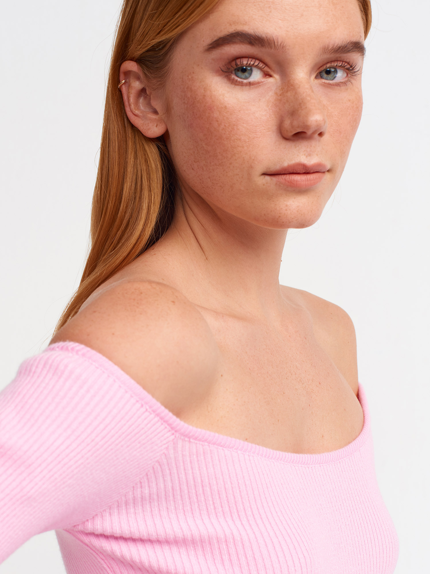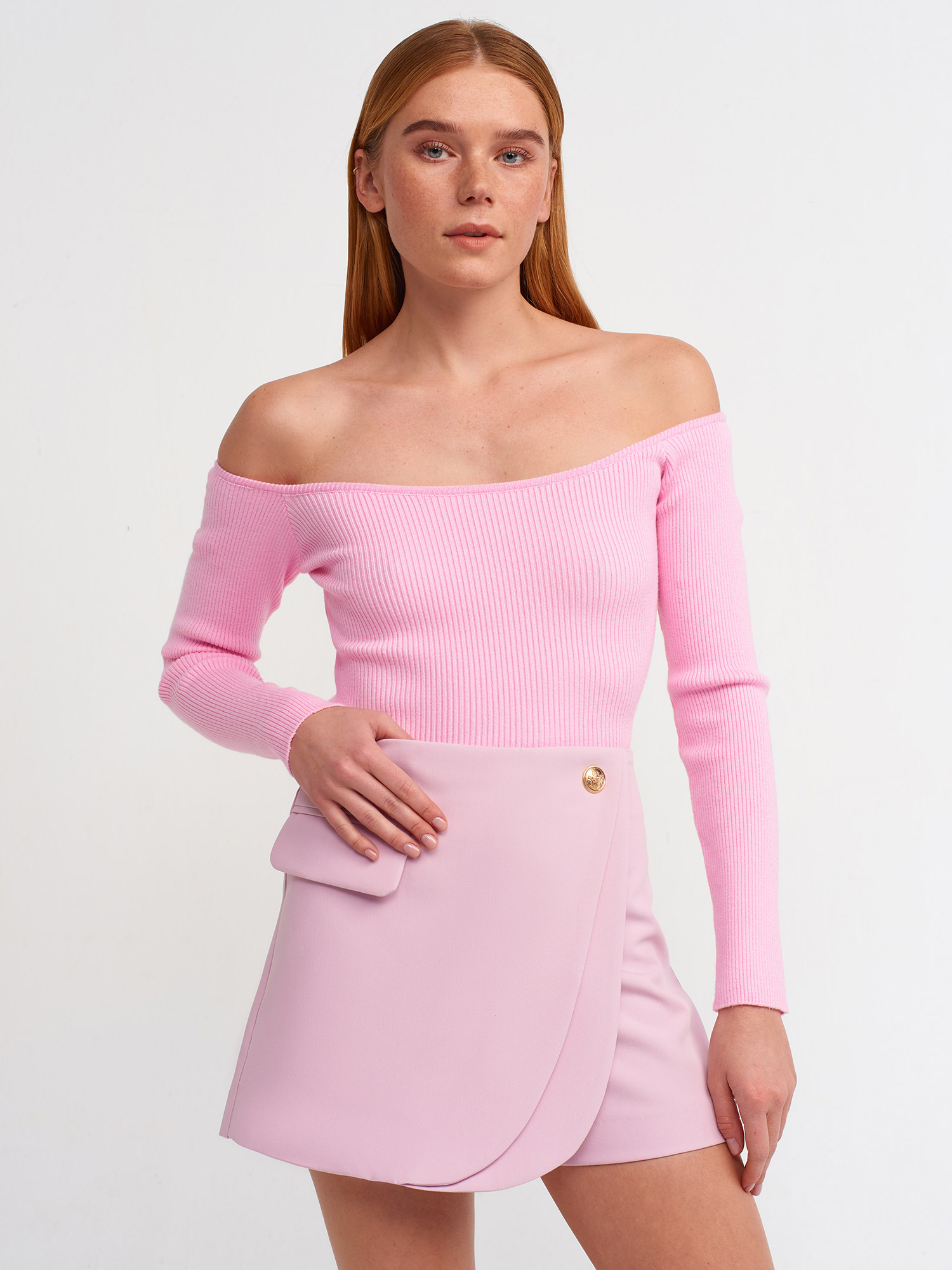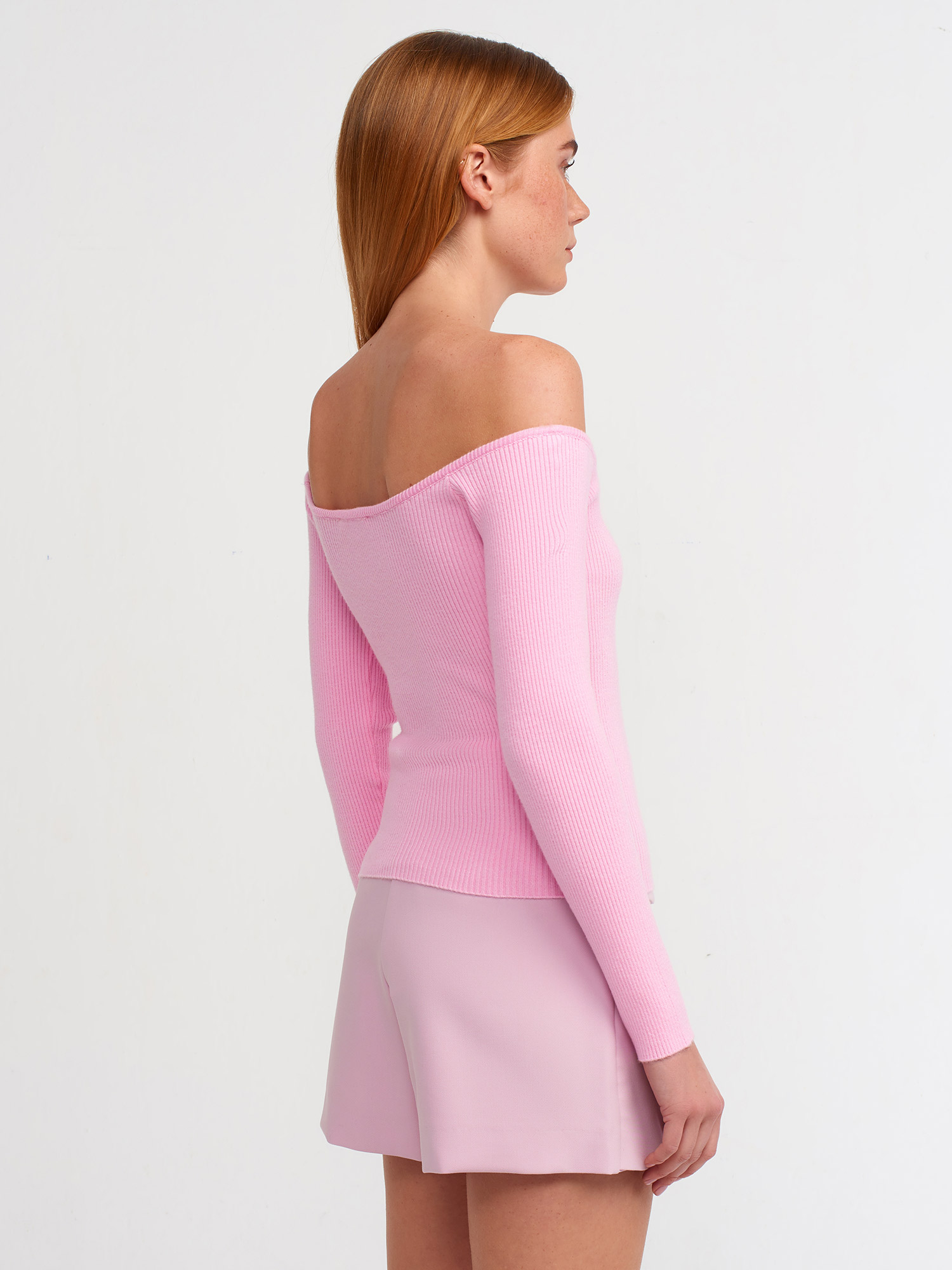 10503 Bardot Yaka Fitilli Crop Kazak-Pembe