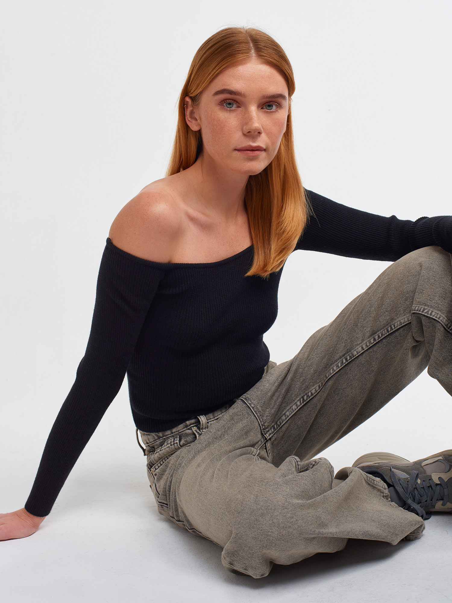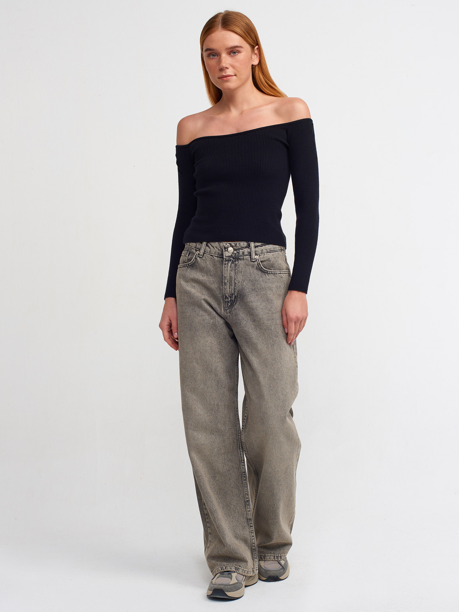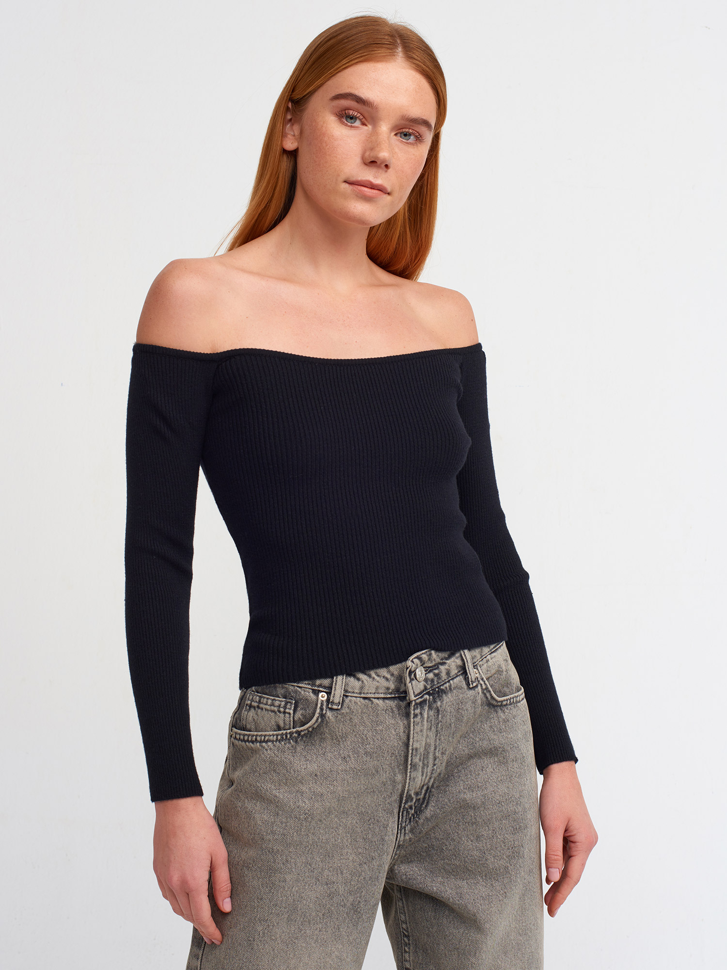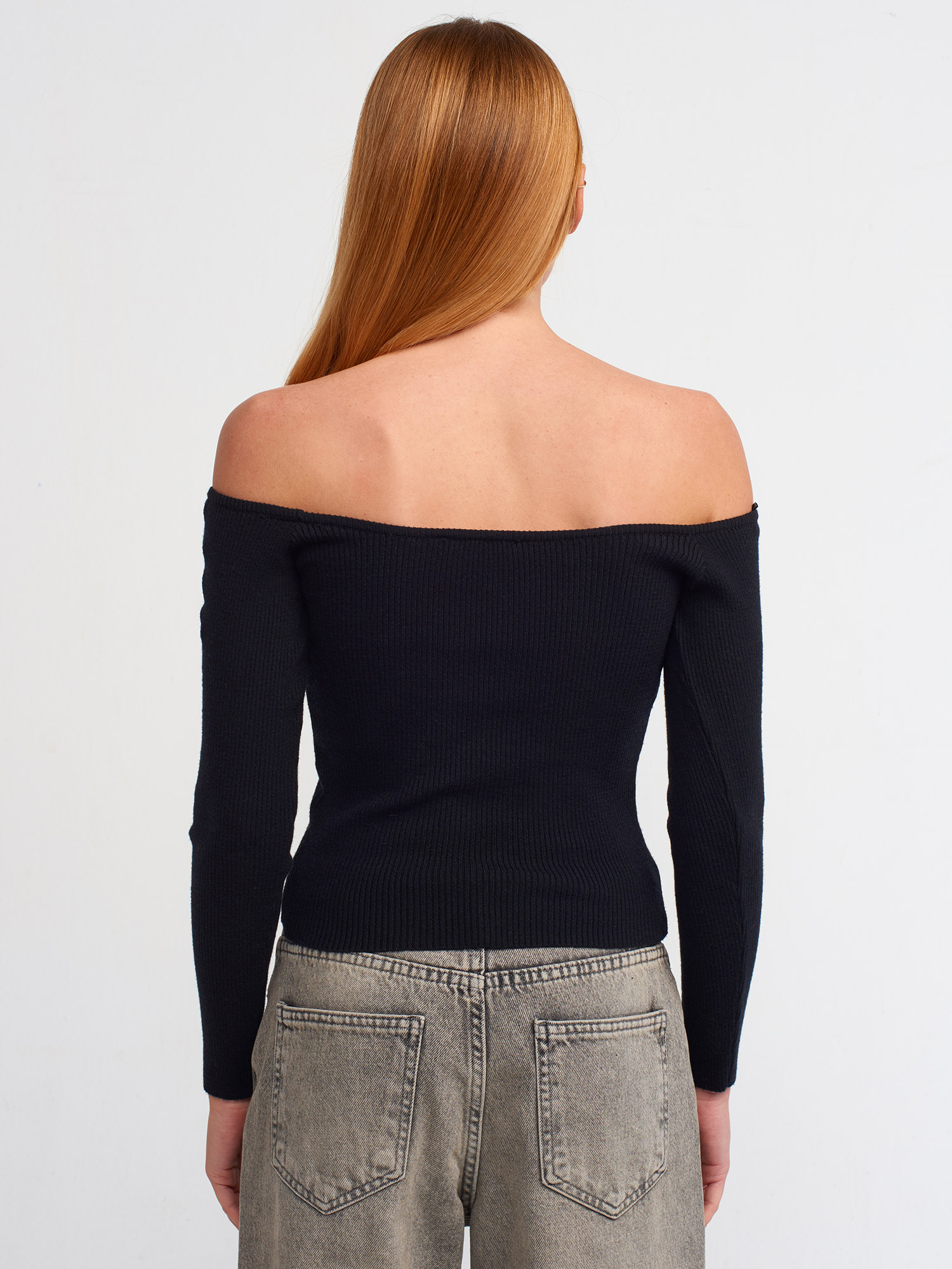 10503 Bardot Yaka Fitilli Crop Kazak-Siyah