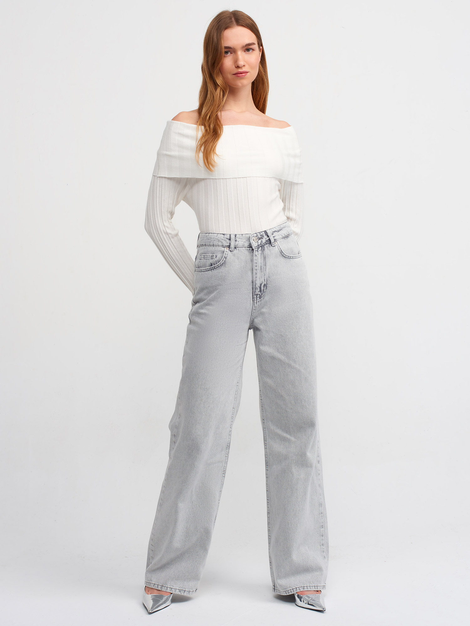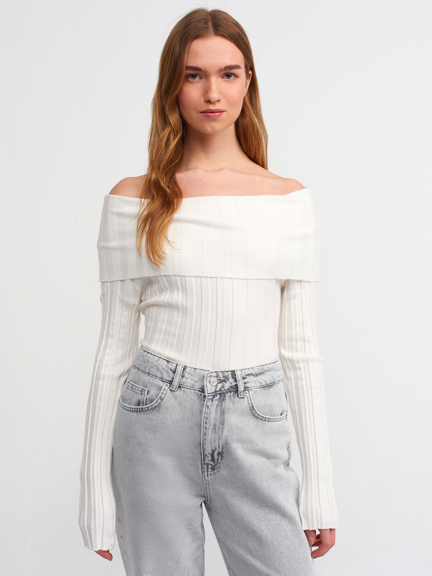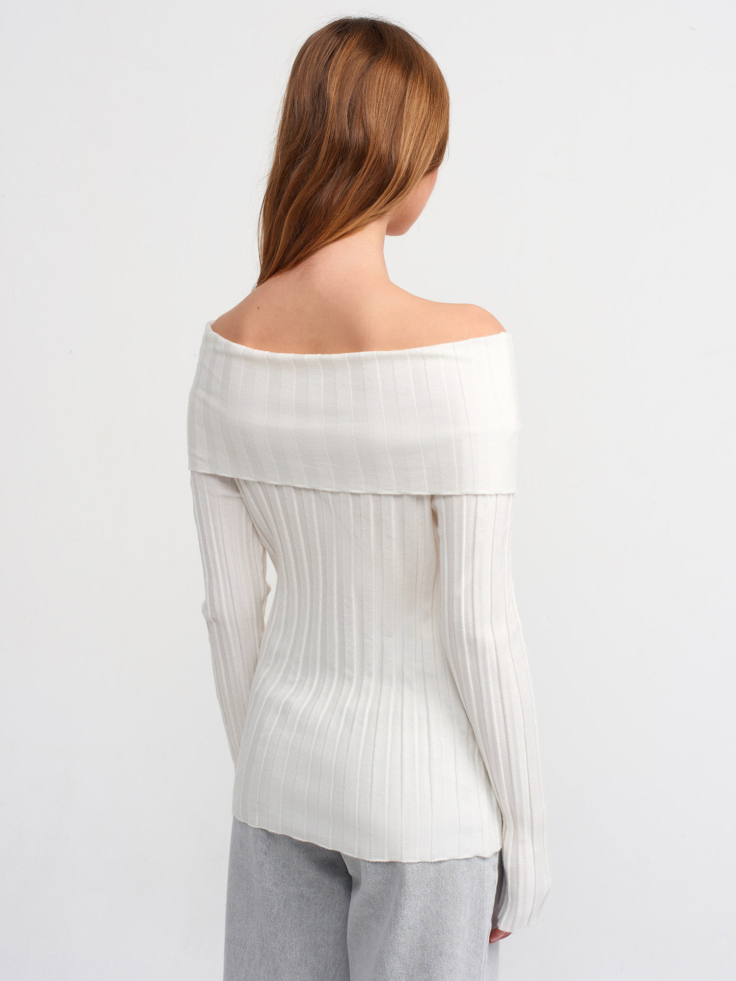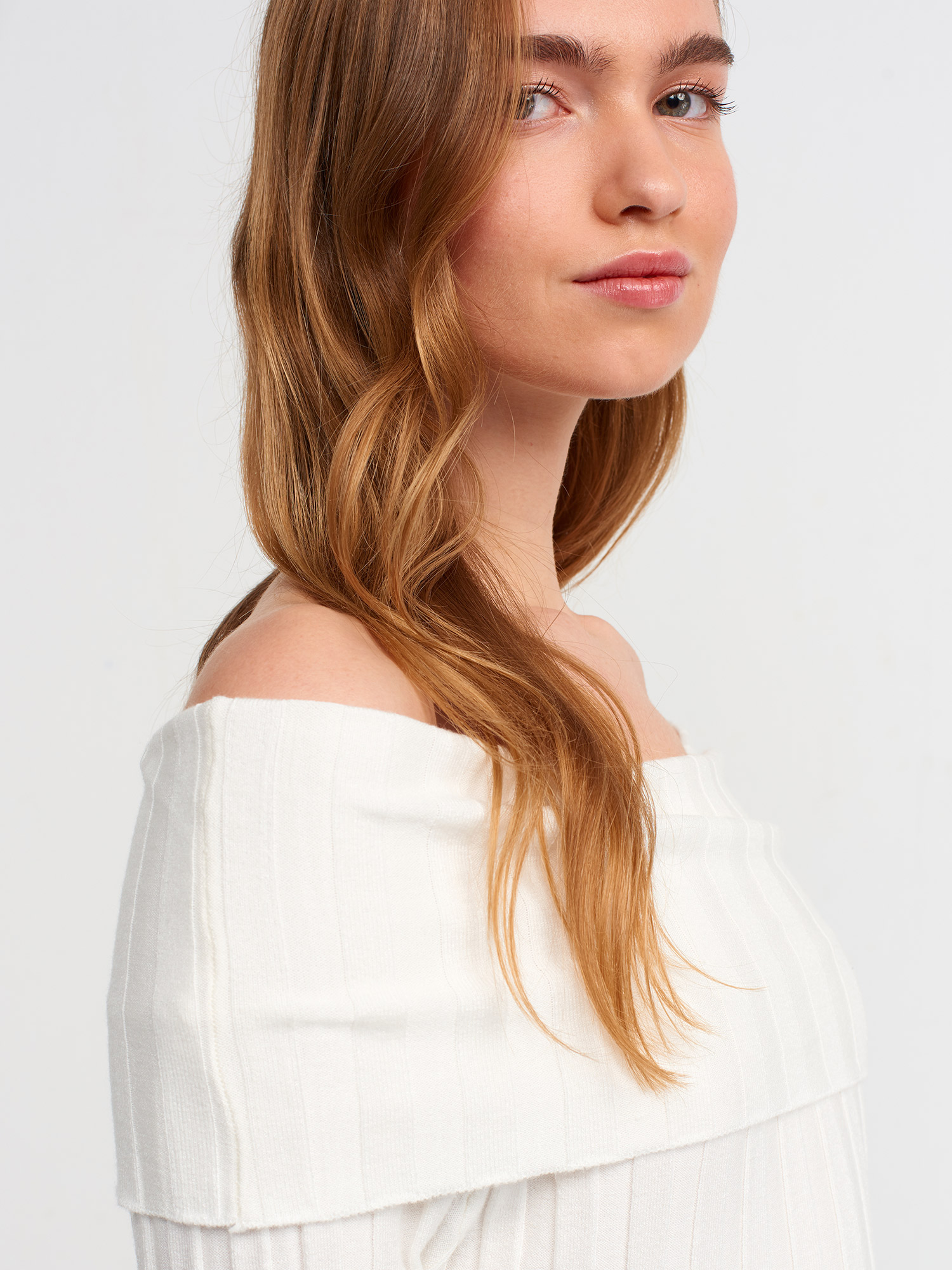 10517 Bardot Yaka Fitilli Triko Kazak-Ekru