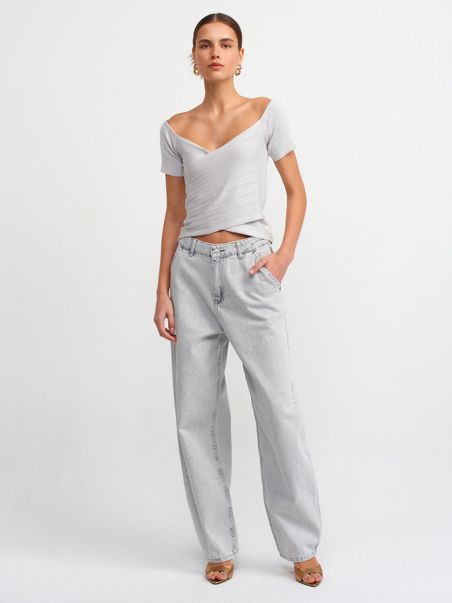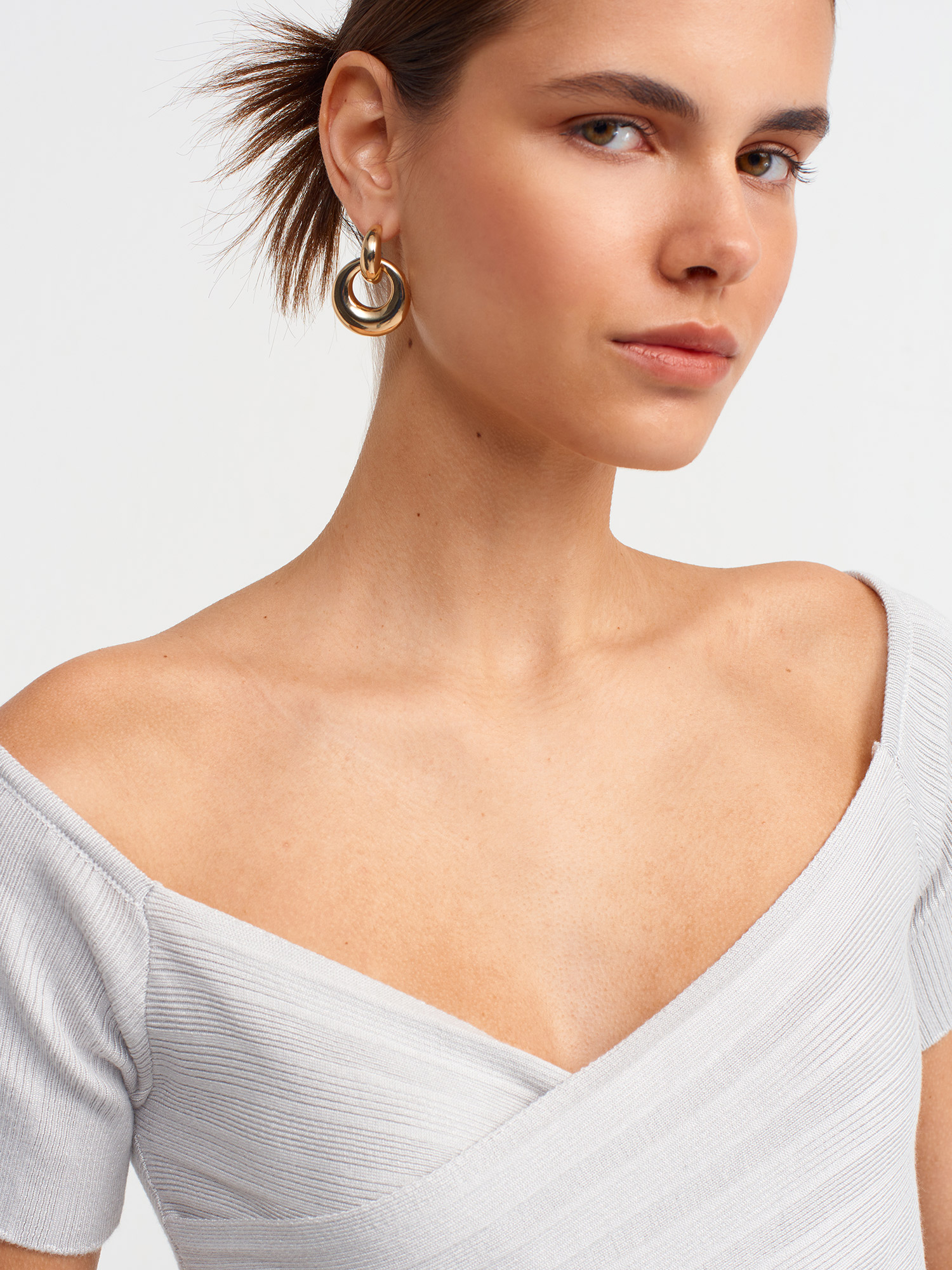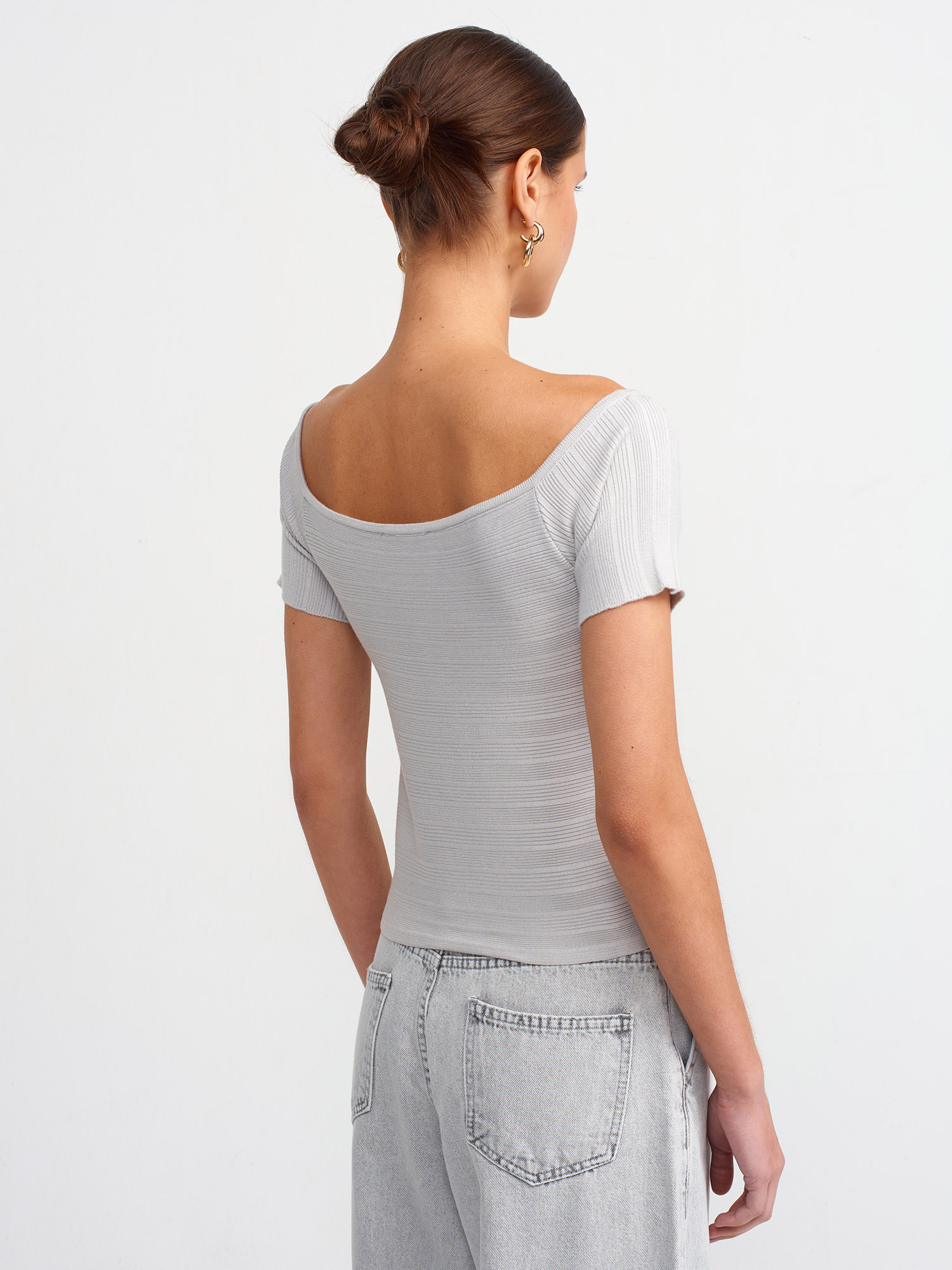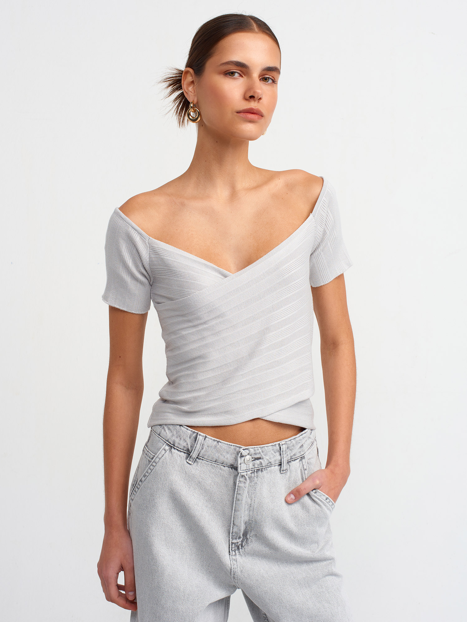 10528 Bardot Yaka Triko Bluz-Açık Gri
