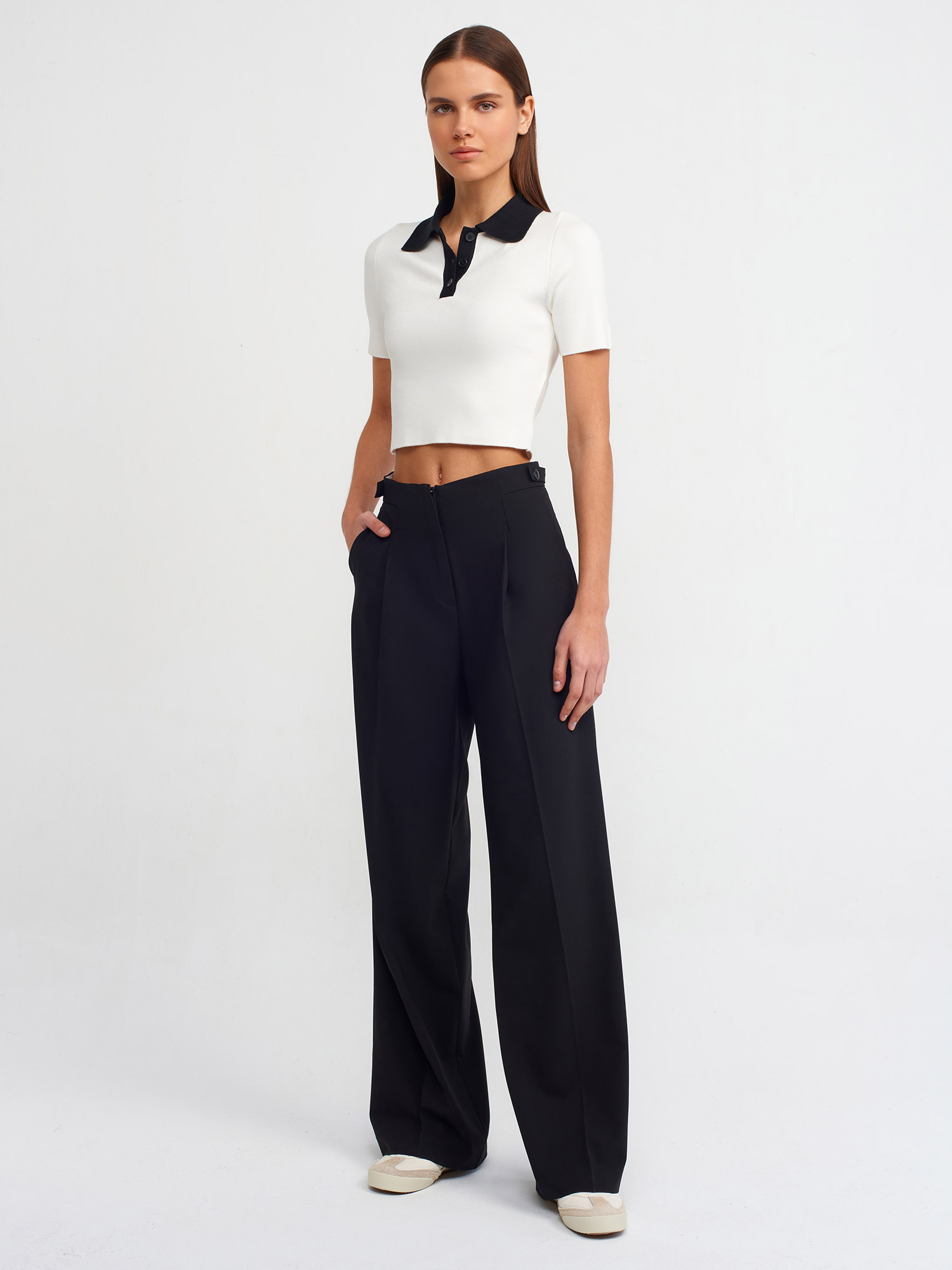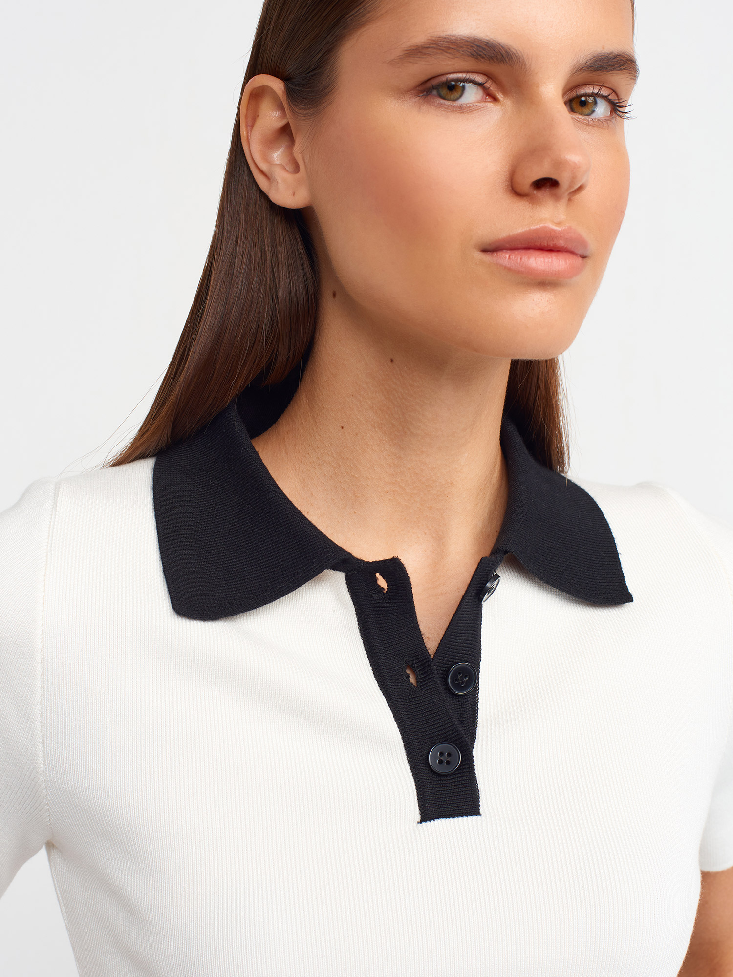 10535 Polo Yaka Düğmeli Triko Top-Ekru-Siyah