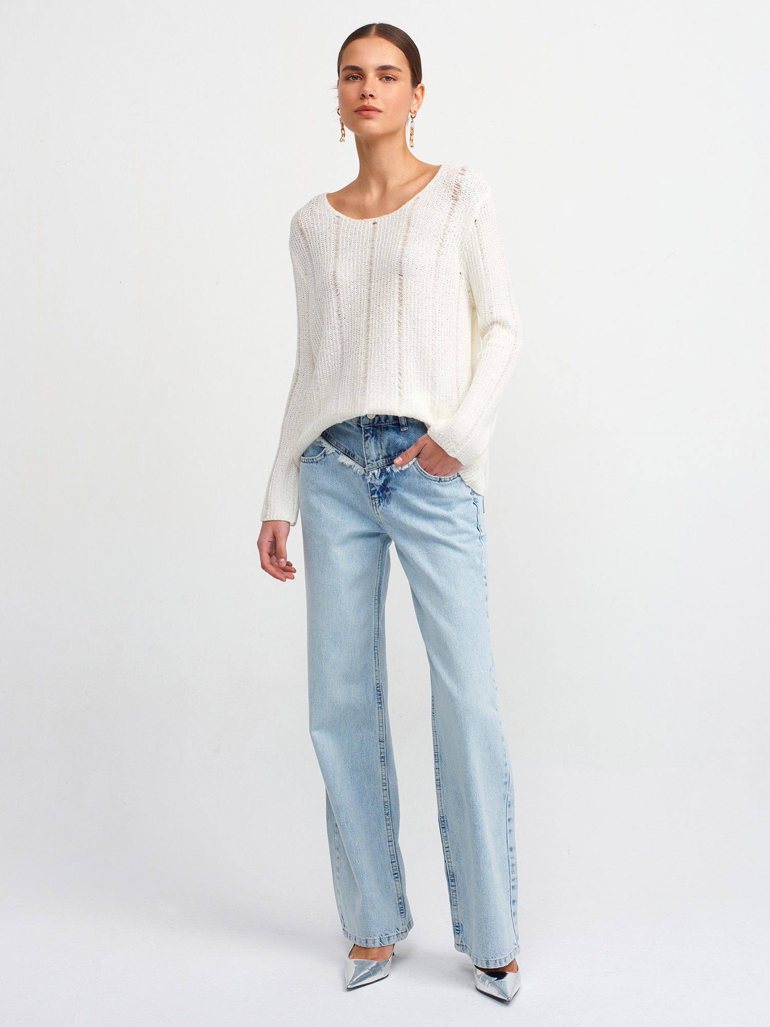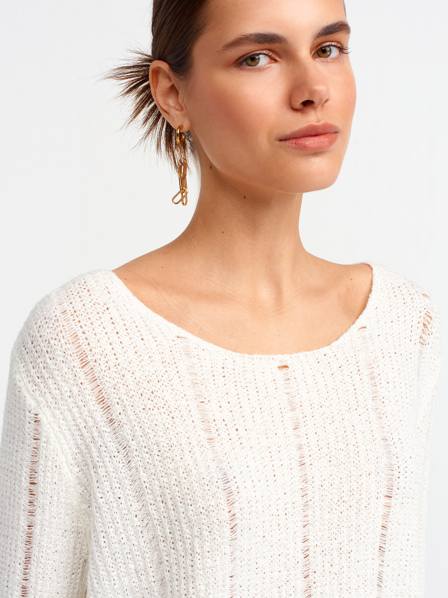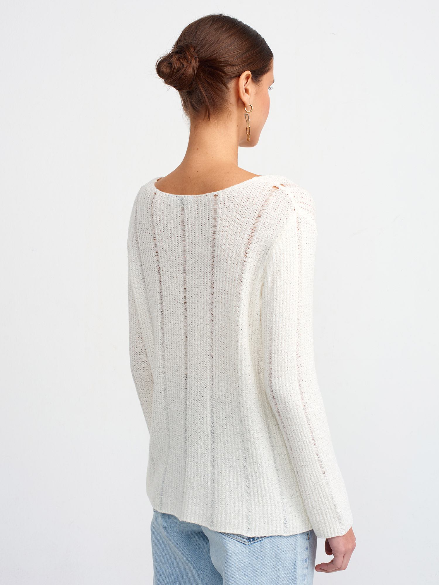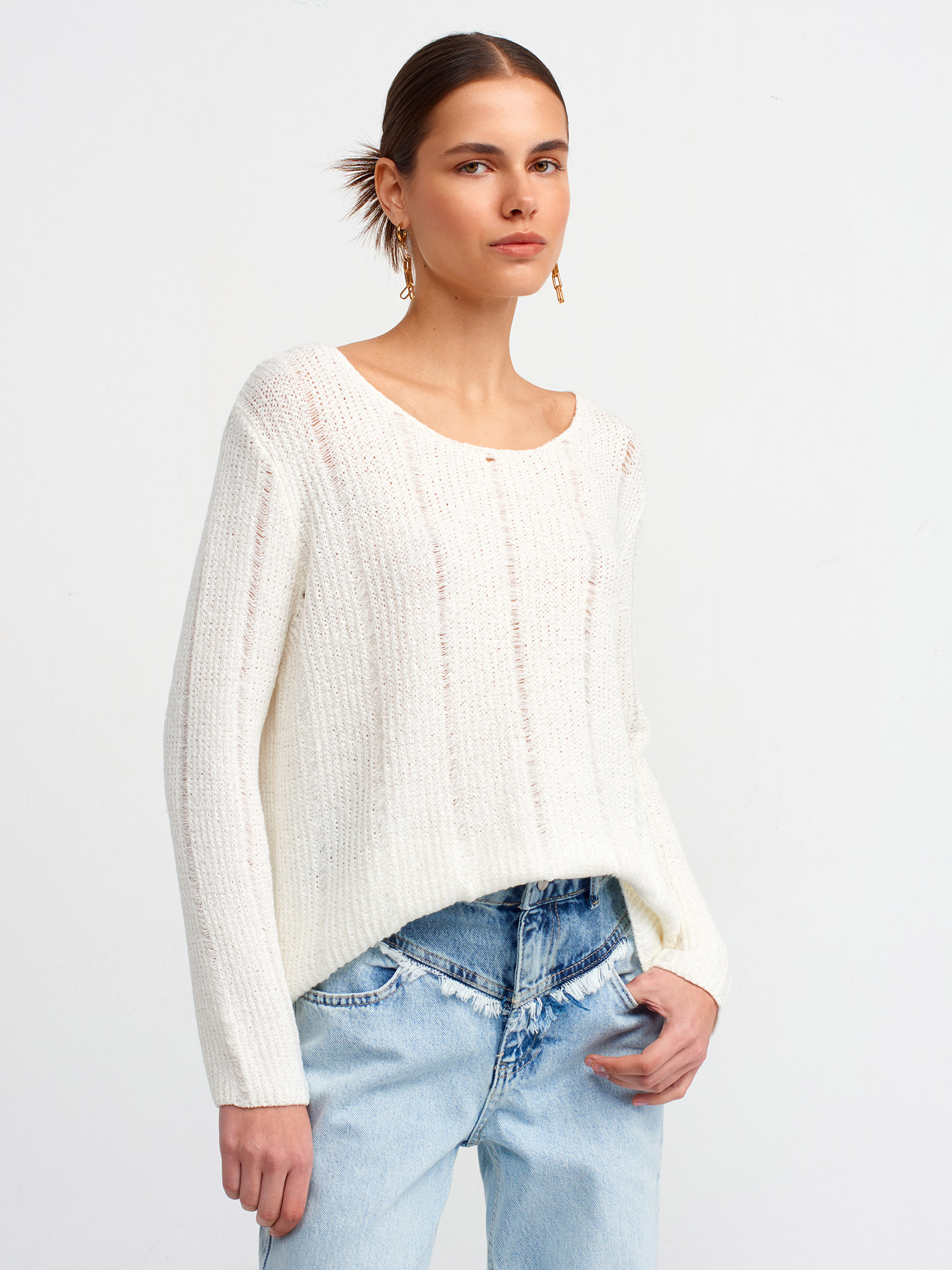 10544 Kayık Yaka Yumuşak Dokulu Triko Kazak-Ekru