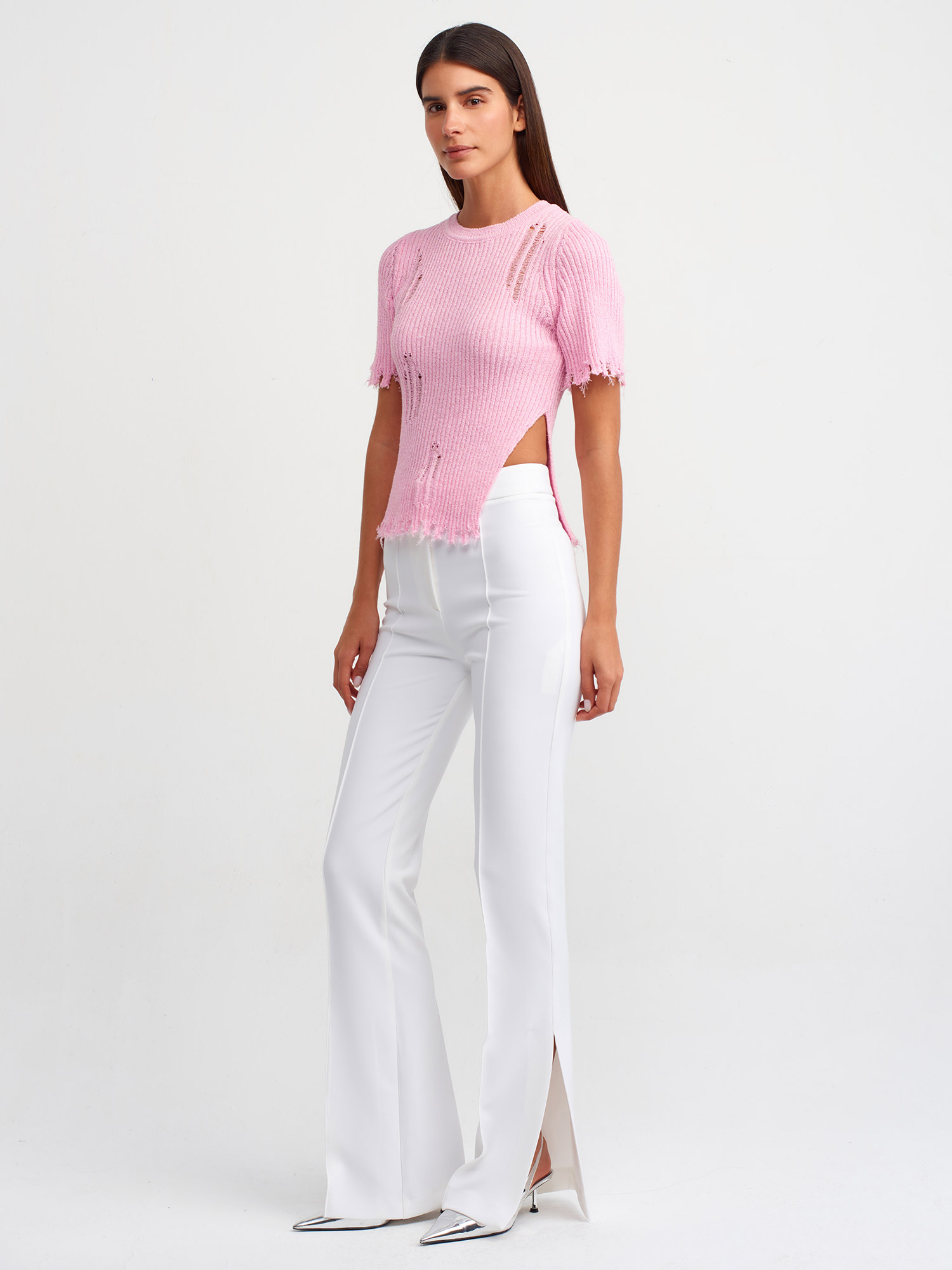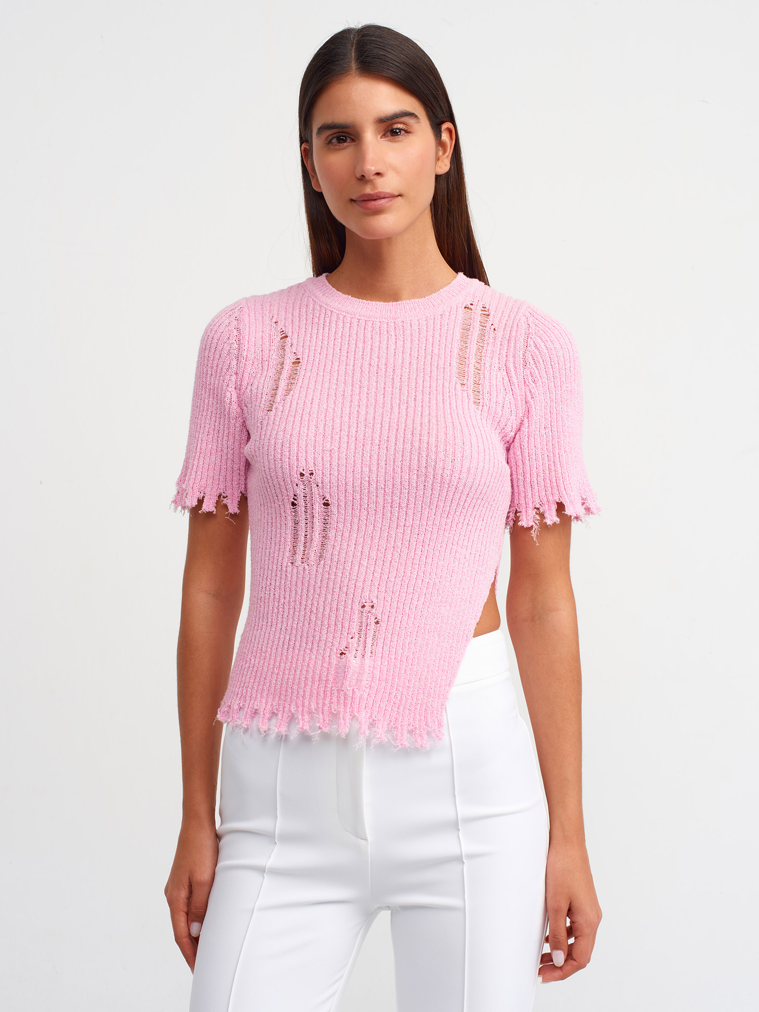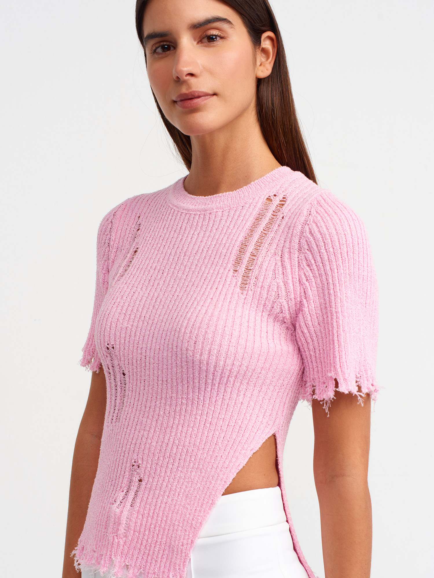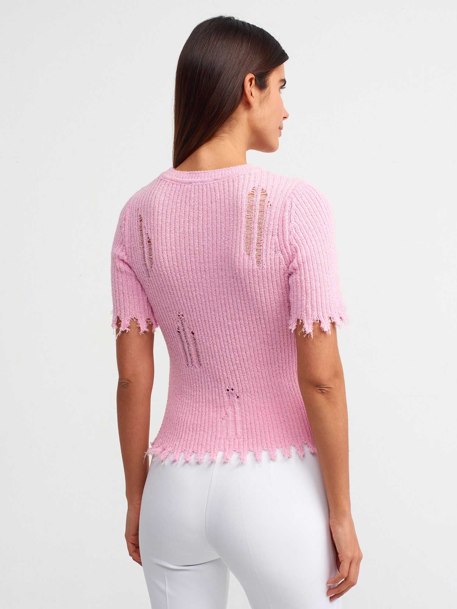 10555 Bisiklet Yaka Yırtık Detaylı Triko Kazak-Pembe