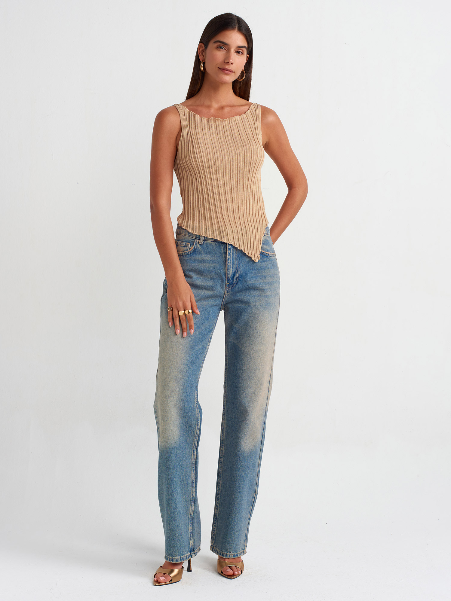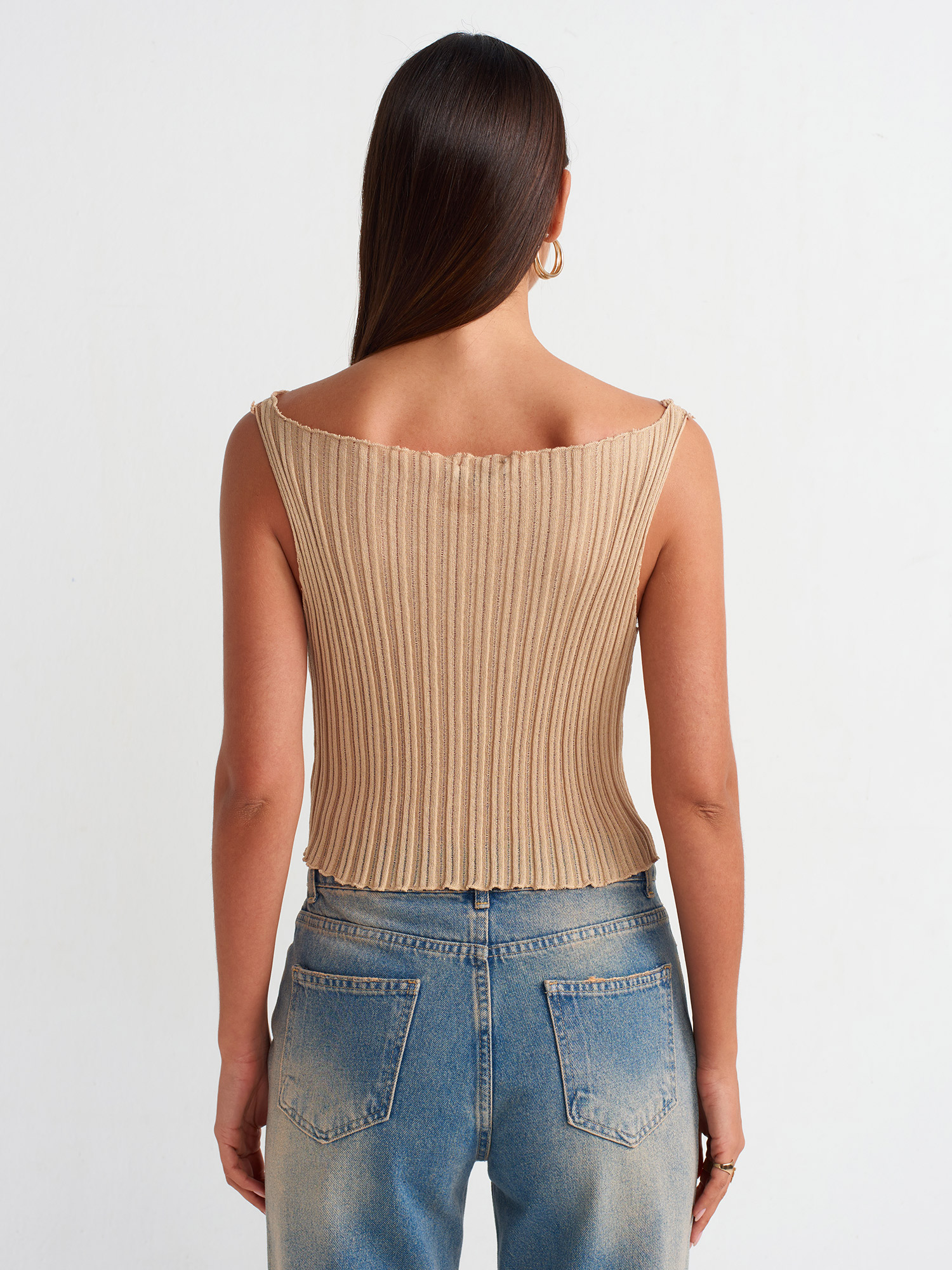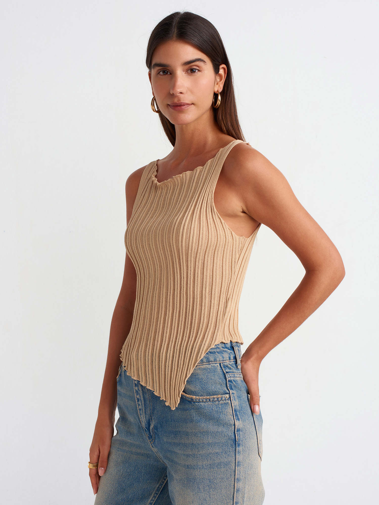 10560 Asimetrik Transparan Triko Bluz-Bej