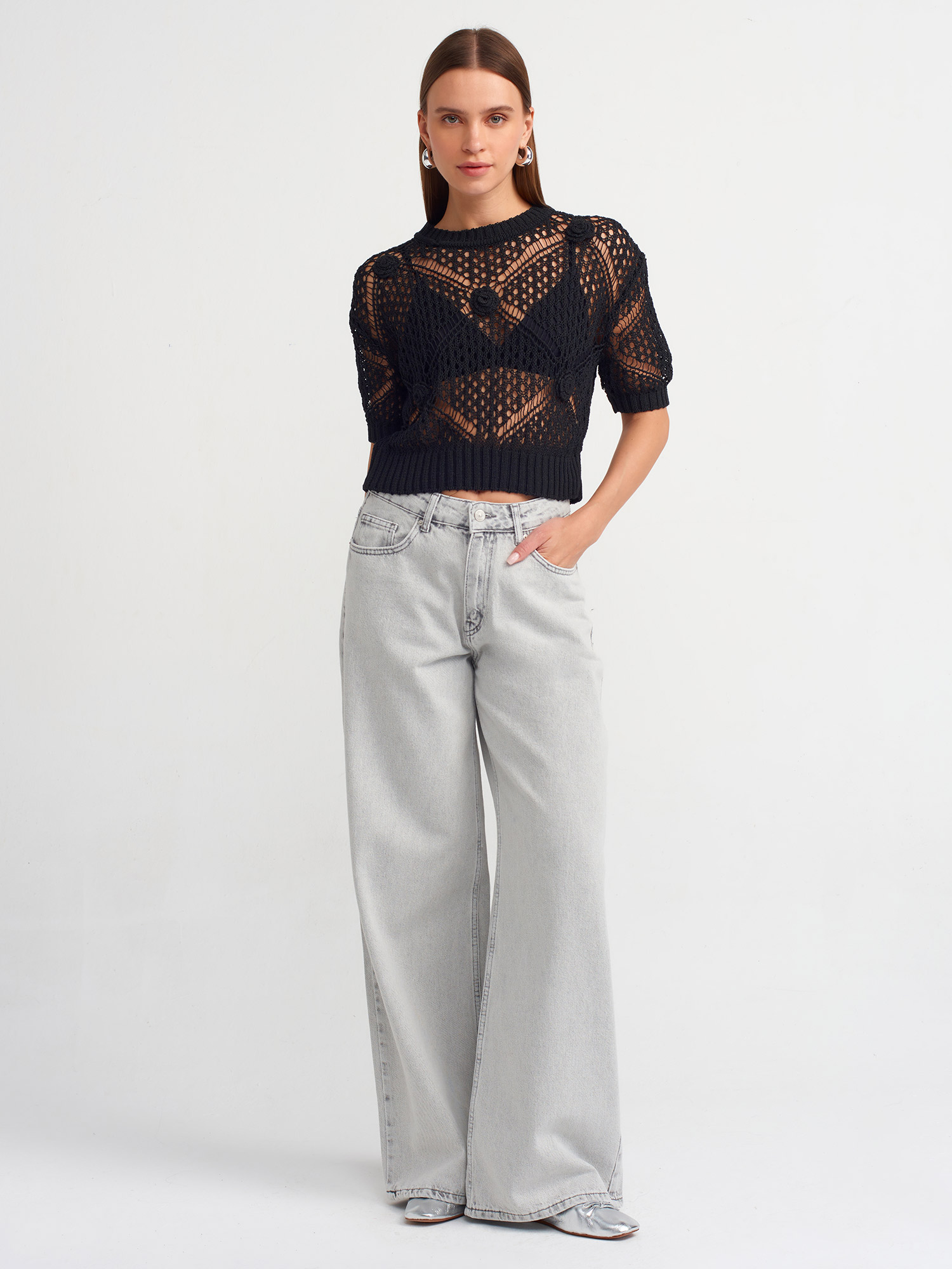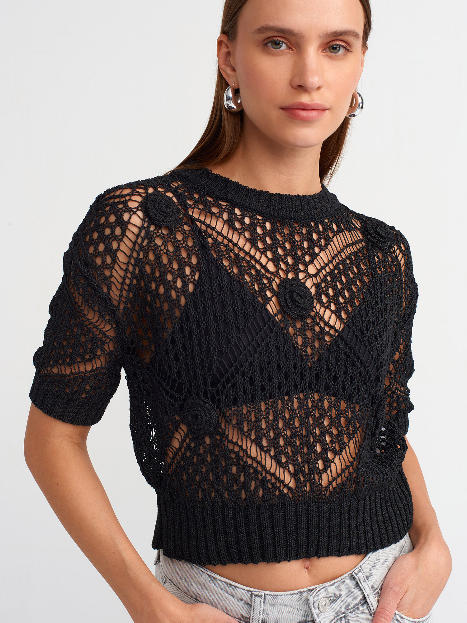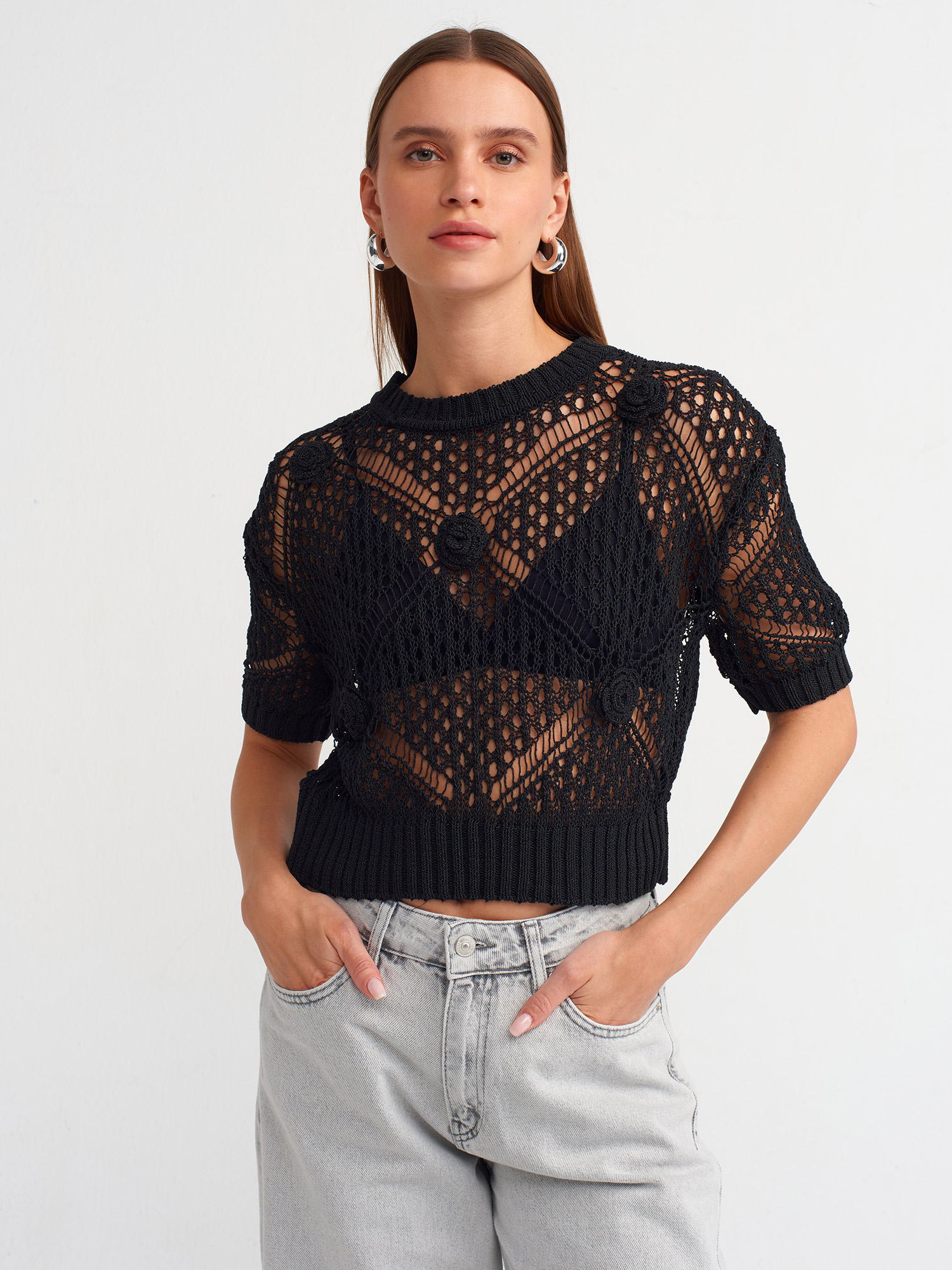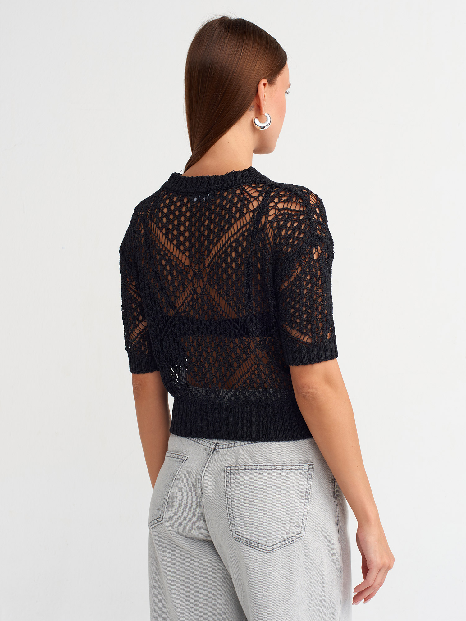 10584 Bisiklet Yaka Ajurlu Triko Kazak-Siyah