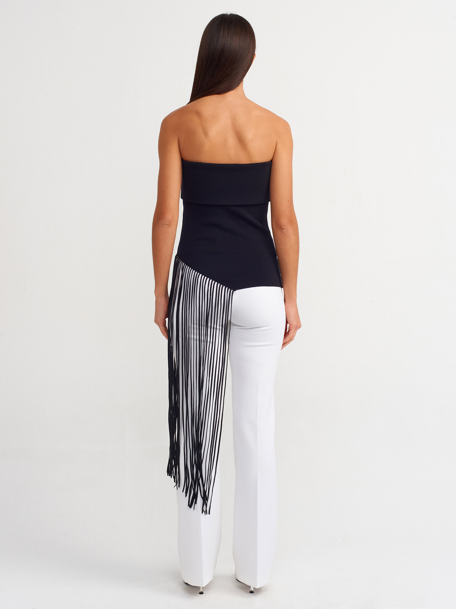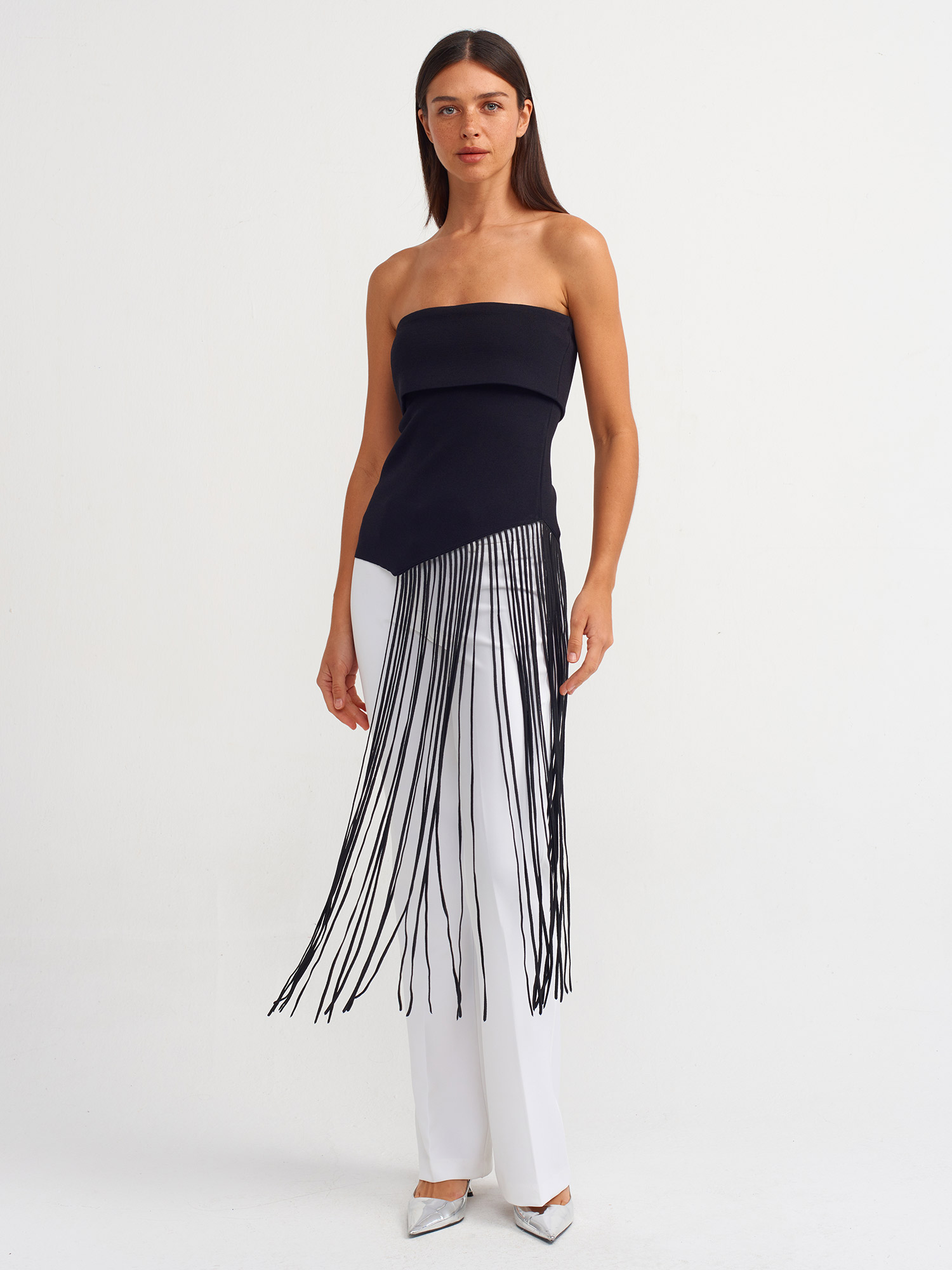 10586 Straplez Verev Püsküllü Triko Top-Siyah
