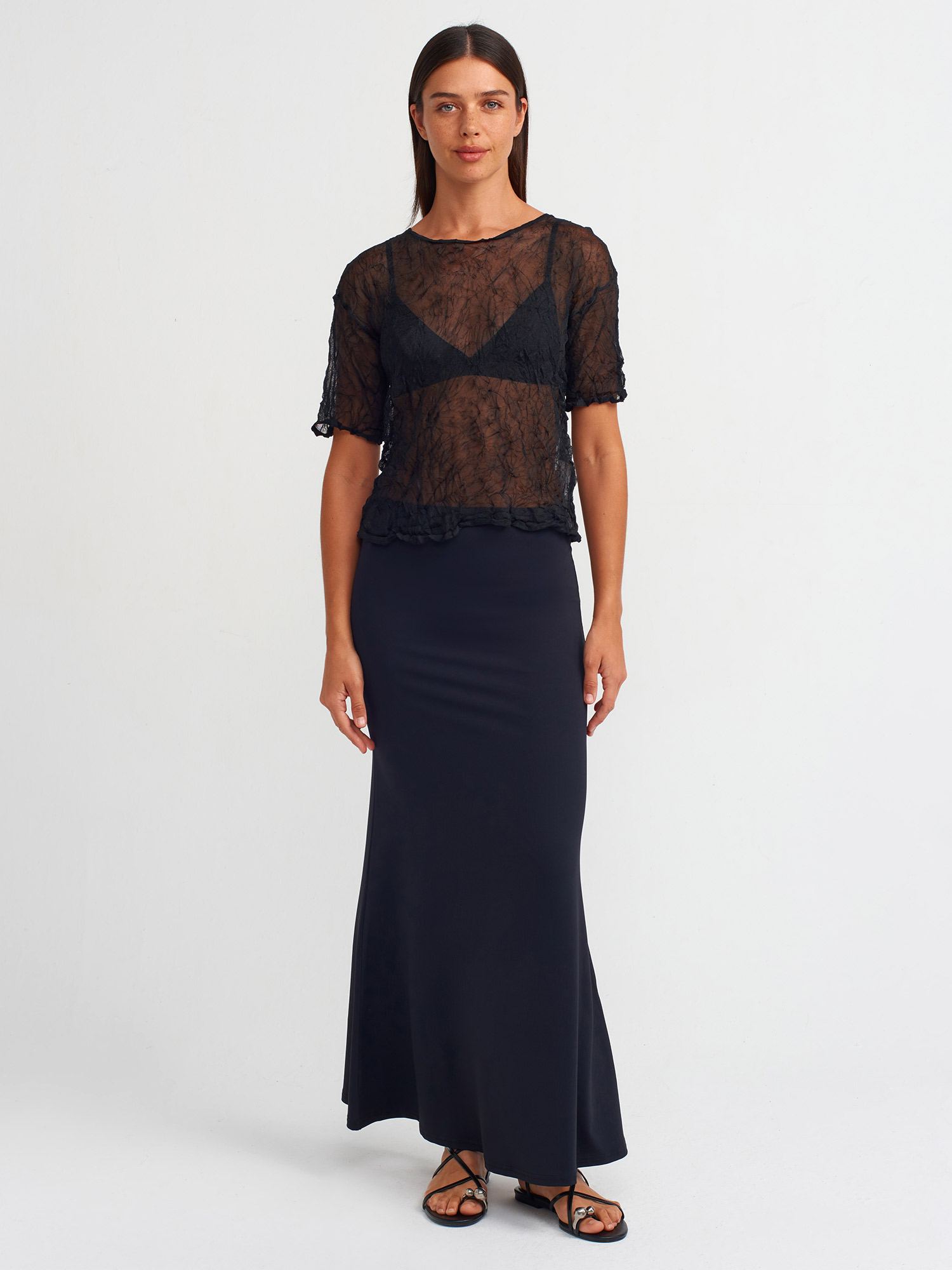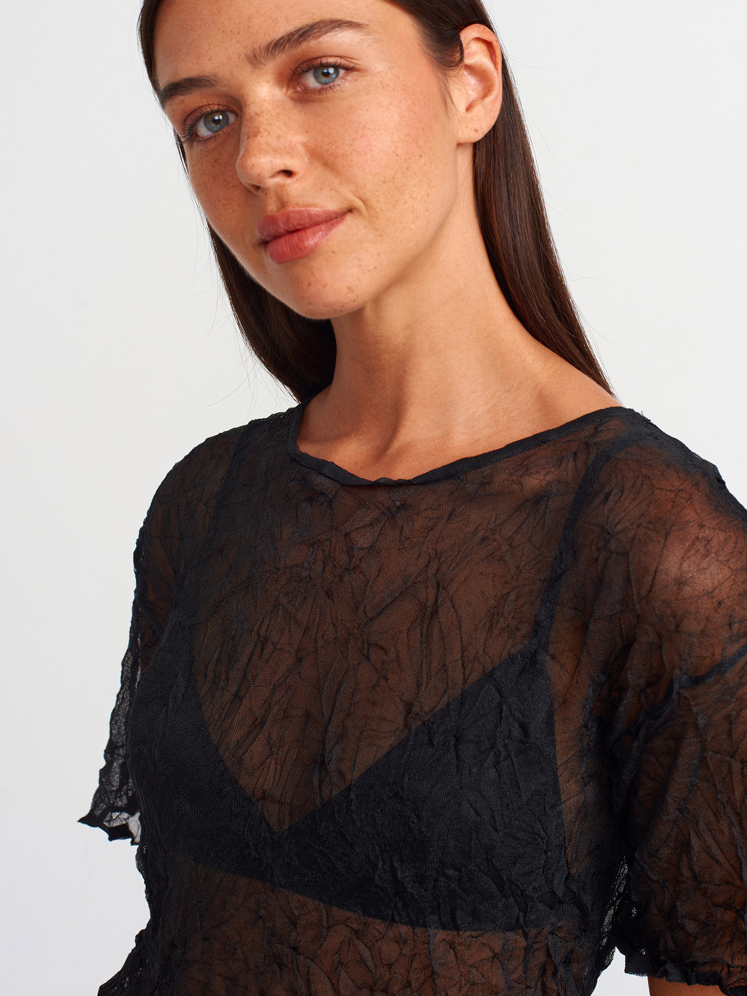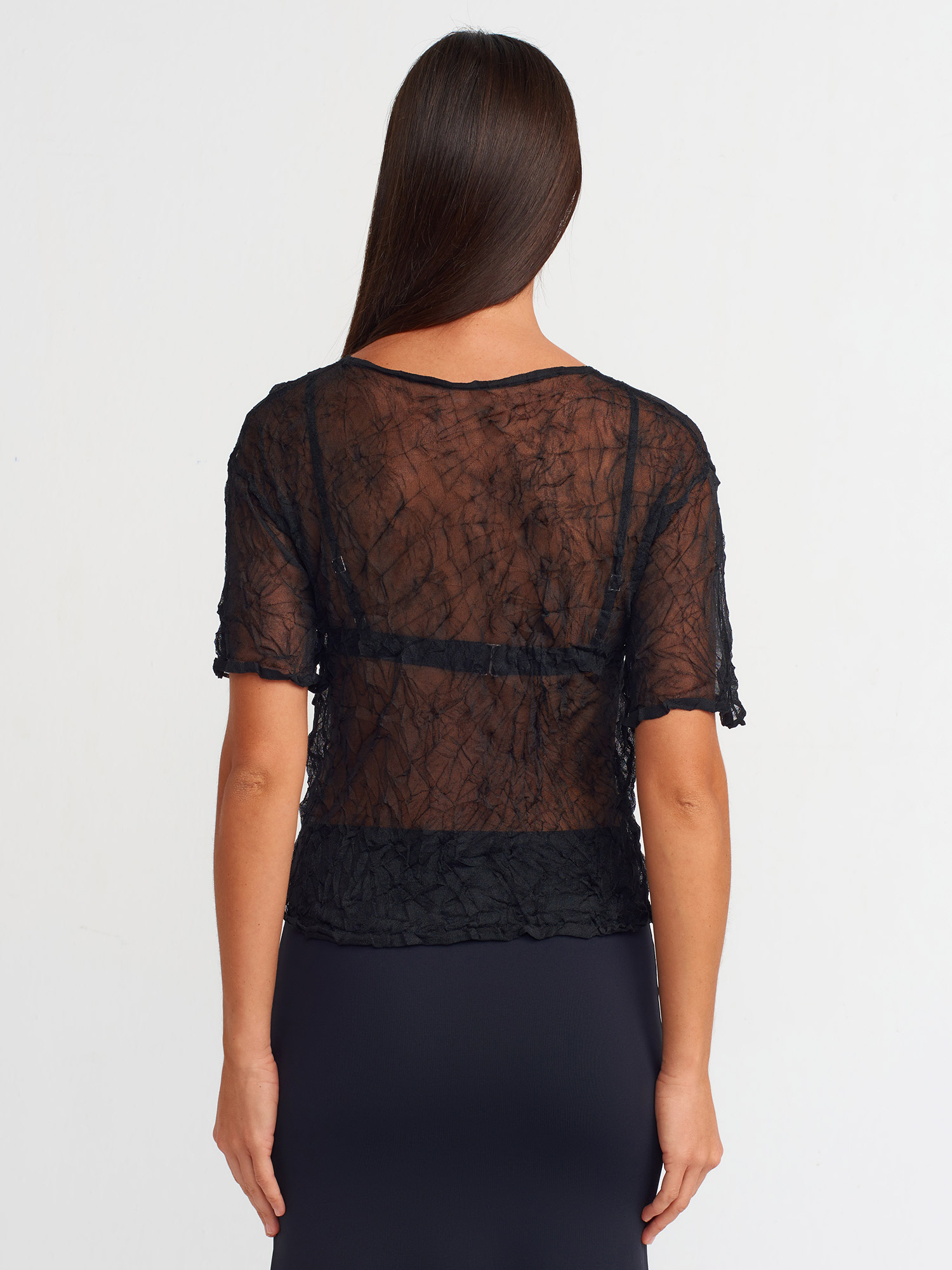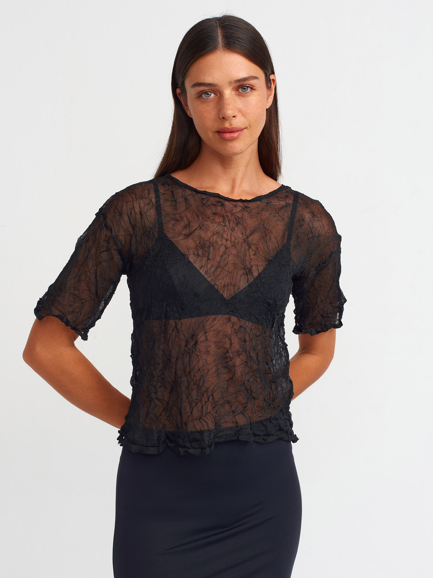 10592 Buruşuk Görünümlü Transparan Triko Bluz-Siyah