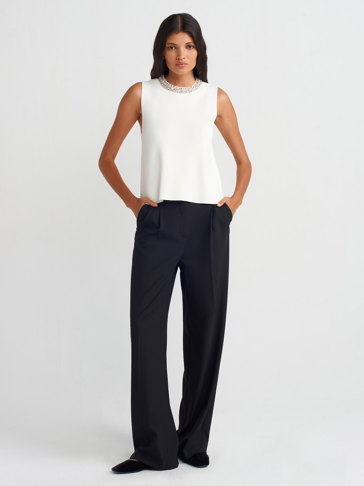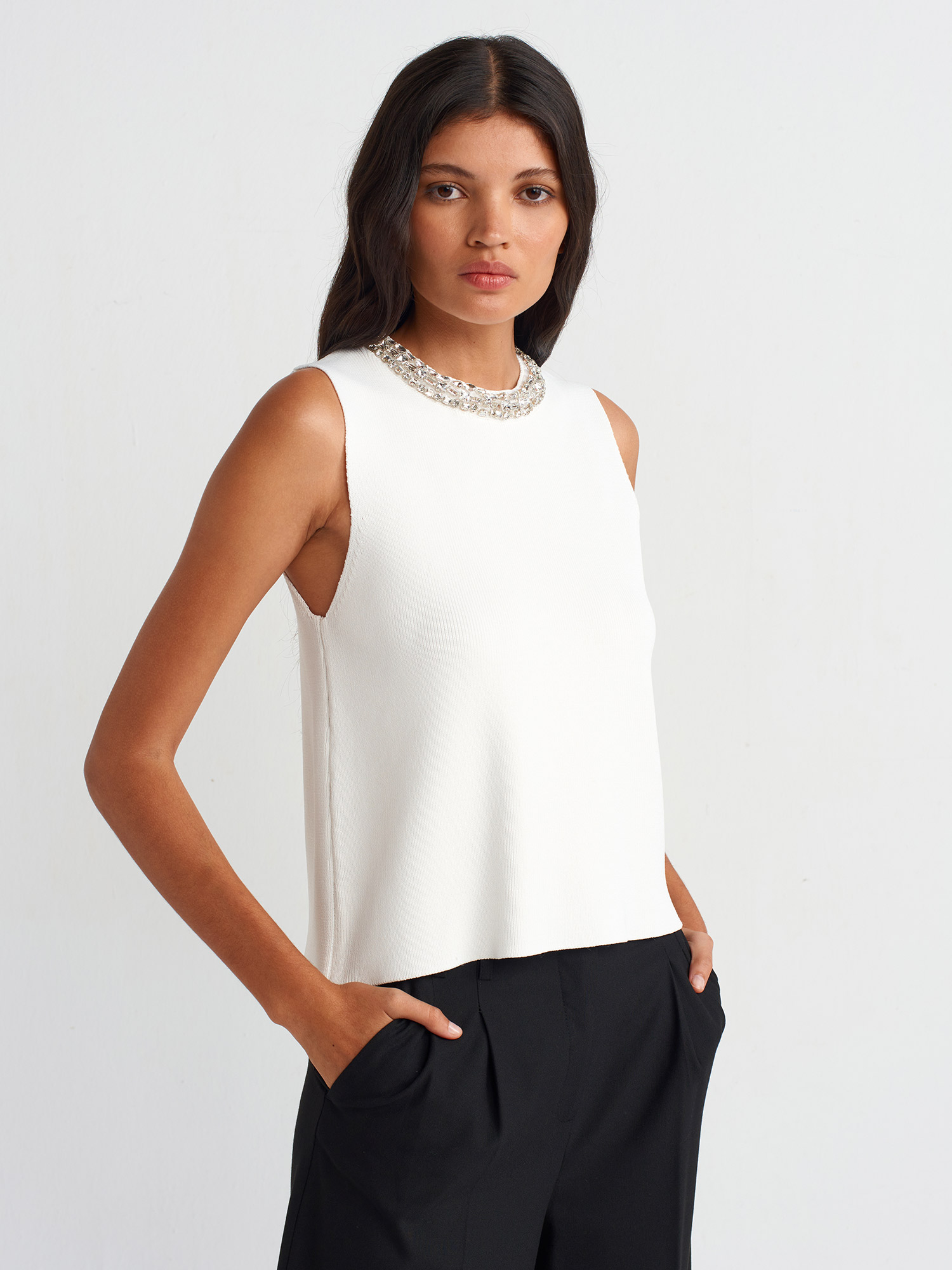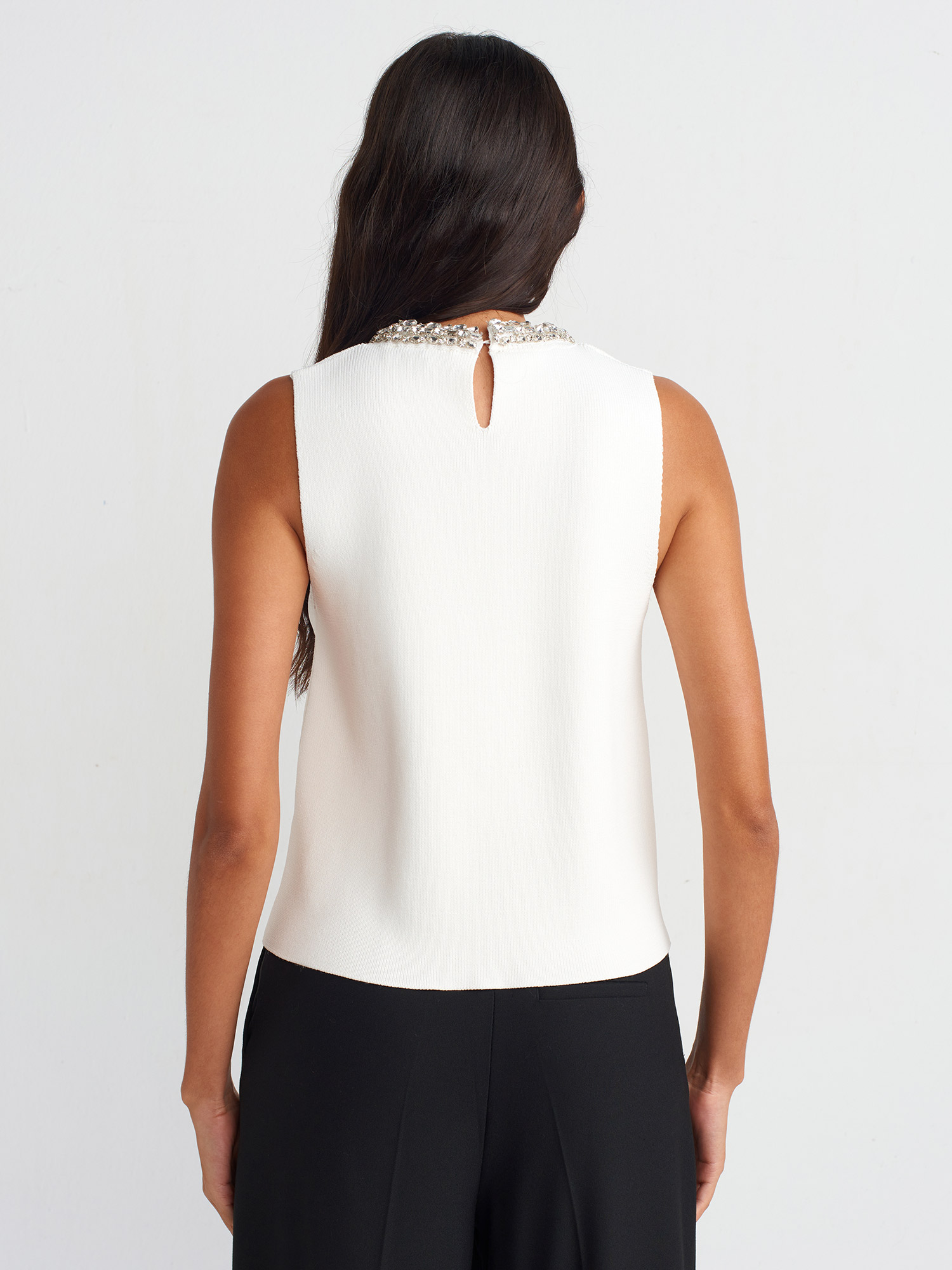 10600 Yaka Taş Detaylı Triko Bluz-Ekru