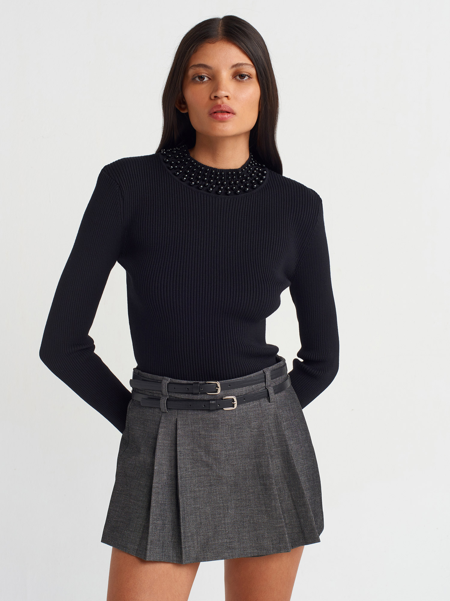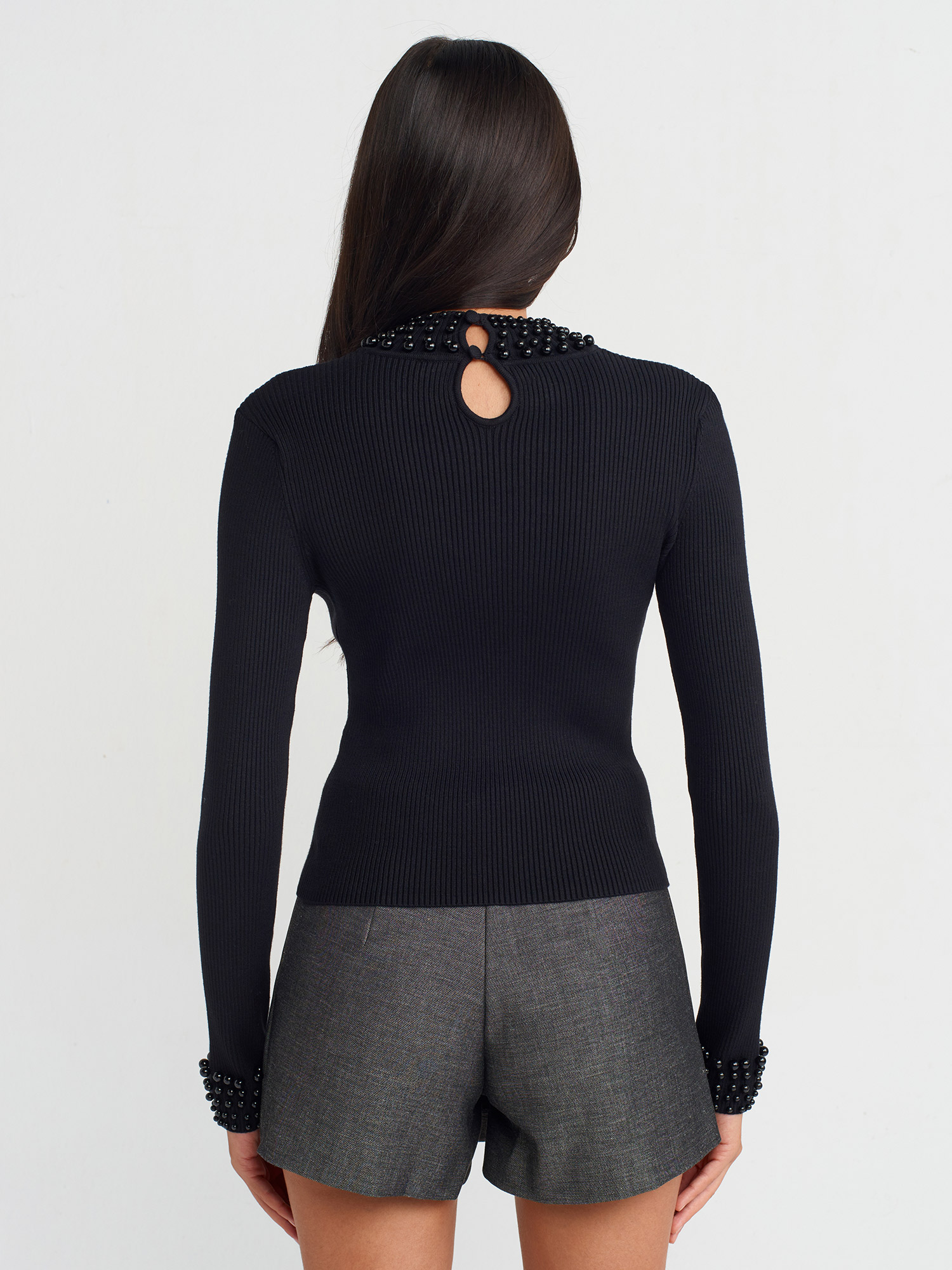 10618 İncili Arkası Düğme Detaylı Triko Kazak-Siyah
