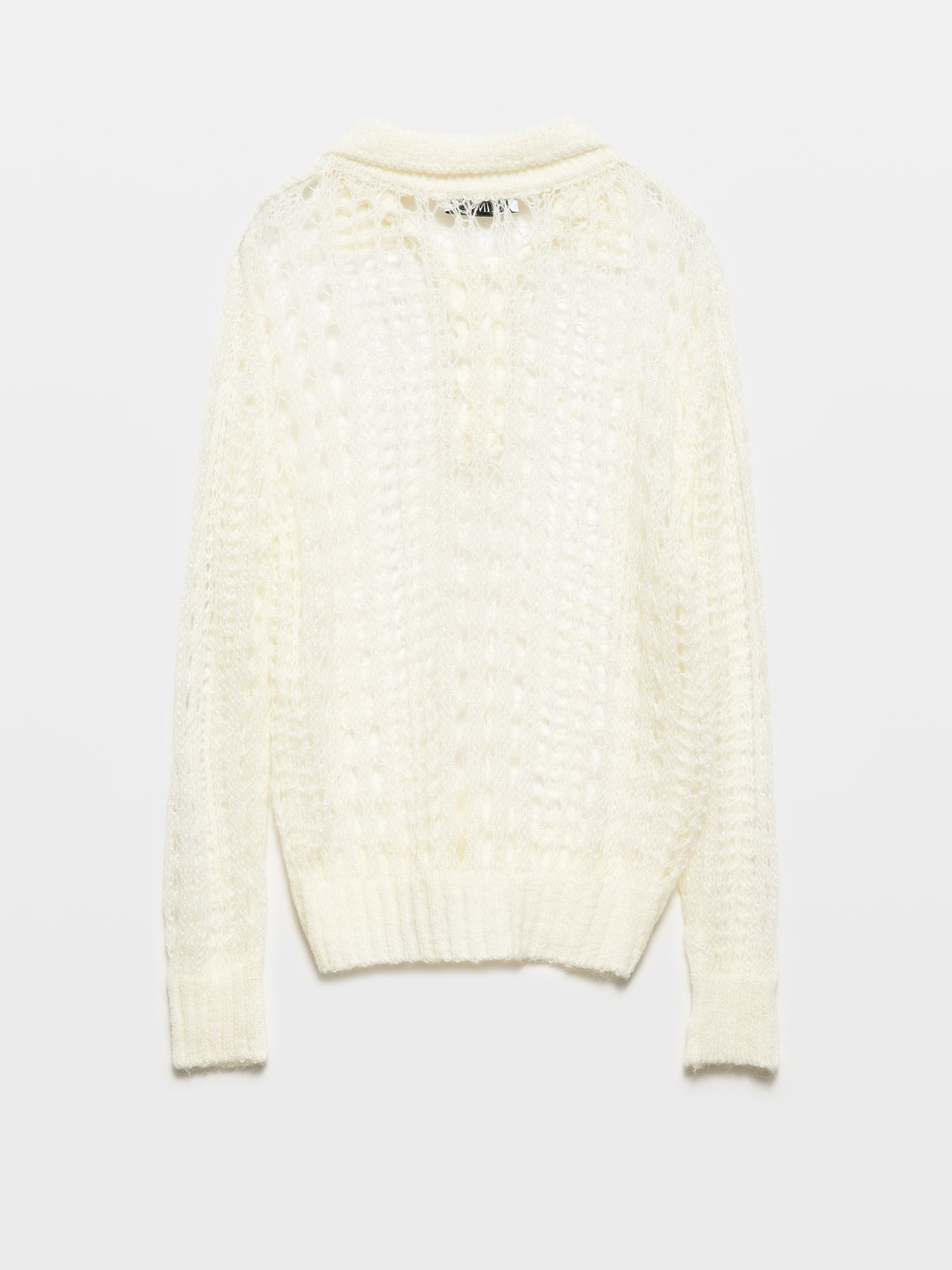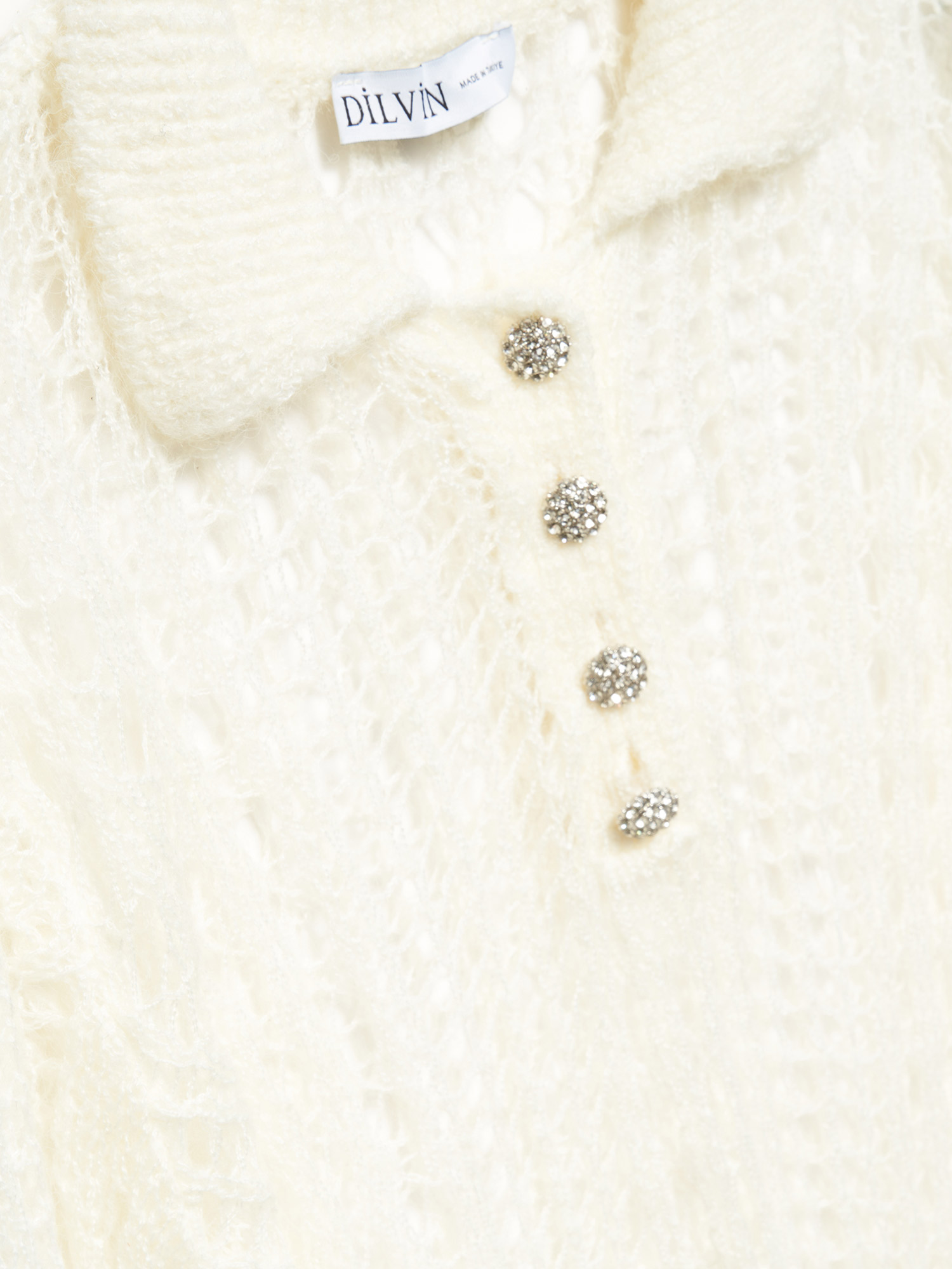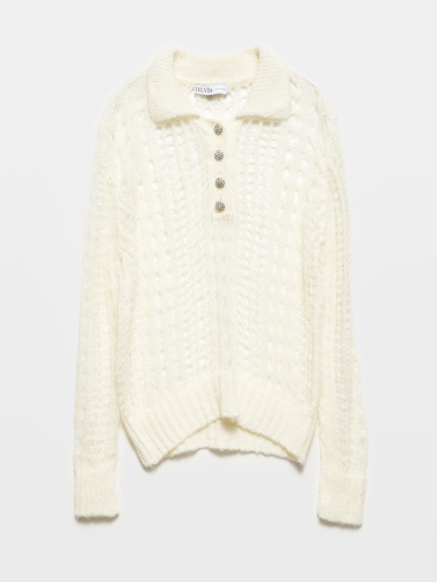 10624 Polo Yaka Taş Düğmeli Ajurlu Triko Kazak-Ekru