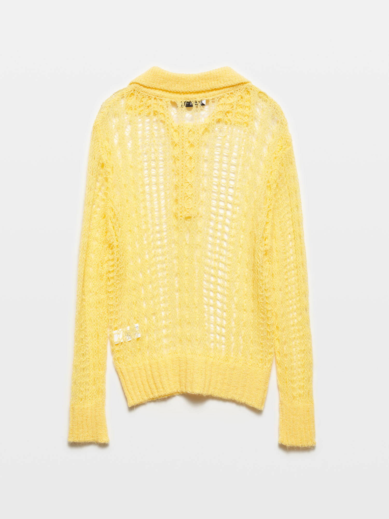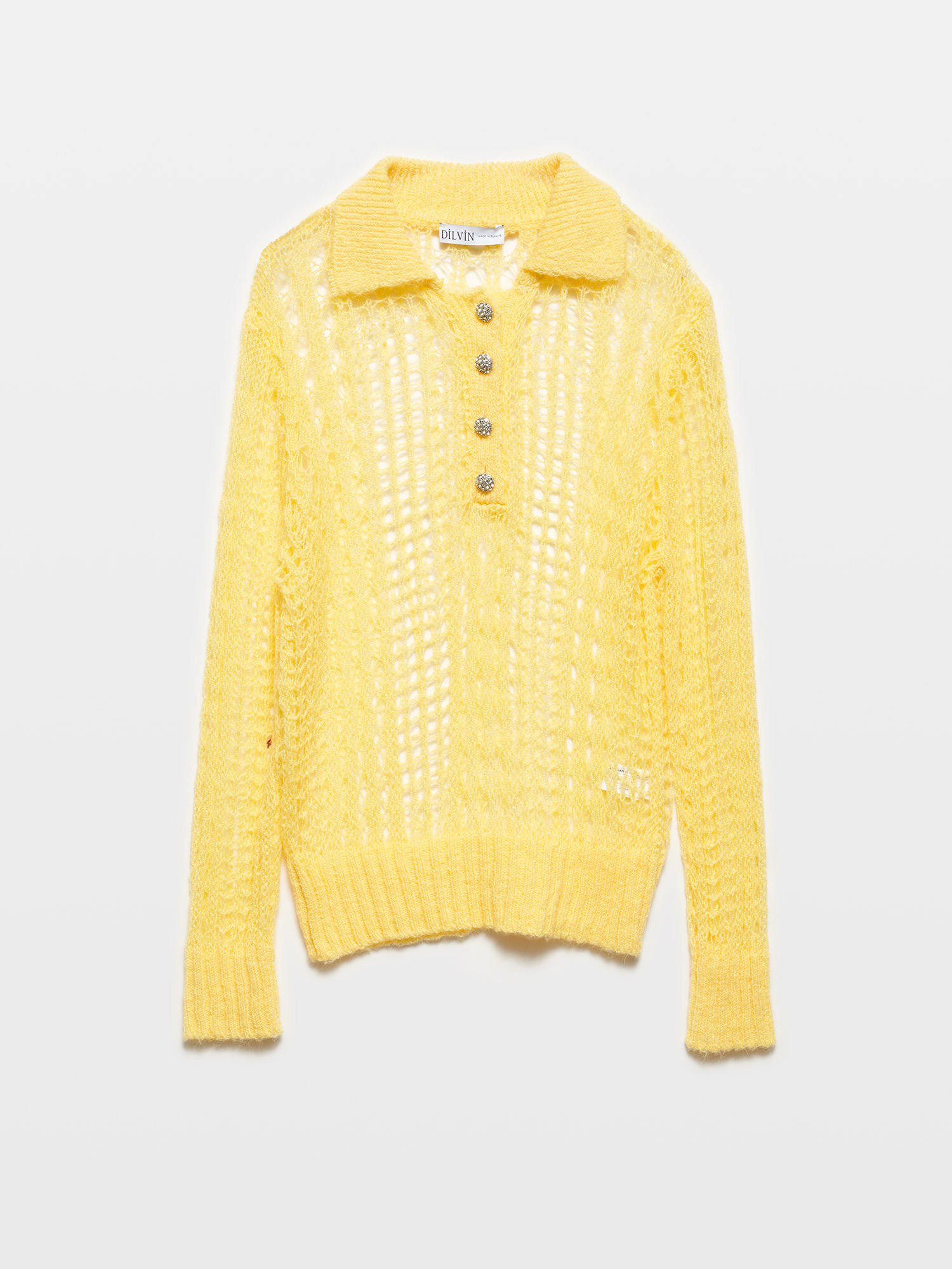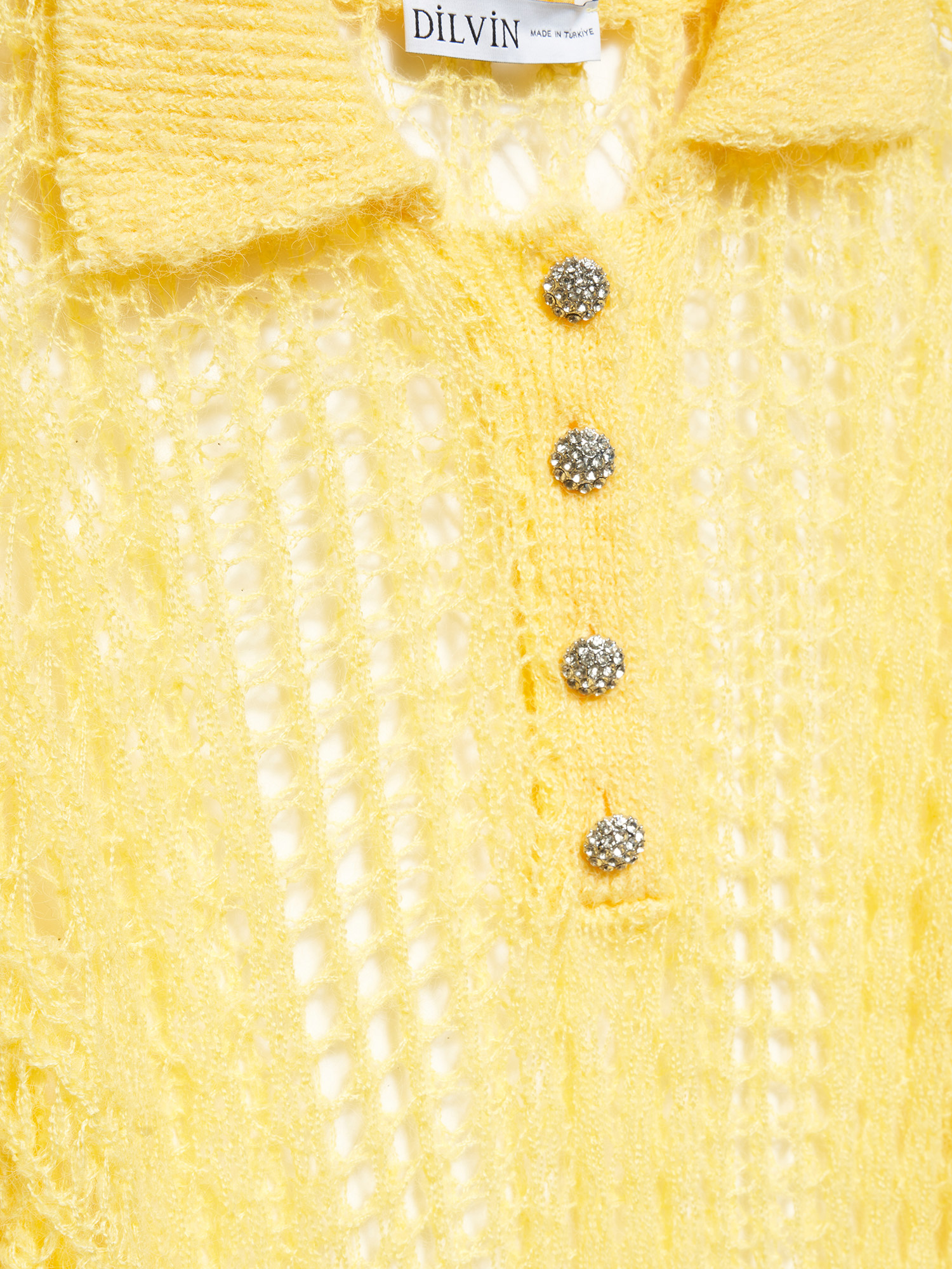 10624 Polo Yaka Taş Düğmeli Ajurlu Triko Kazak-Sarı