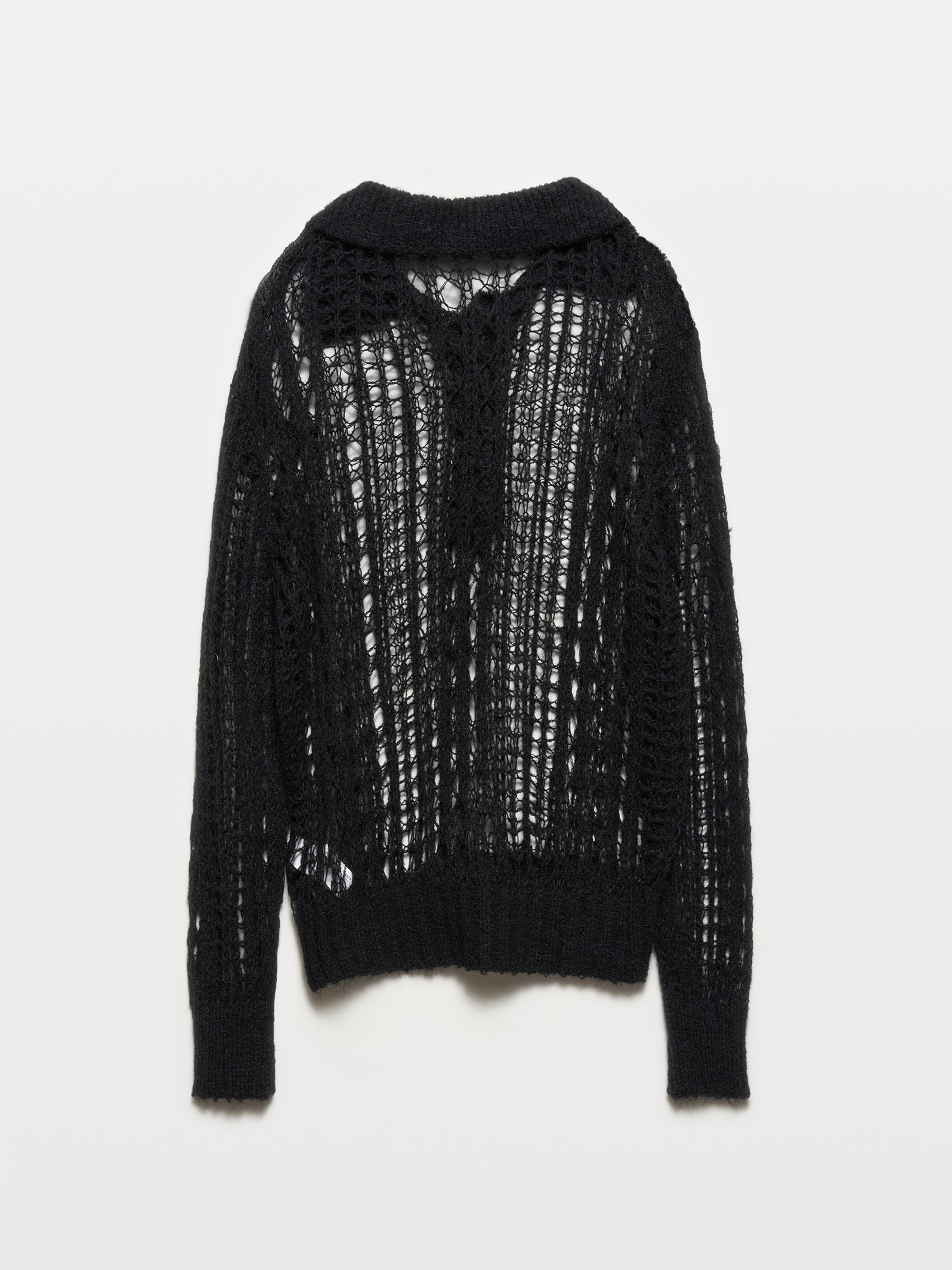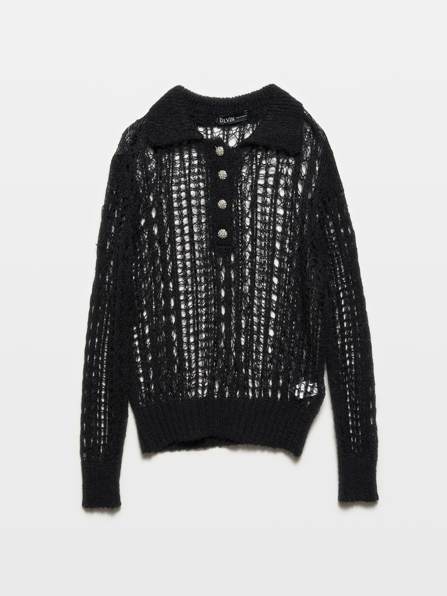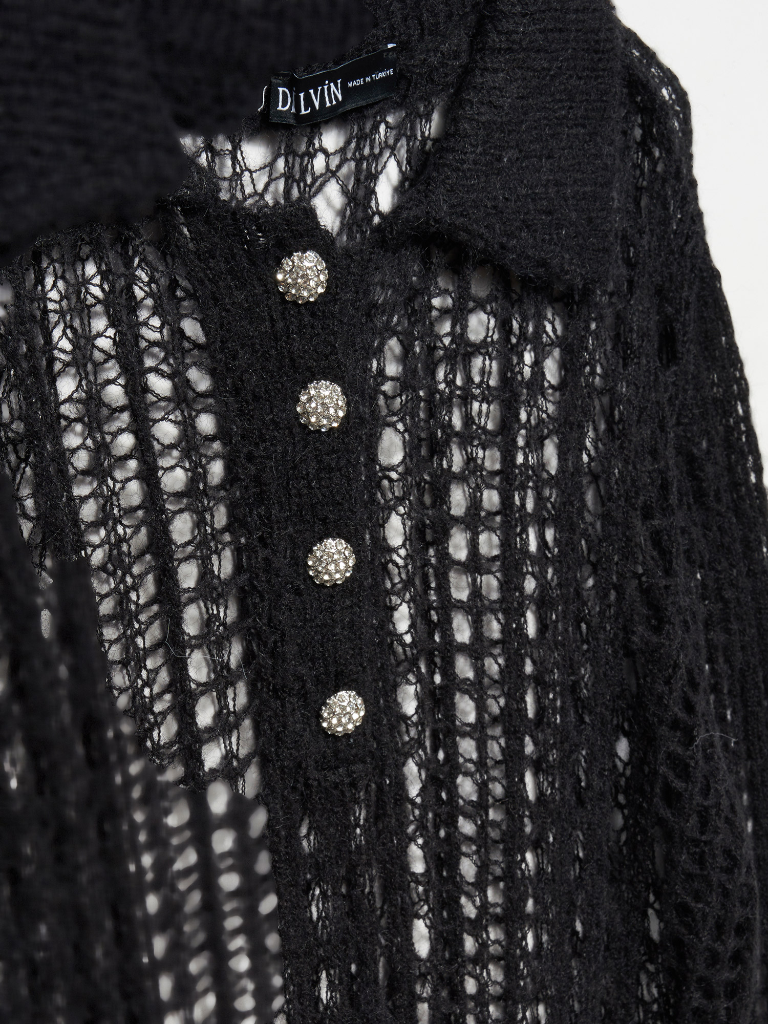 10624 Polo Yaka Taş Düğmeli Ajurlu Triko Kazak-Siyah