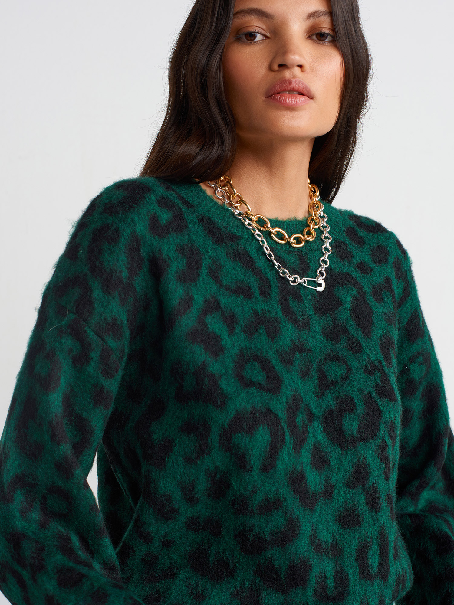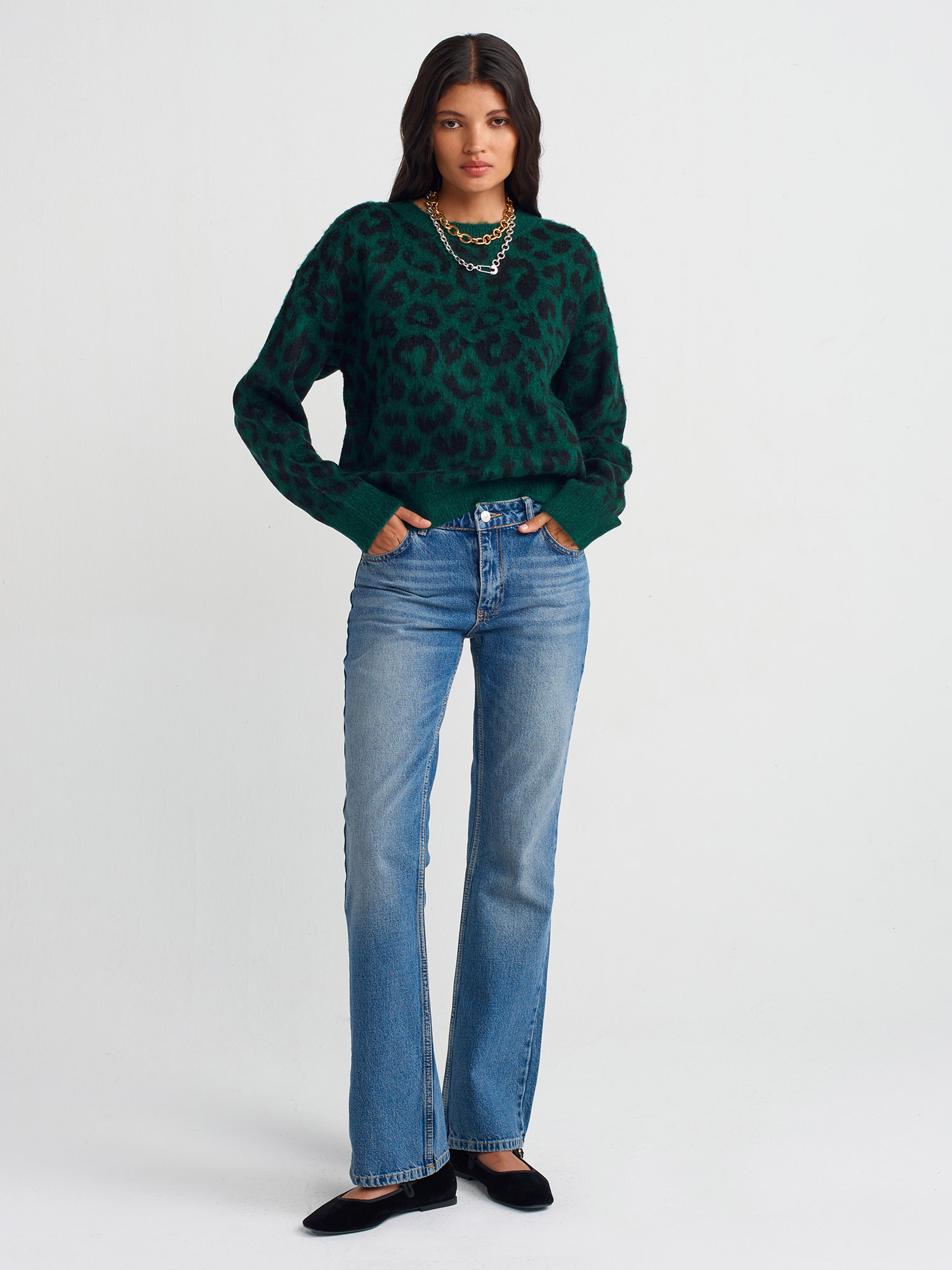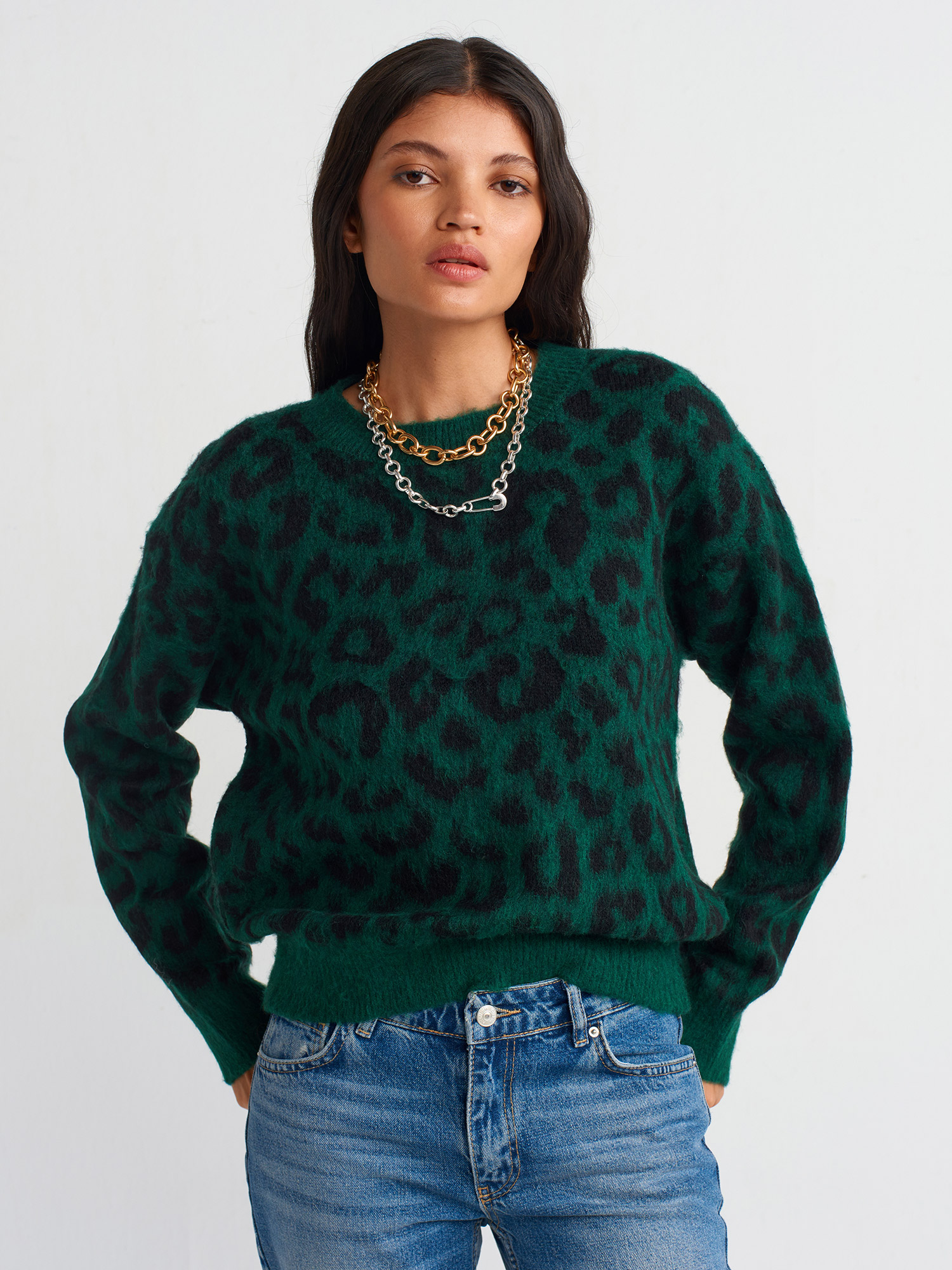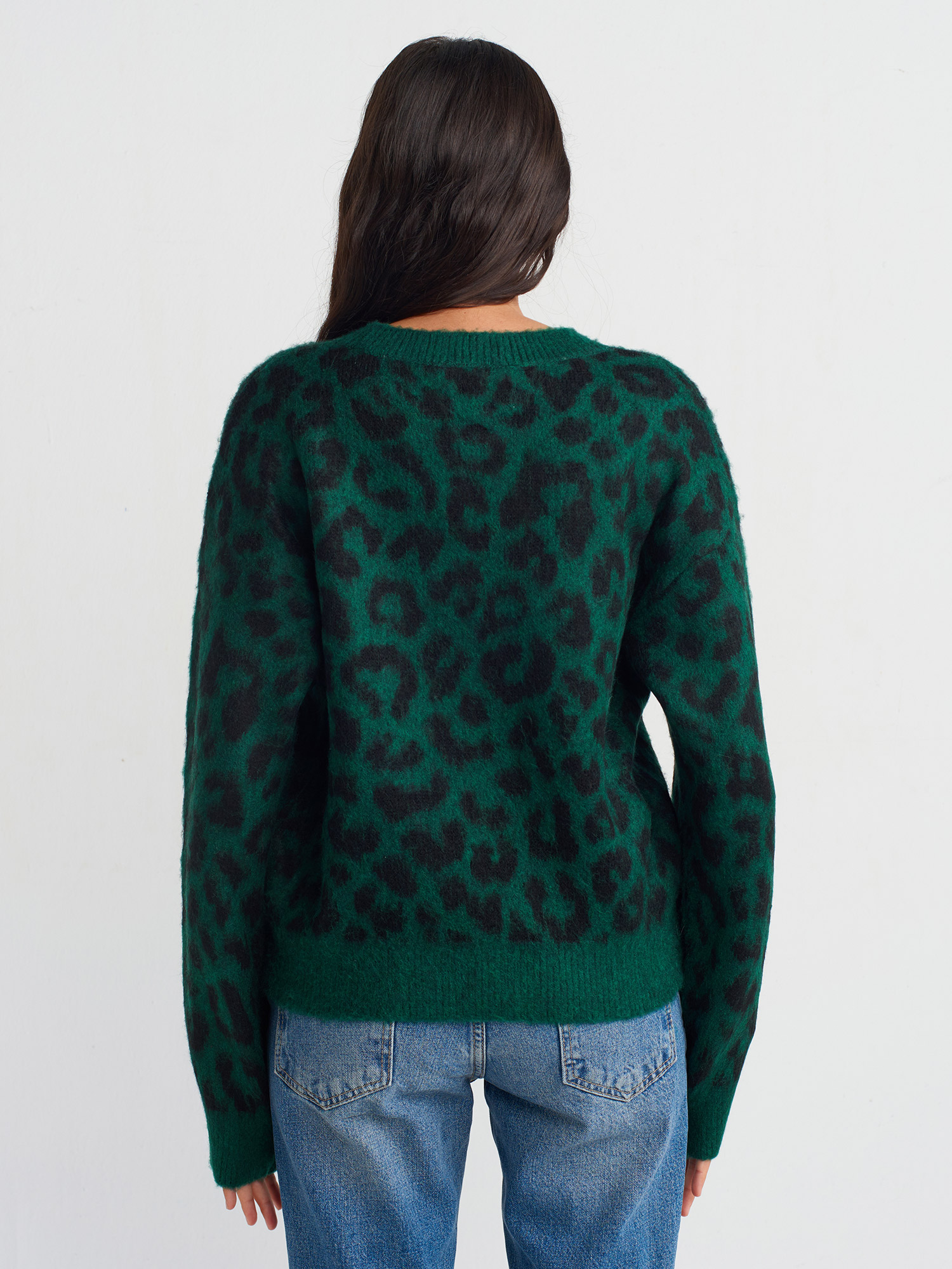 10632 Bisiklet Yaka Leopar Şardonlu Triko Kazak-N.Yeşil-S.