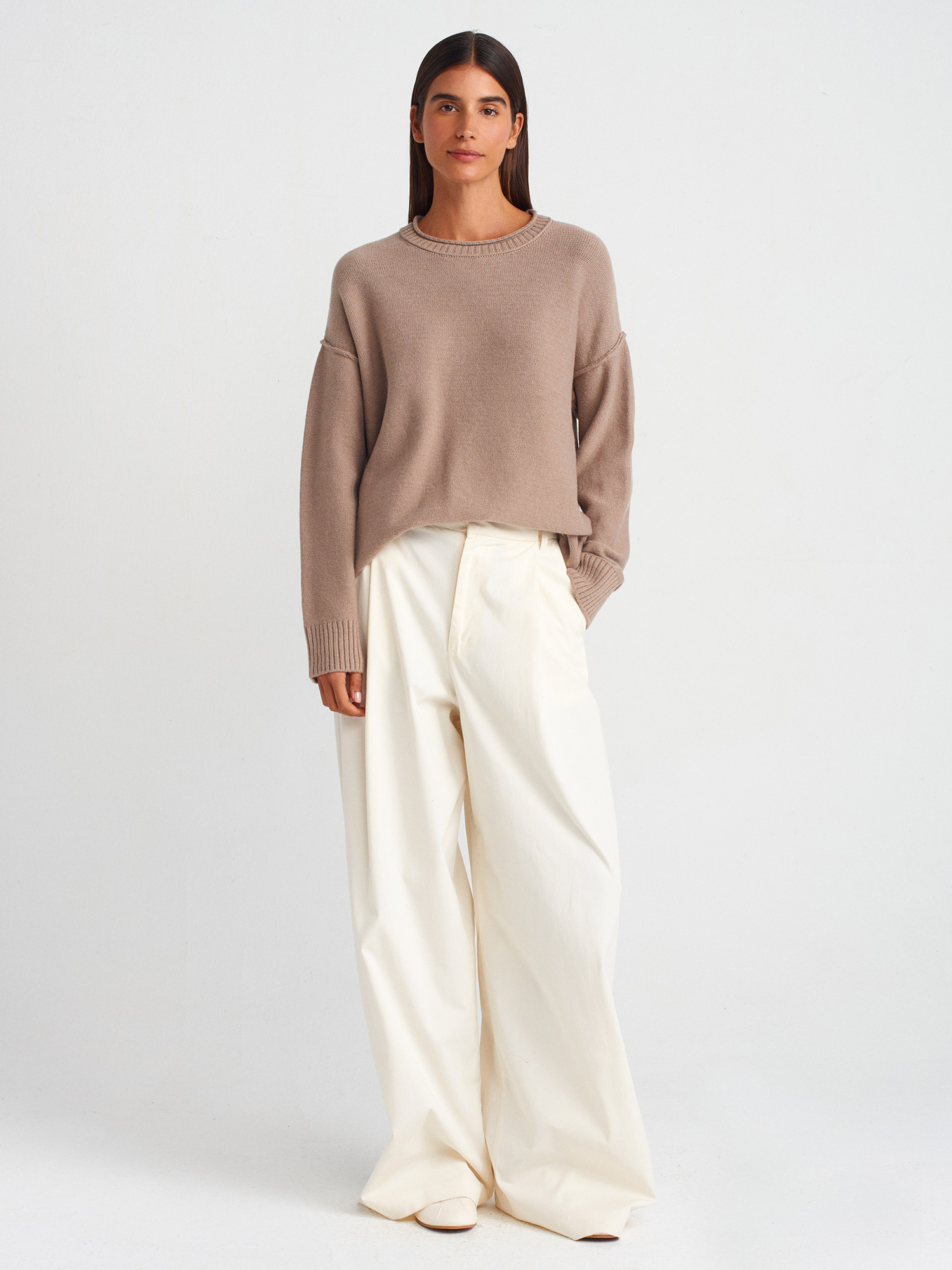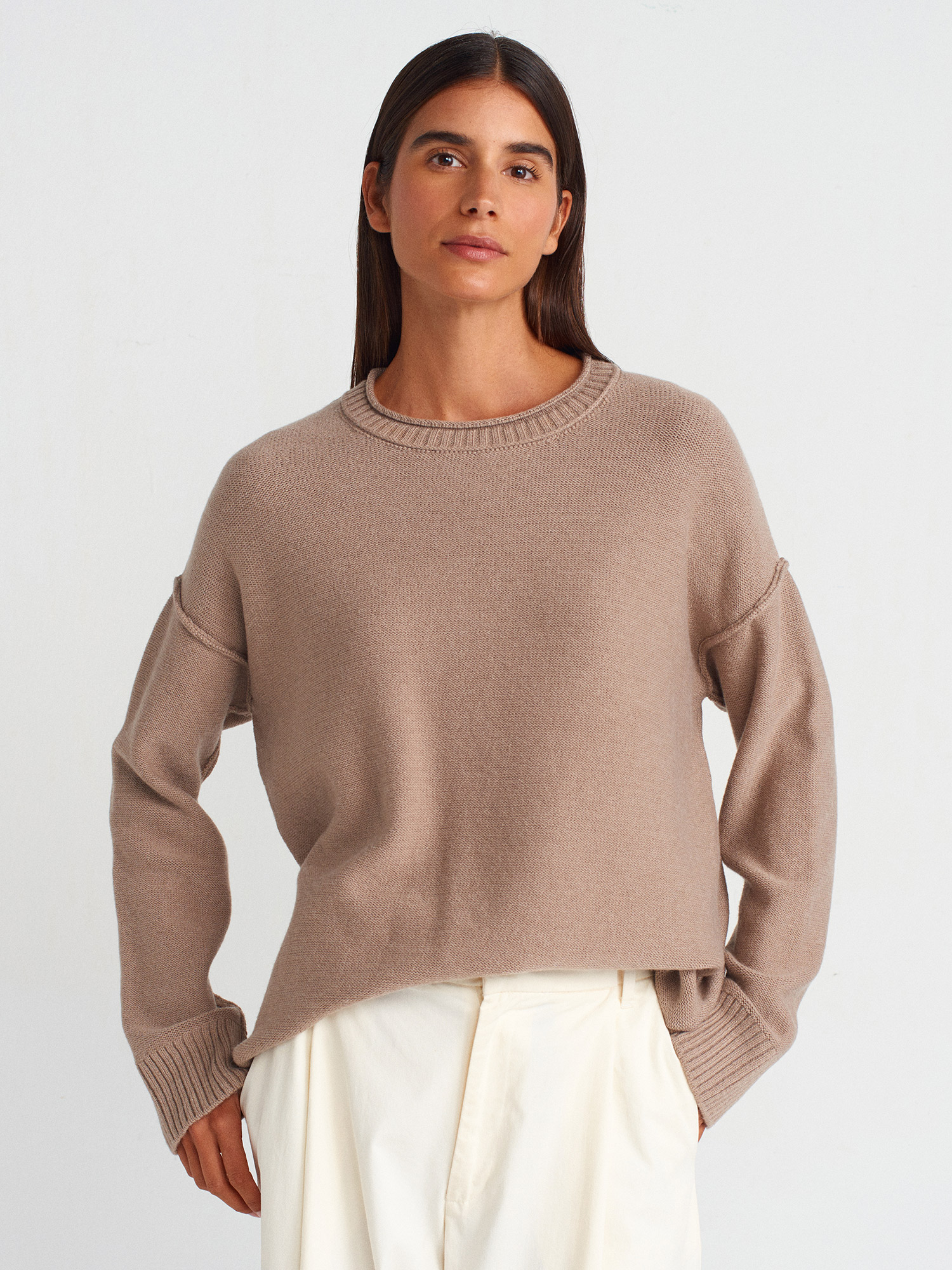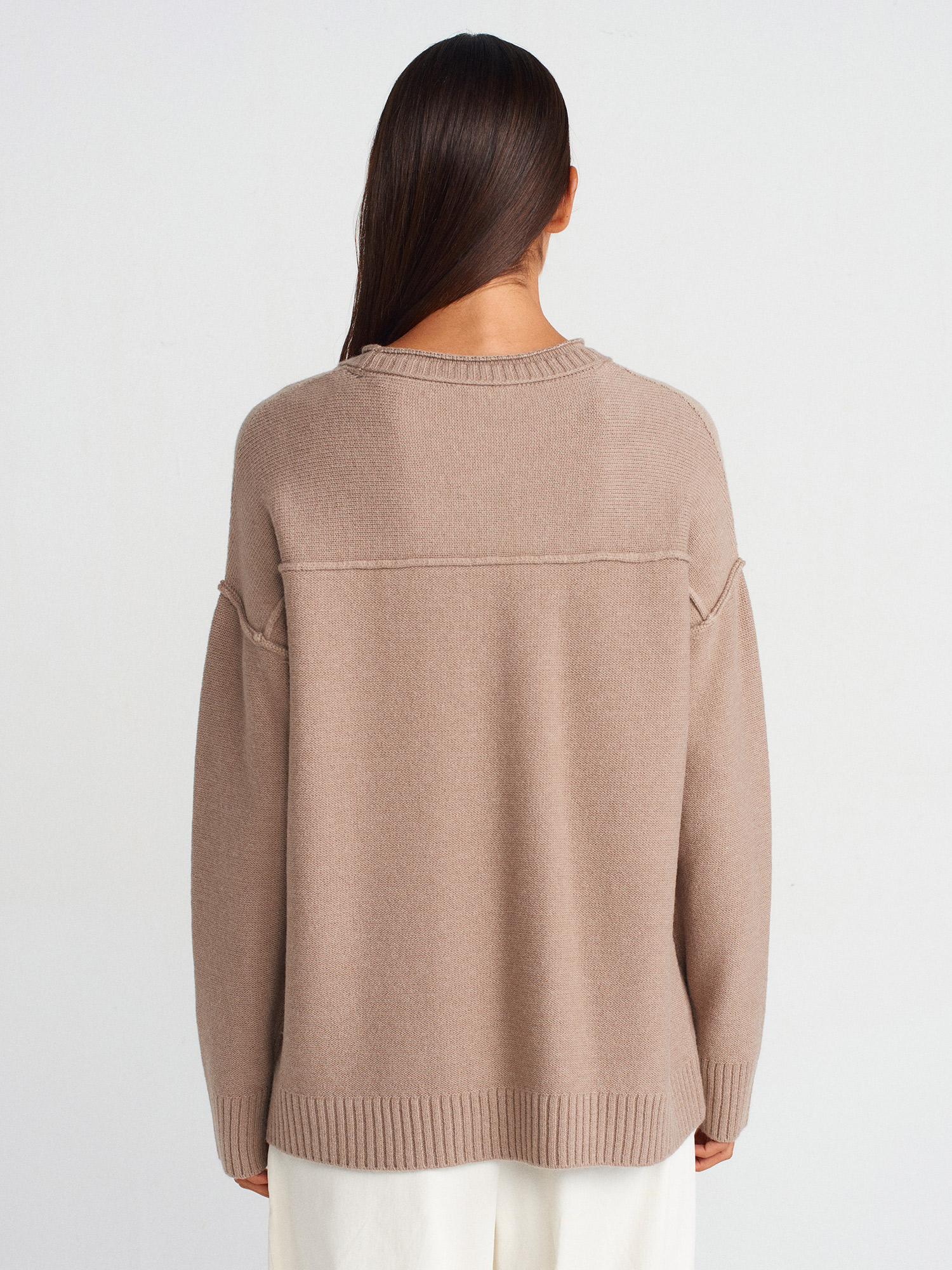10636 Bisiklet Yaka Dikiş Detaylı Triko Kazak-Koyu Vizon