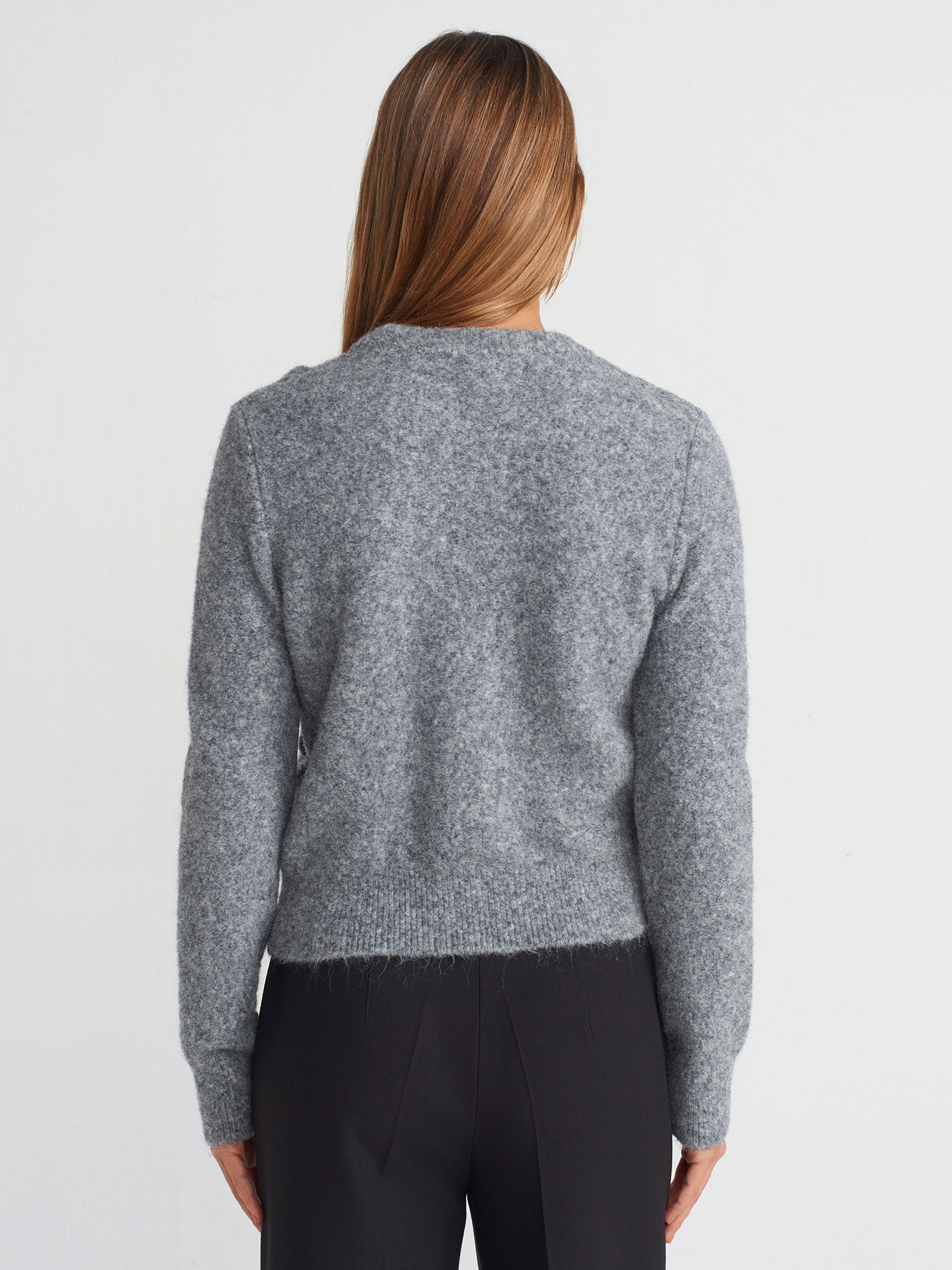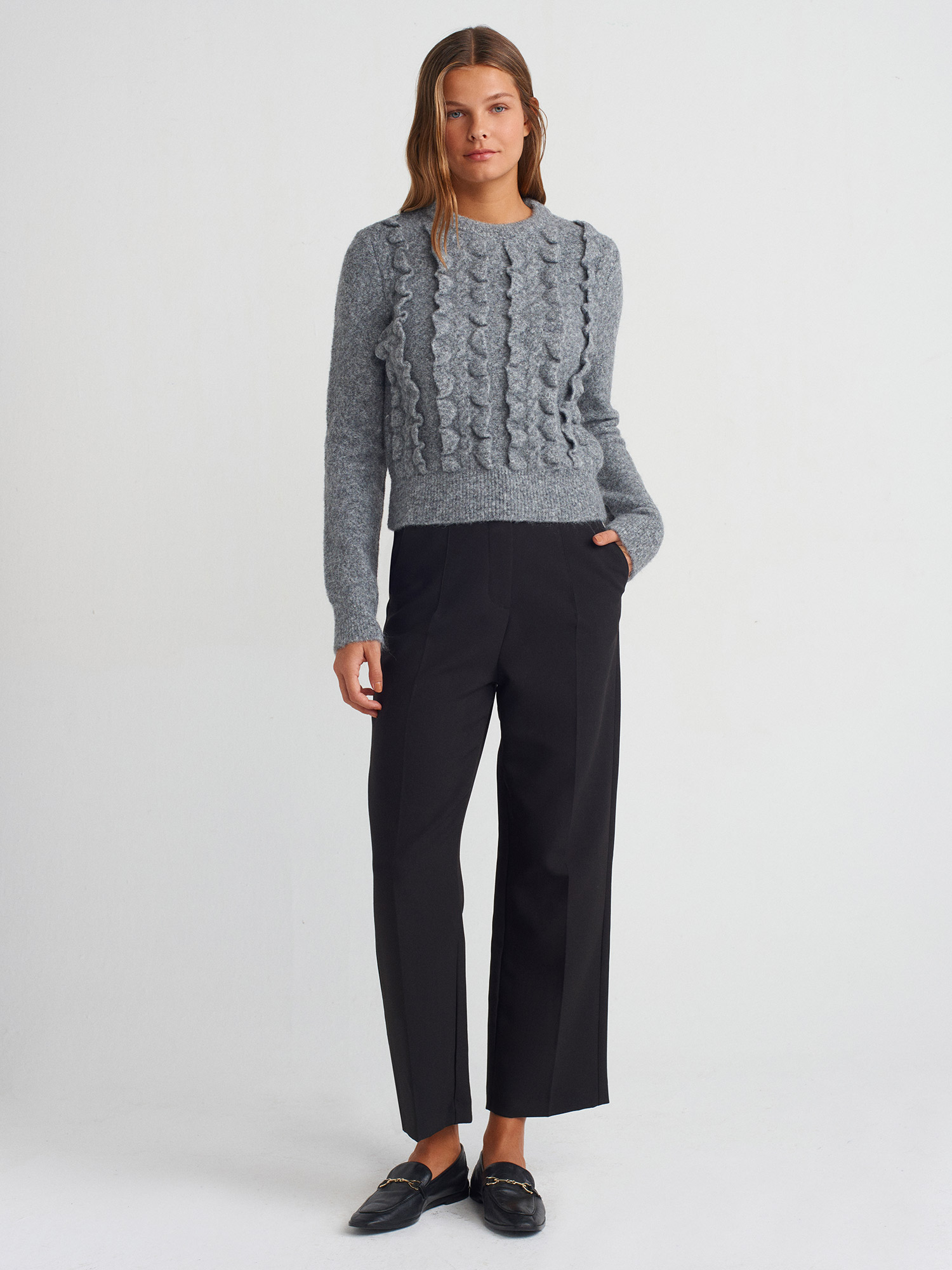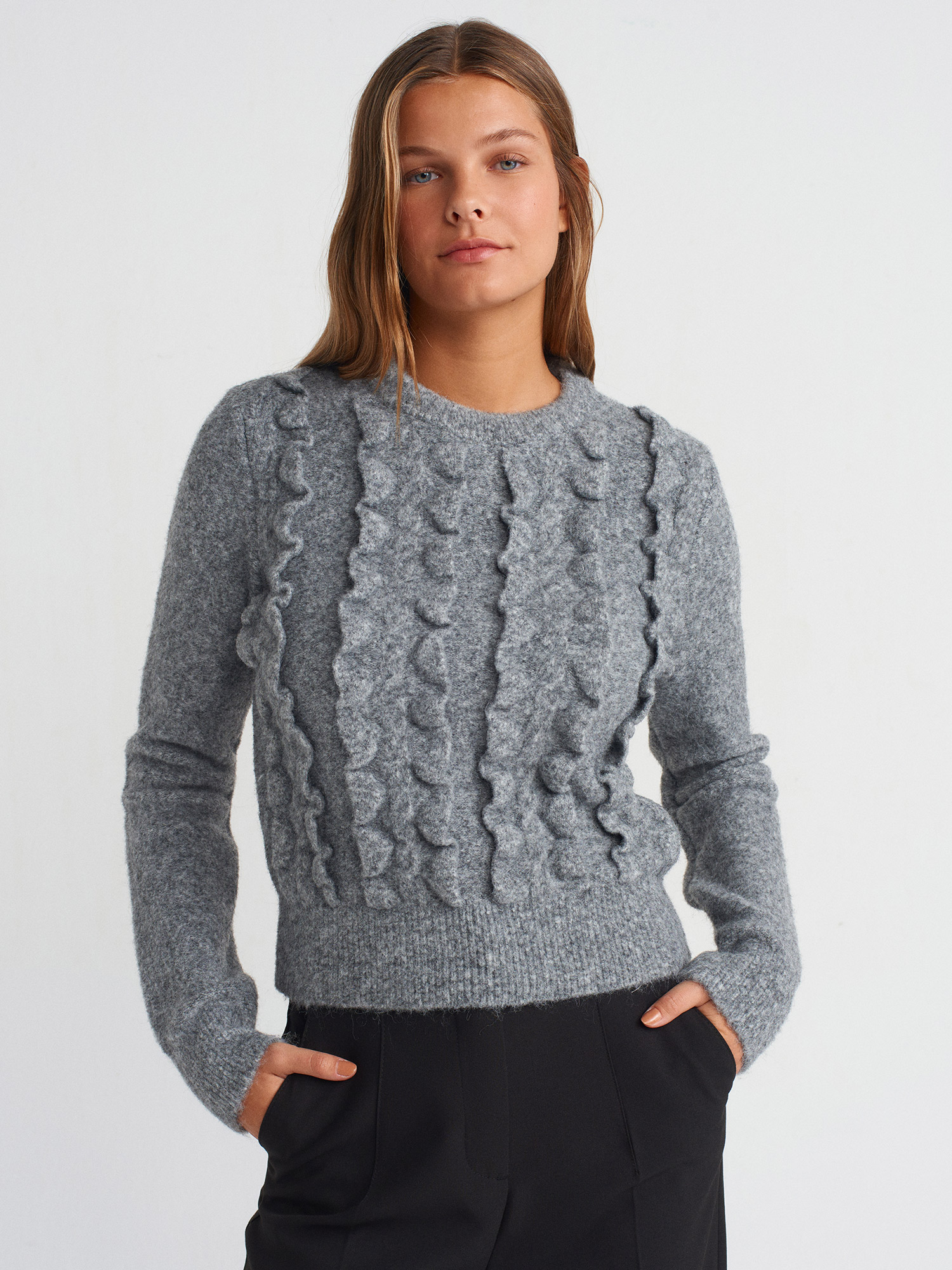 10642 Bisiklet Yaka Fırfırlı Triko Kazak-Füme M.