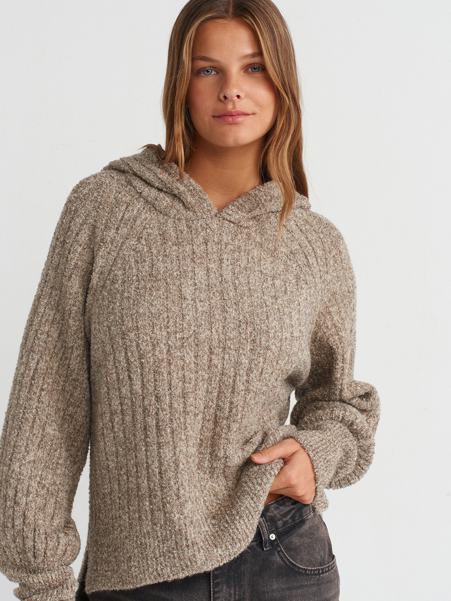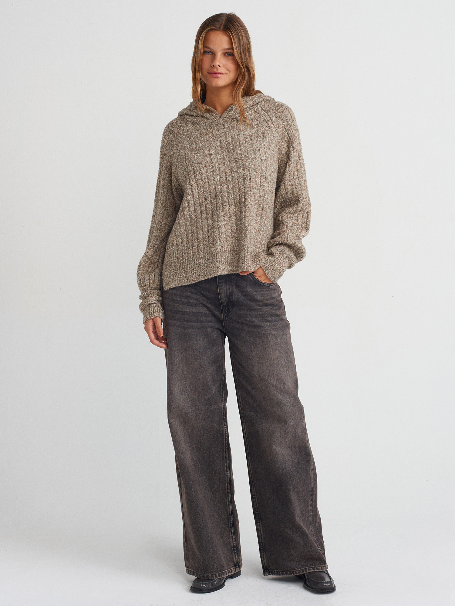 10643 Kapşonlu Yırtmaçlı Muline Triko Kazak-Vizon