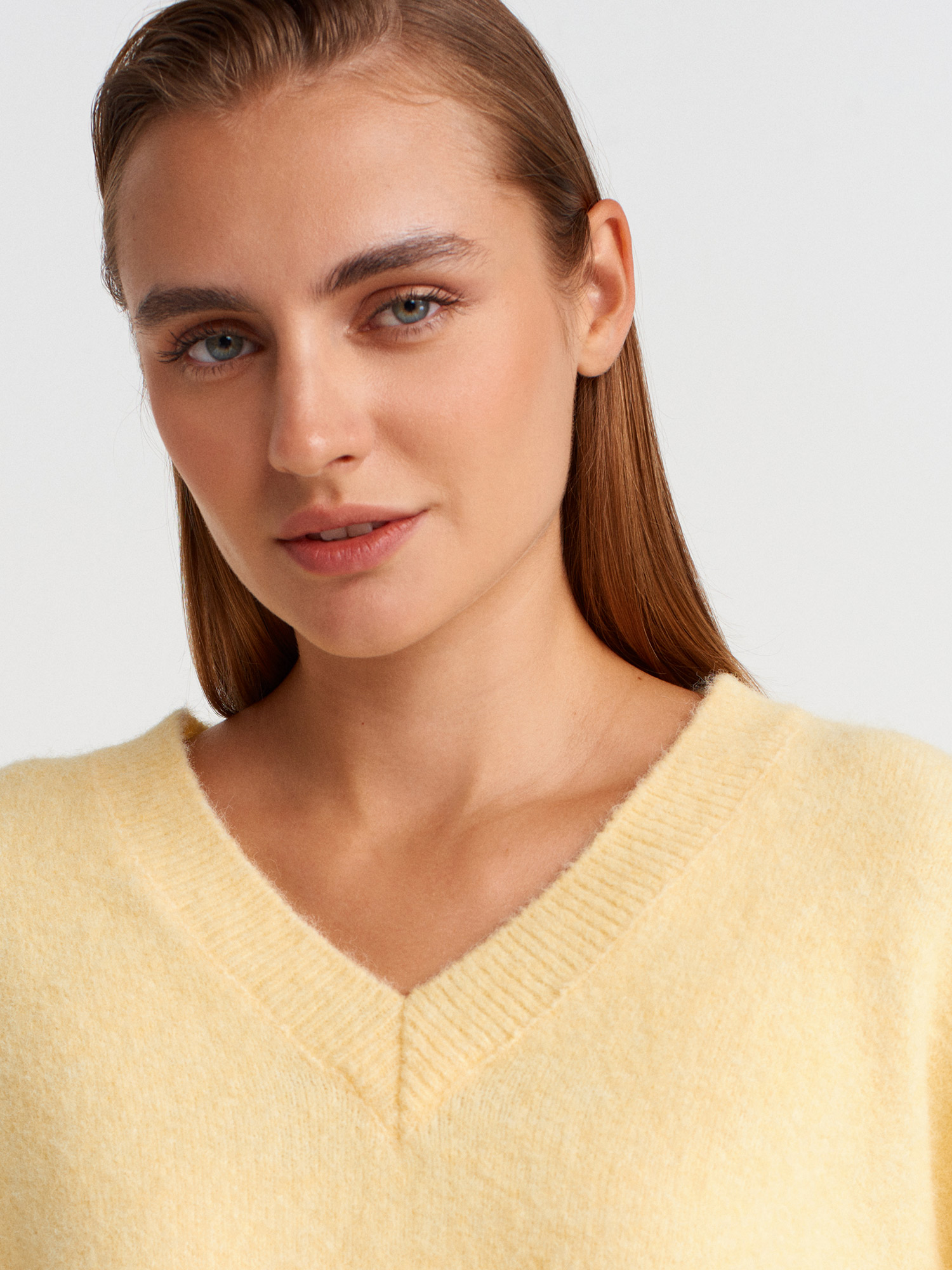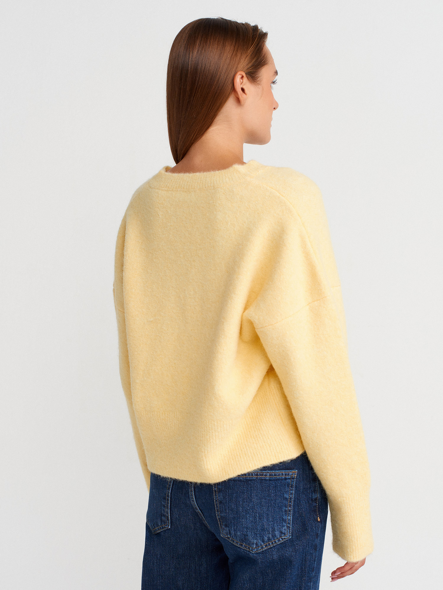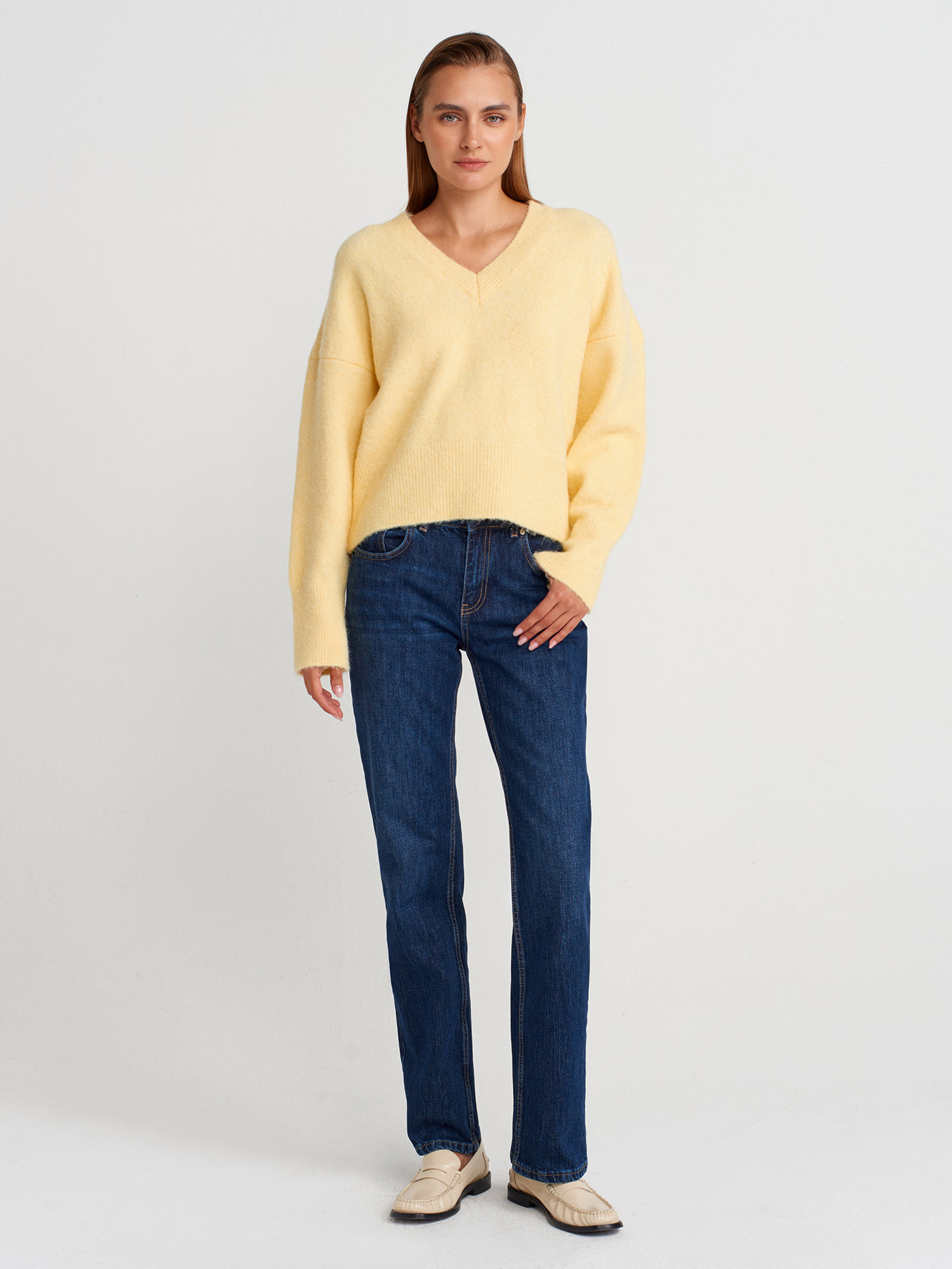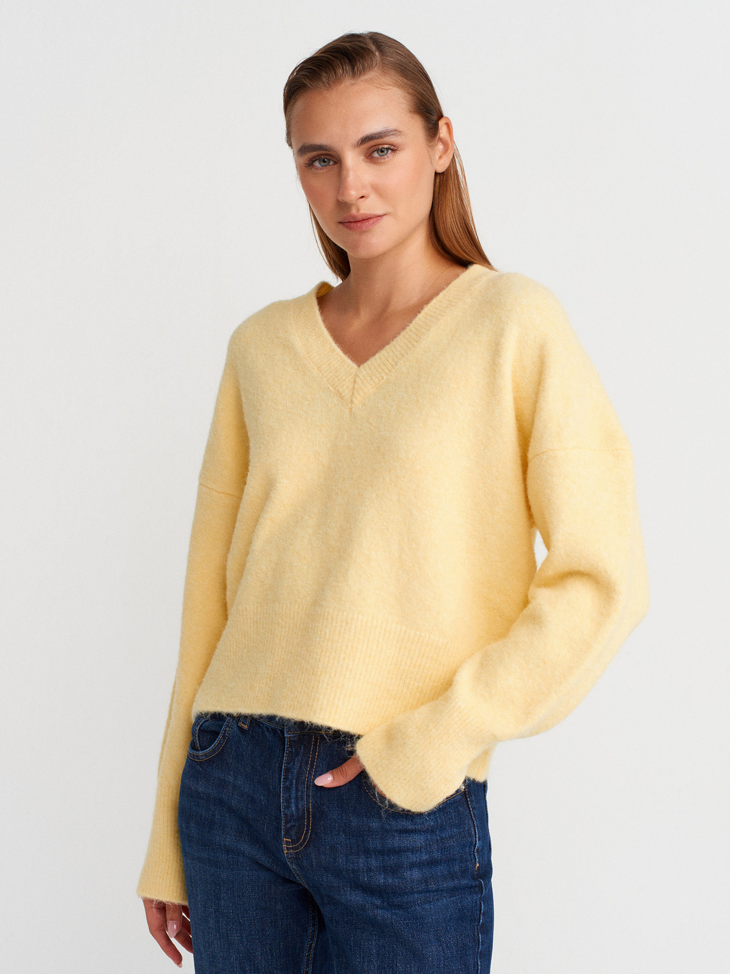 10645 V Yaka Yün Karışımlı Triko Kazak-Açık Sarı