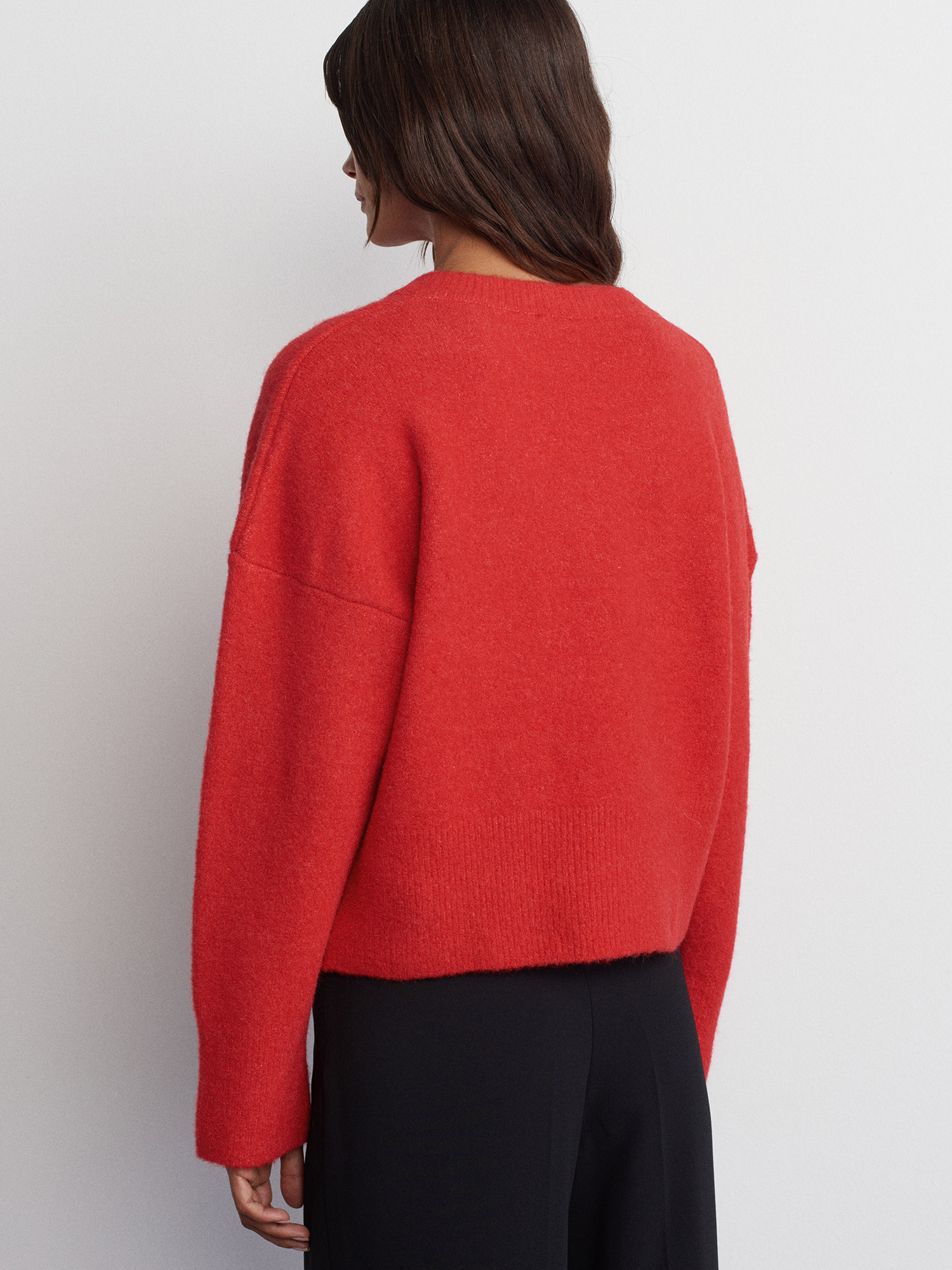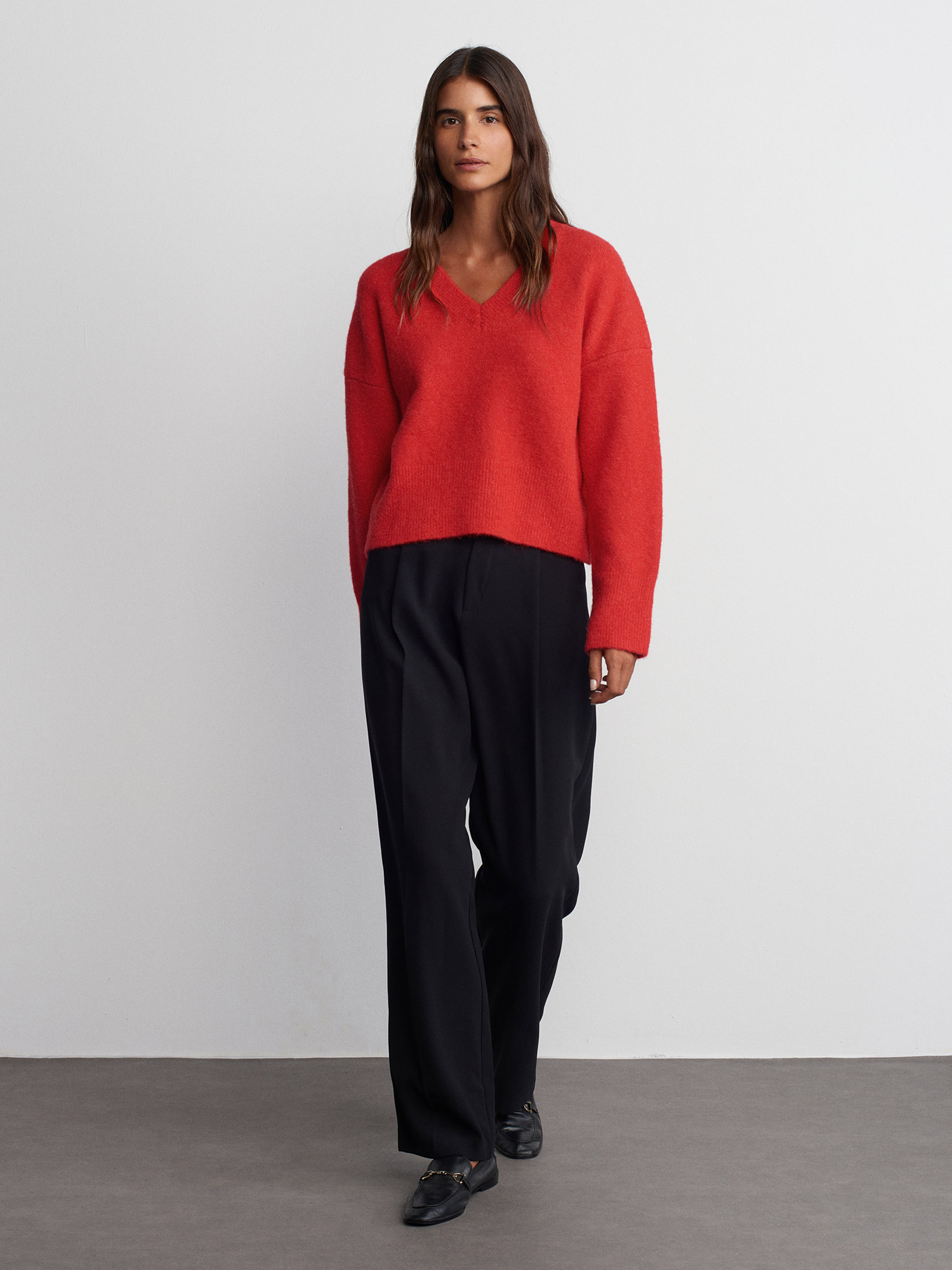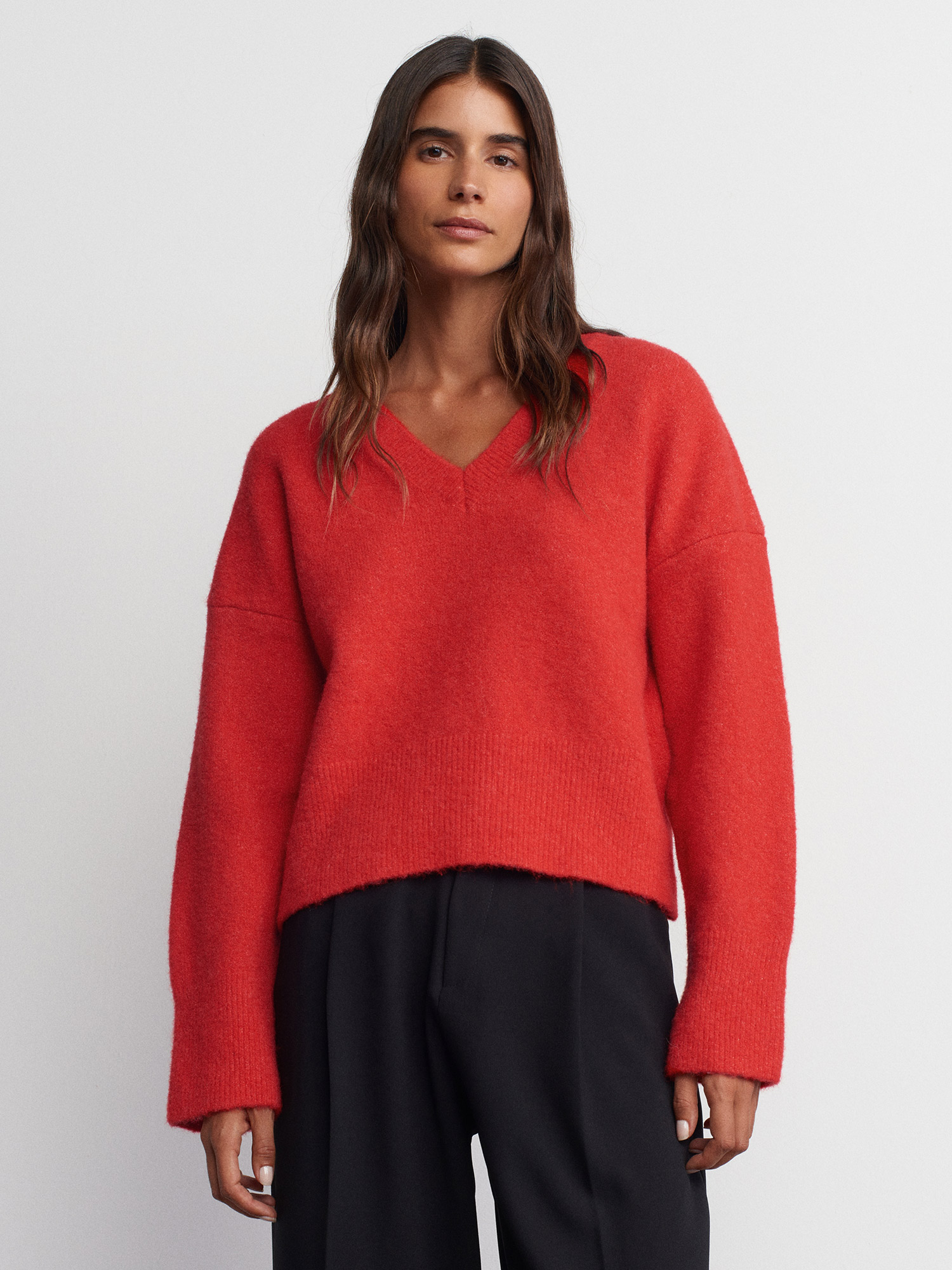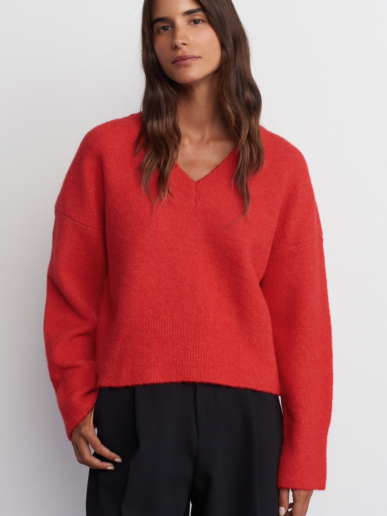 10645 V Yaka Yün Karışımlı Triko Kazak-Kırmızı