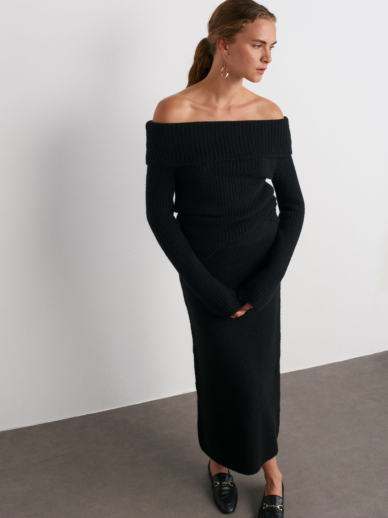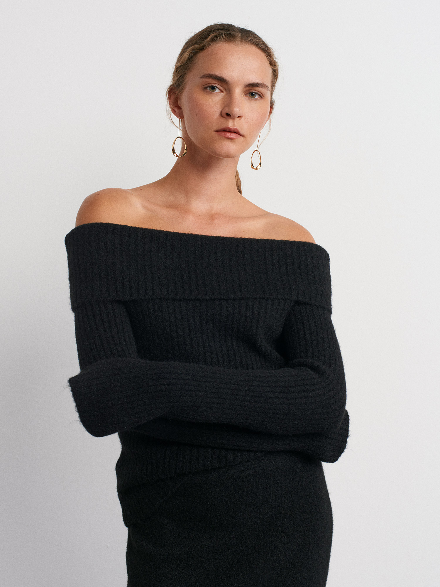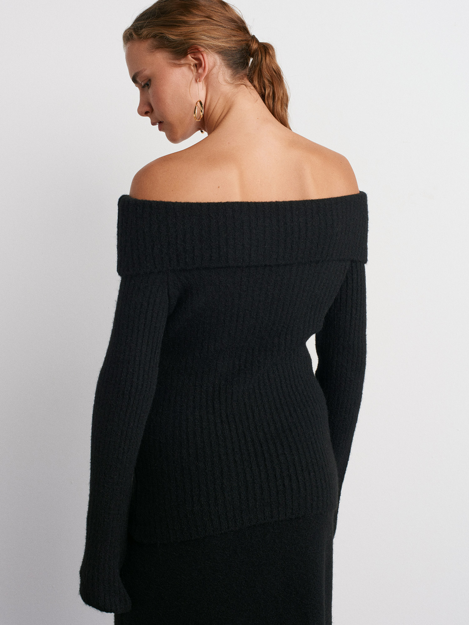 10649 Bardot Yaka Fitilli Triko Kazak-Siyah