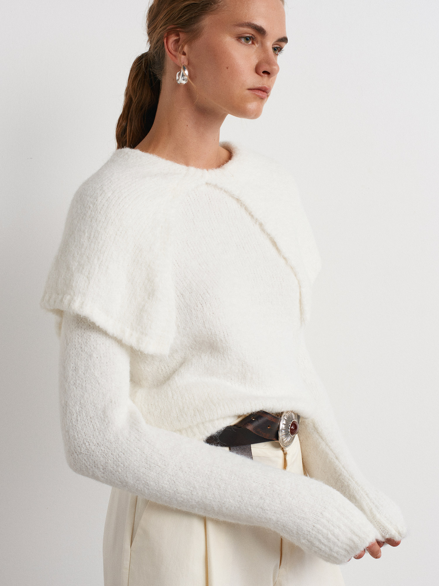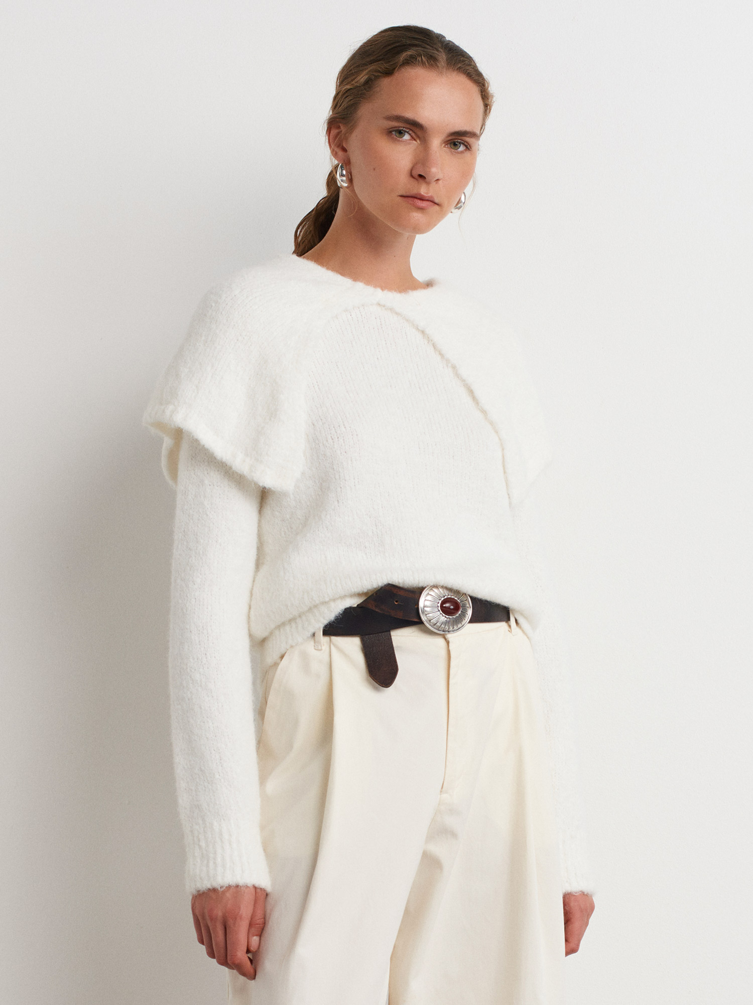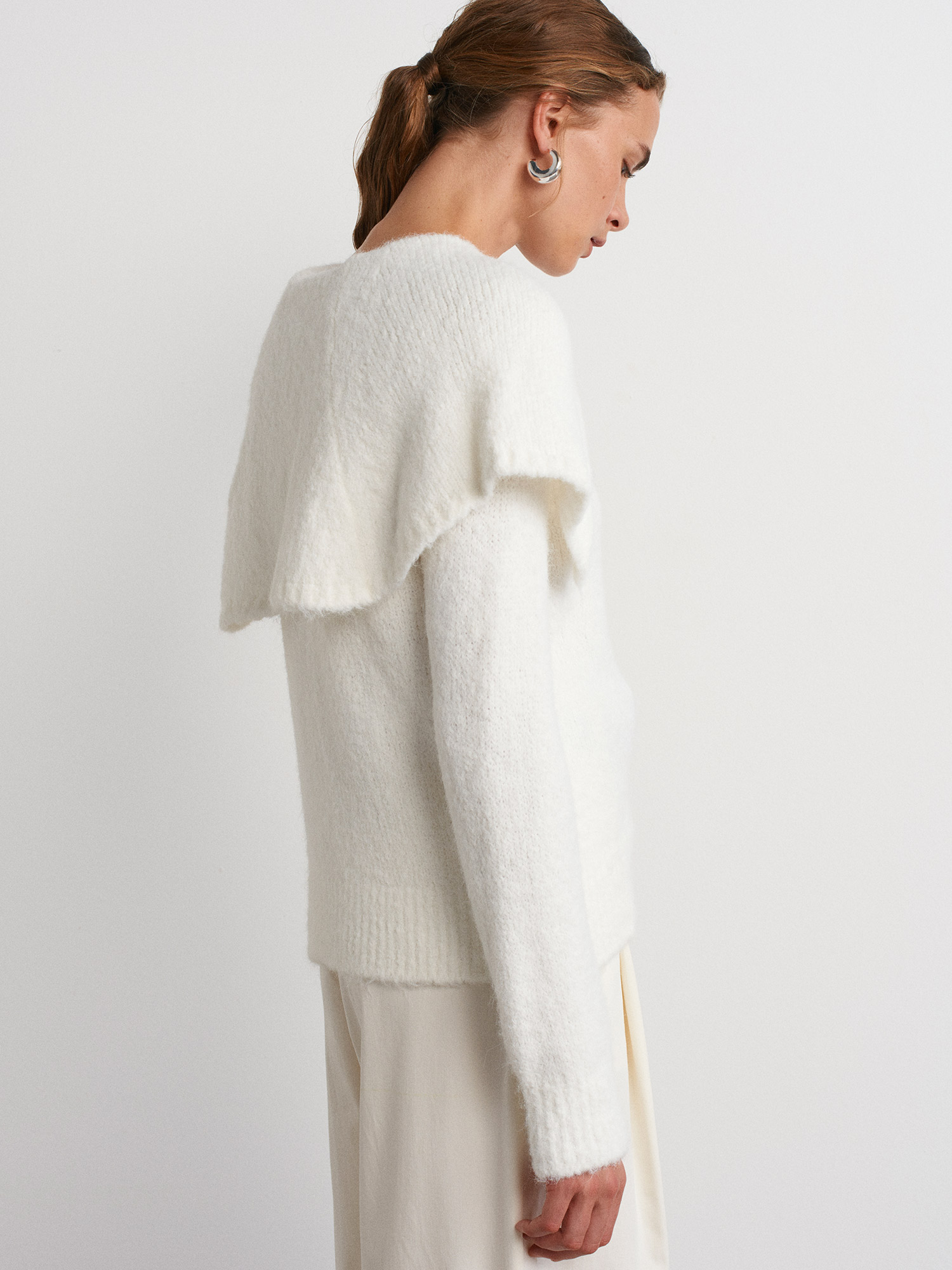 10652 Yumuşak Dokulu Pelerin Detaylı Triko Kazak-Ekru