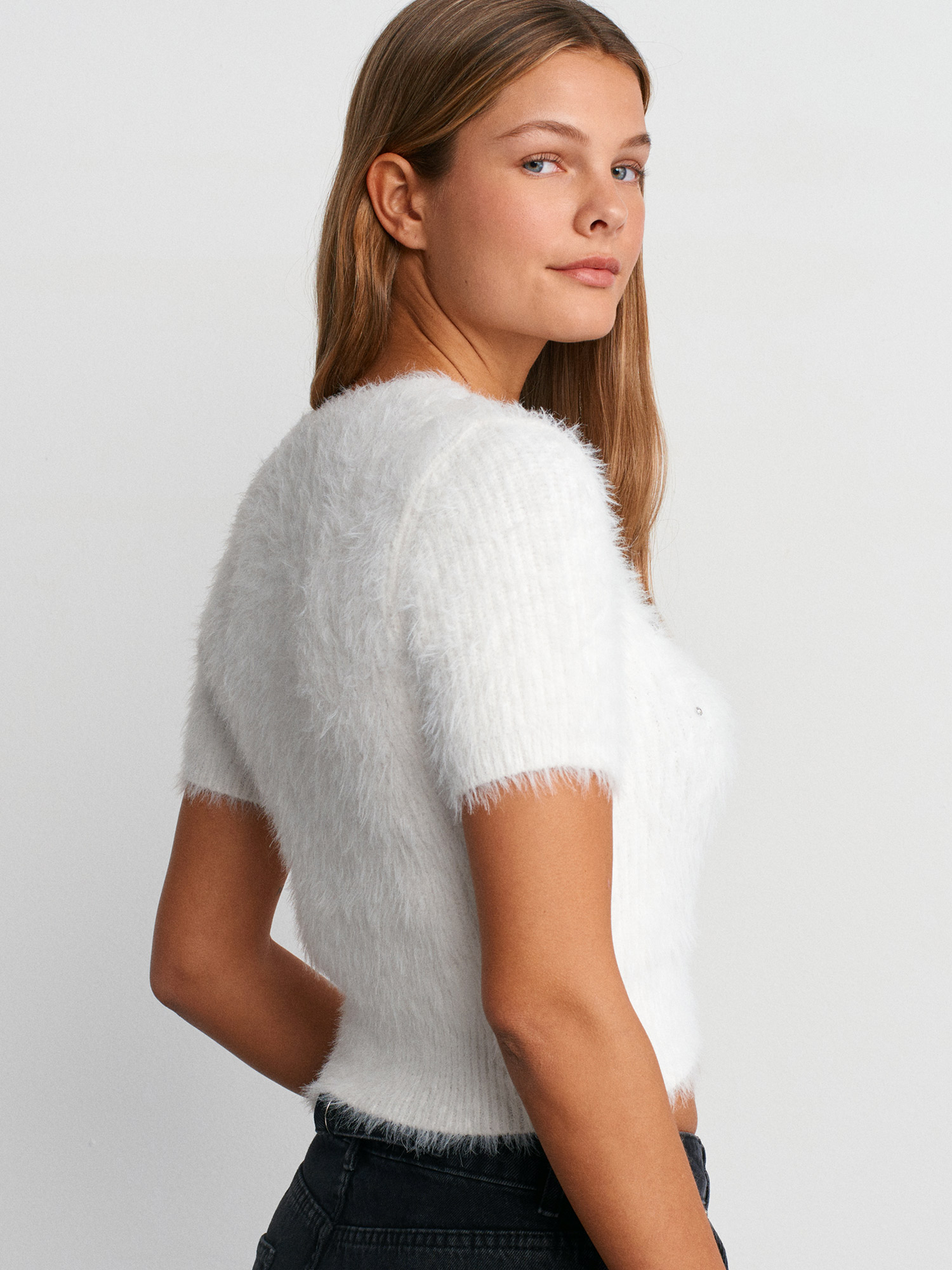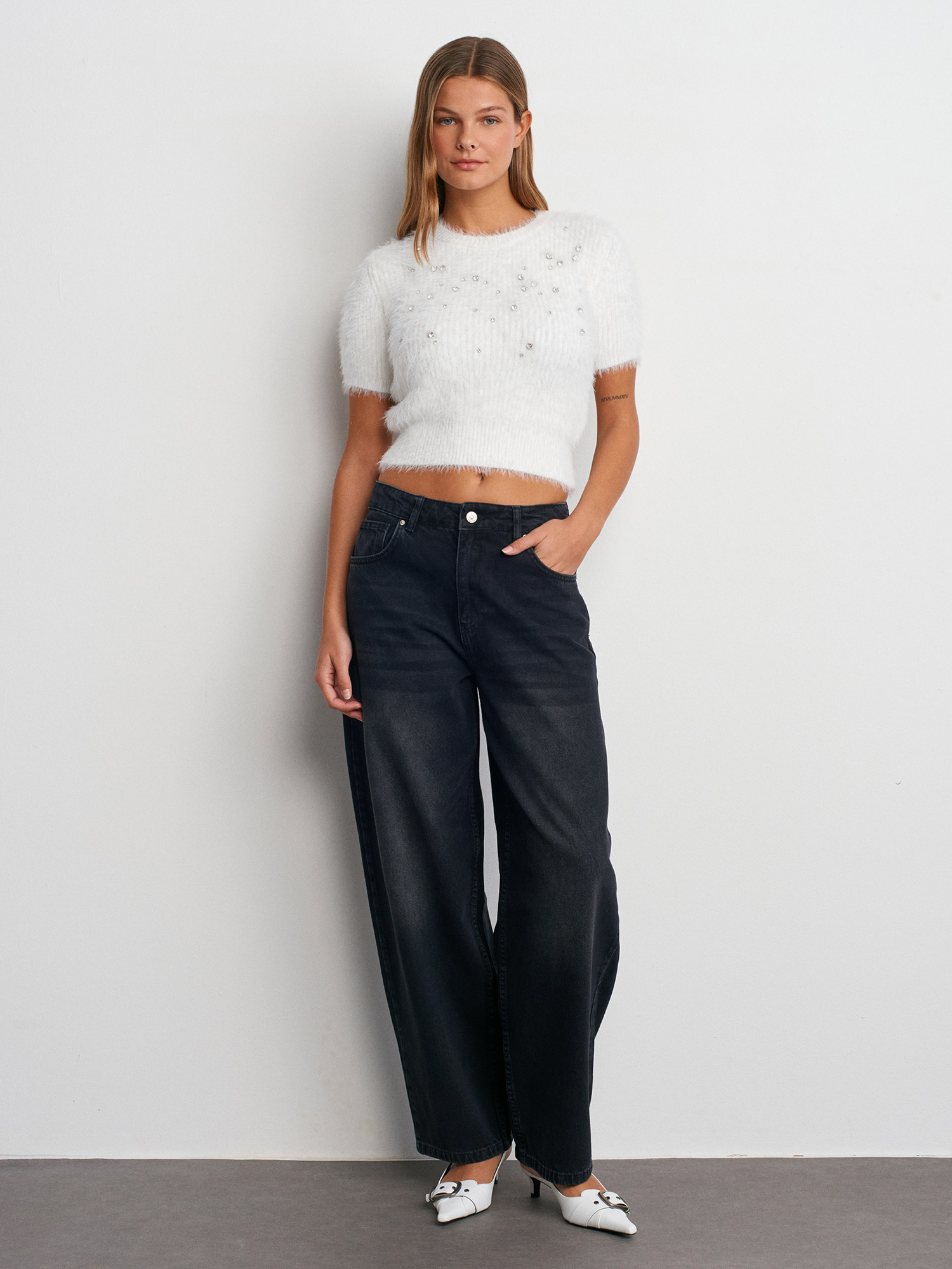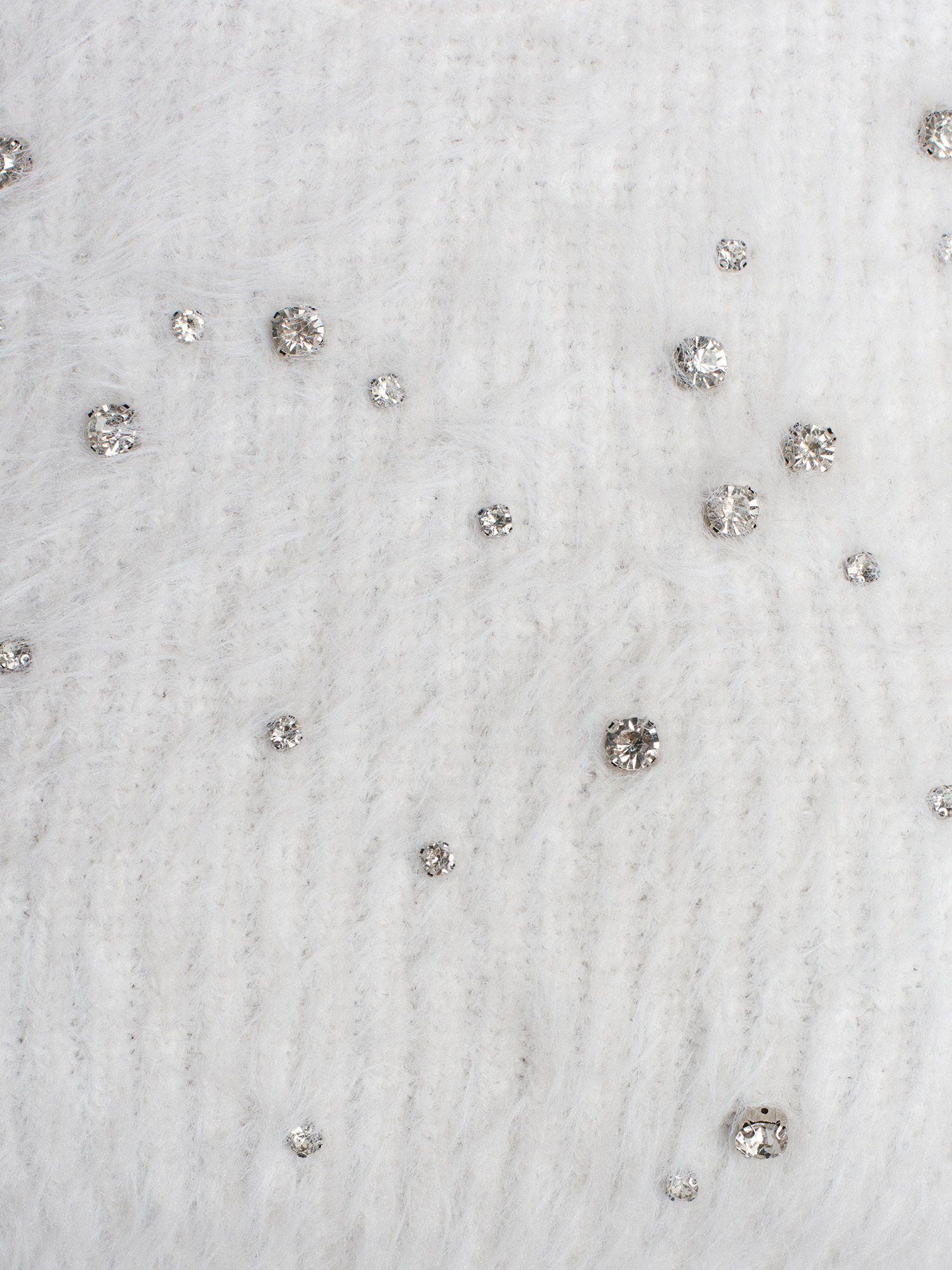 10662 Bisiklet Yaka Taşlı Yumuşak Dokulu Parlak Triko Kazak-Ekru