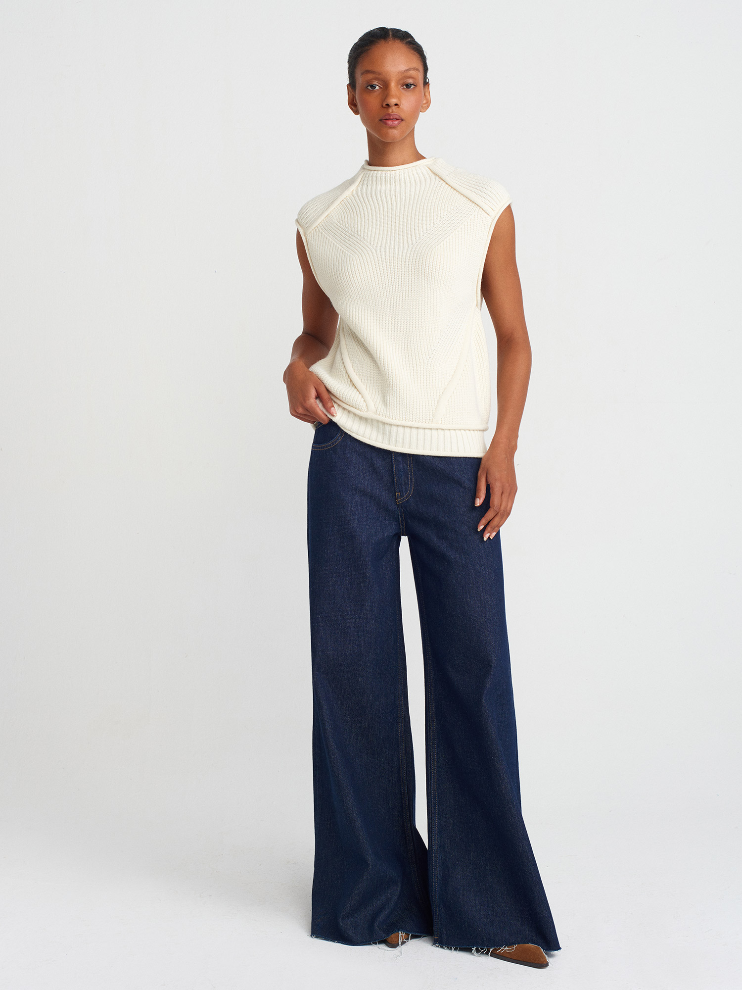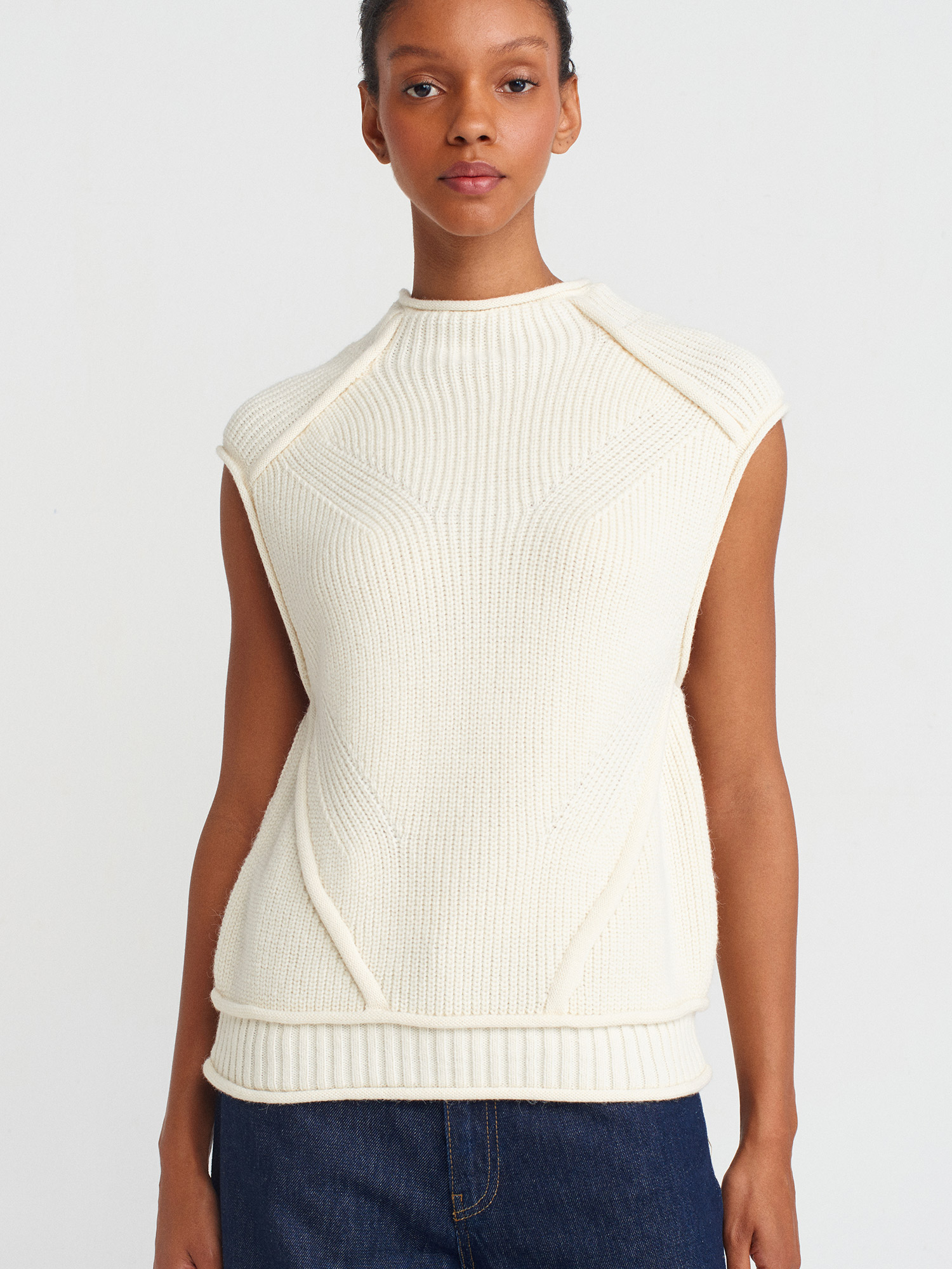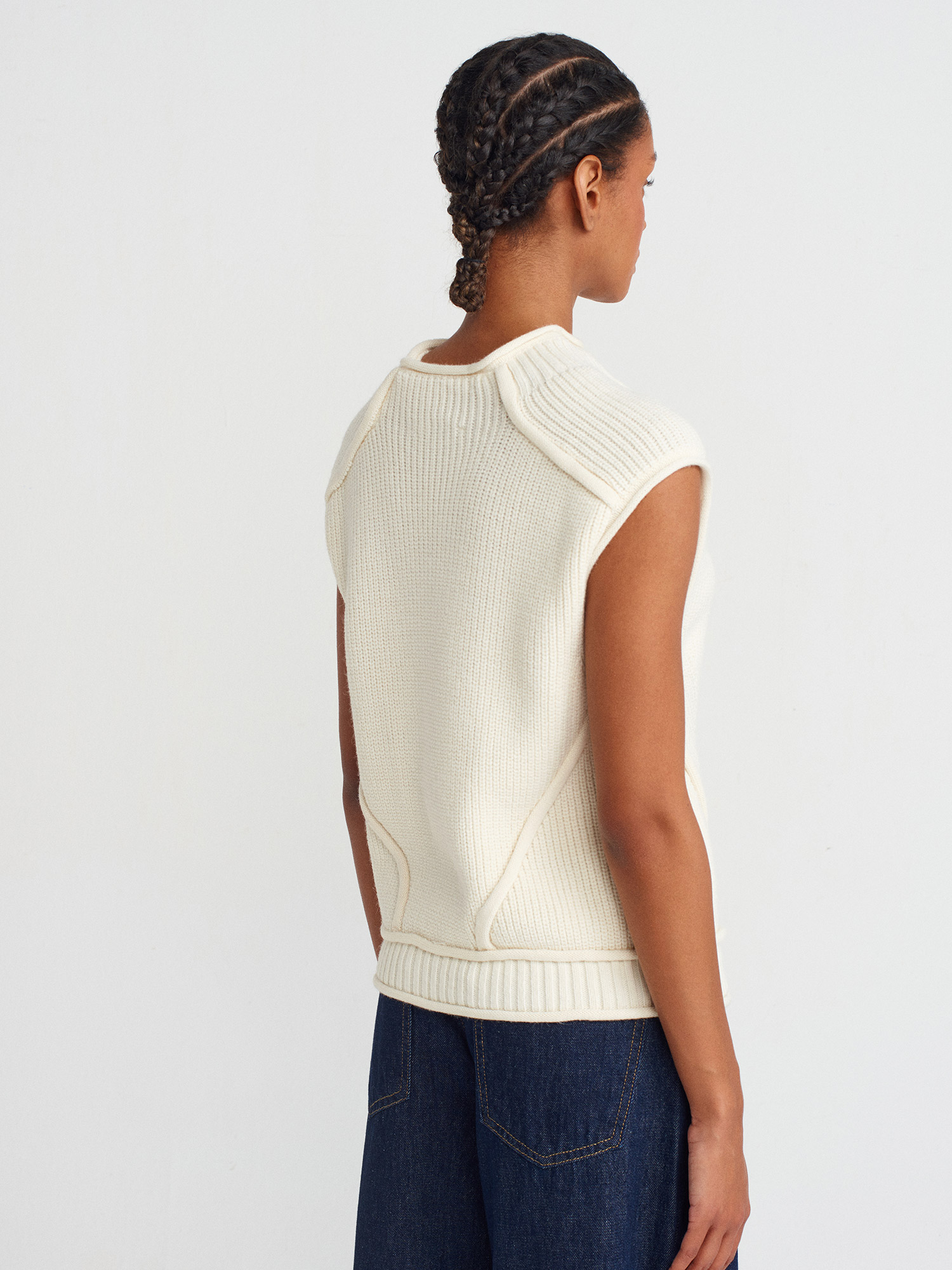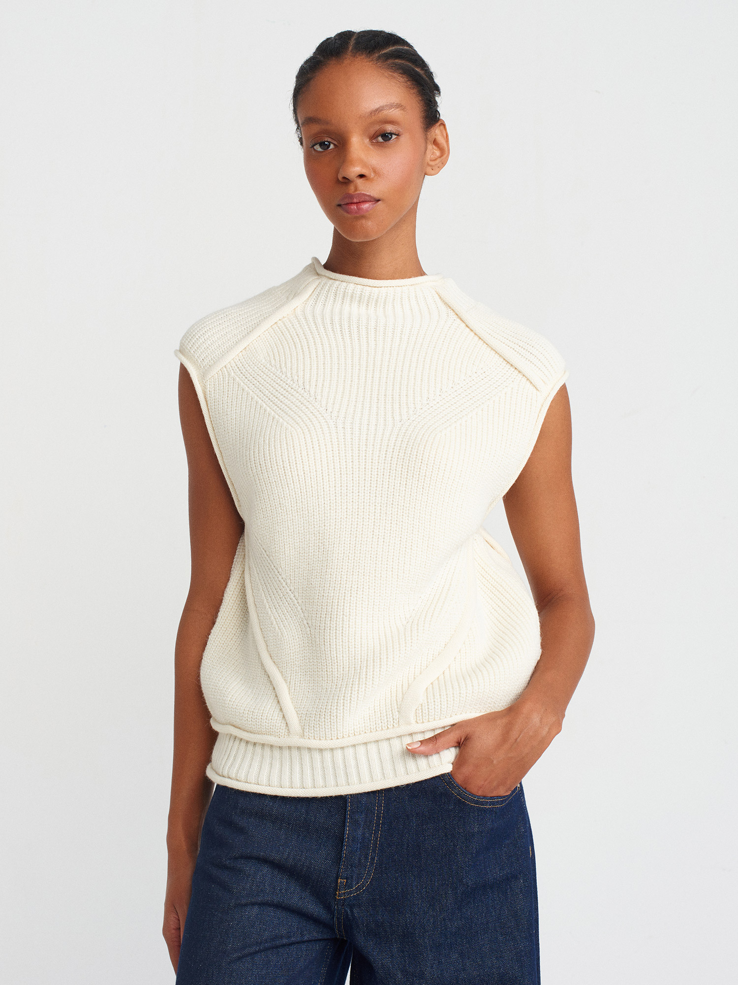 10669 Dik Yaka Dikiş Örgü Detaylı Triko Süveter-Ekru