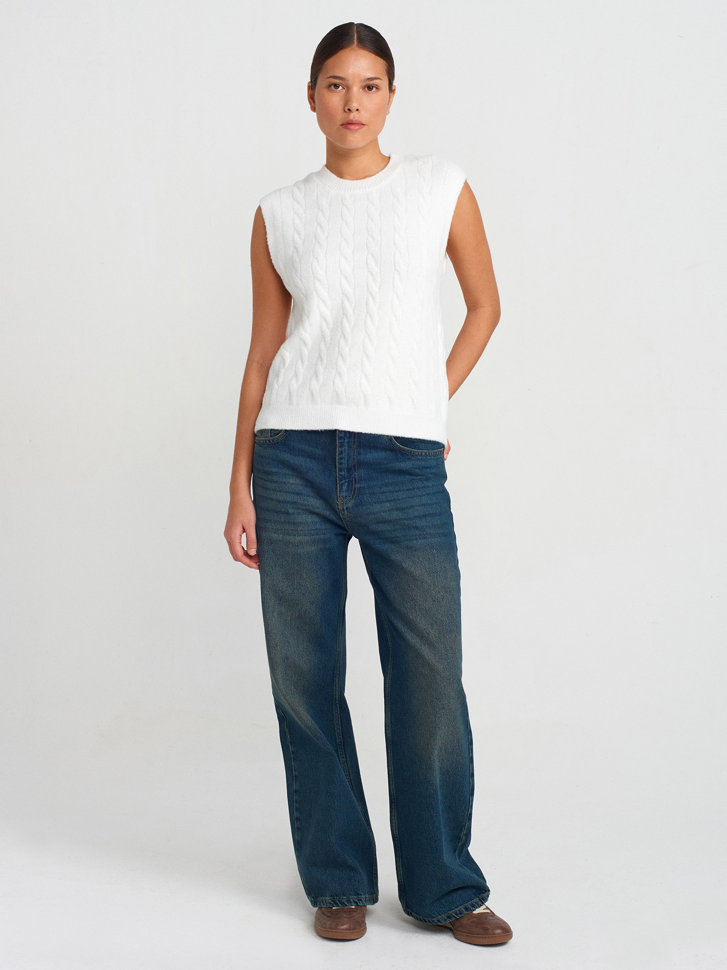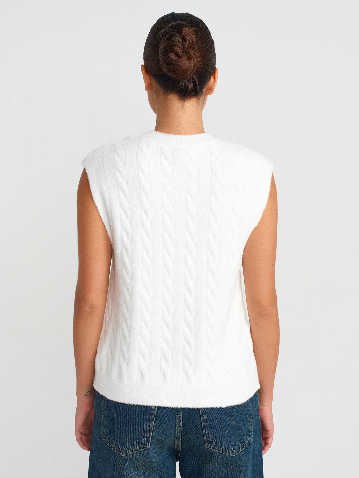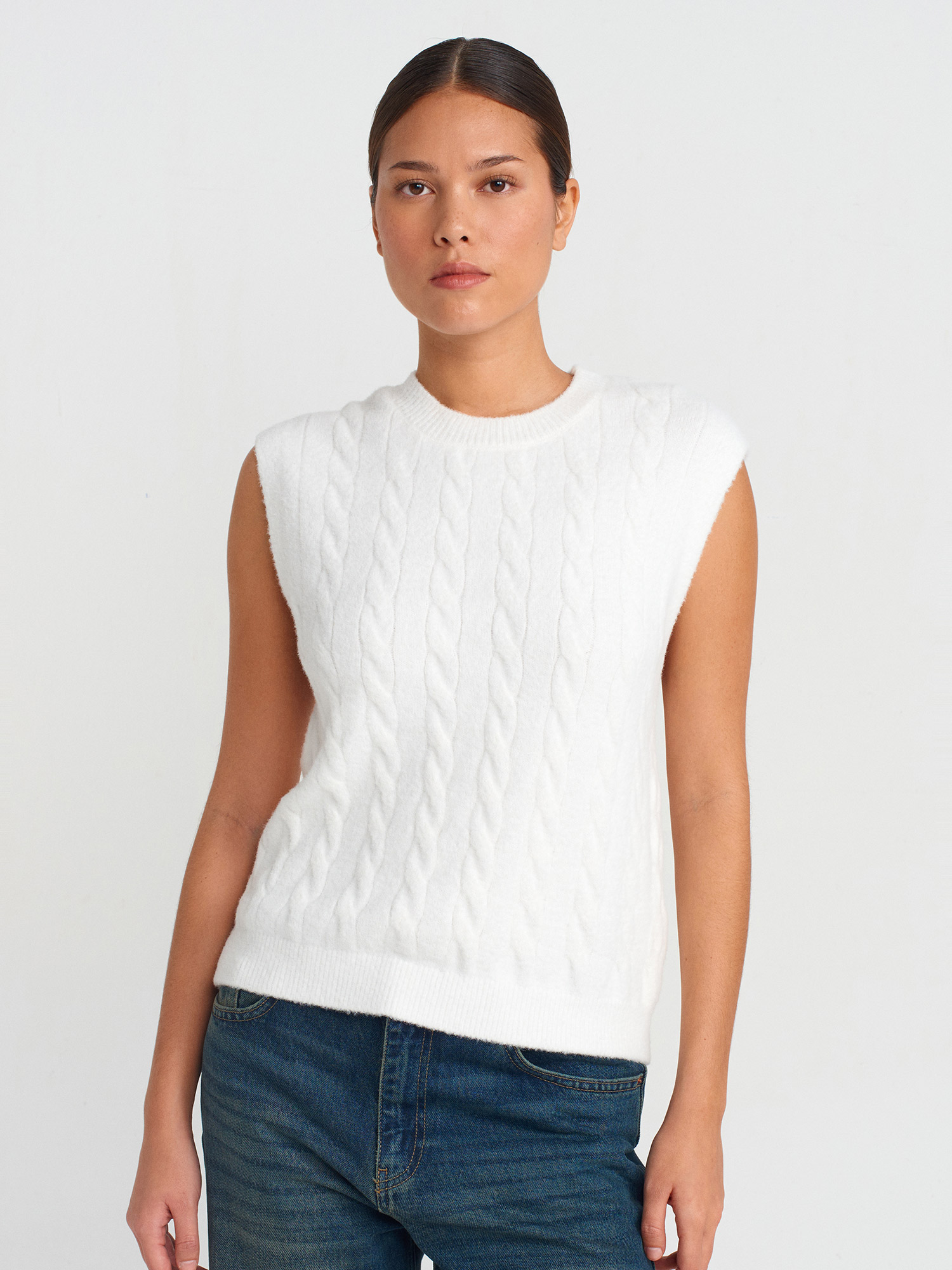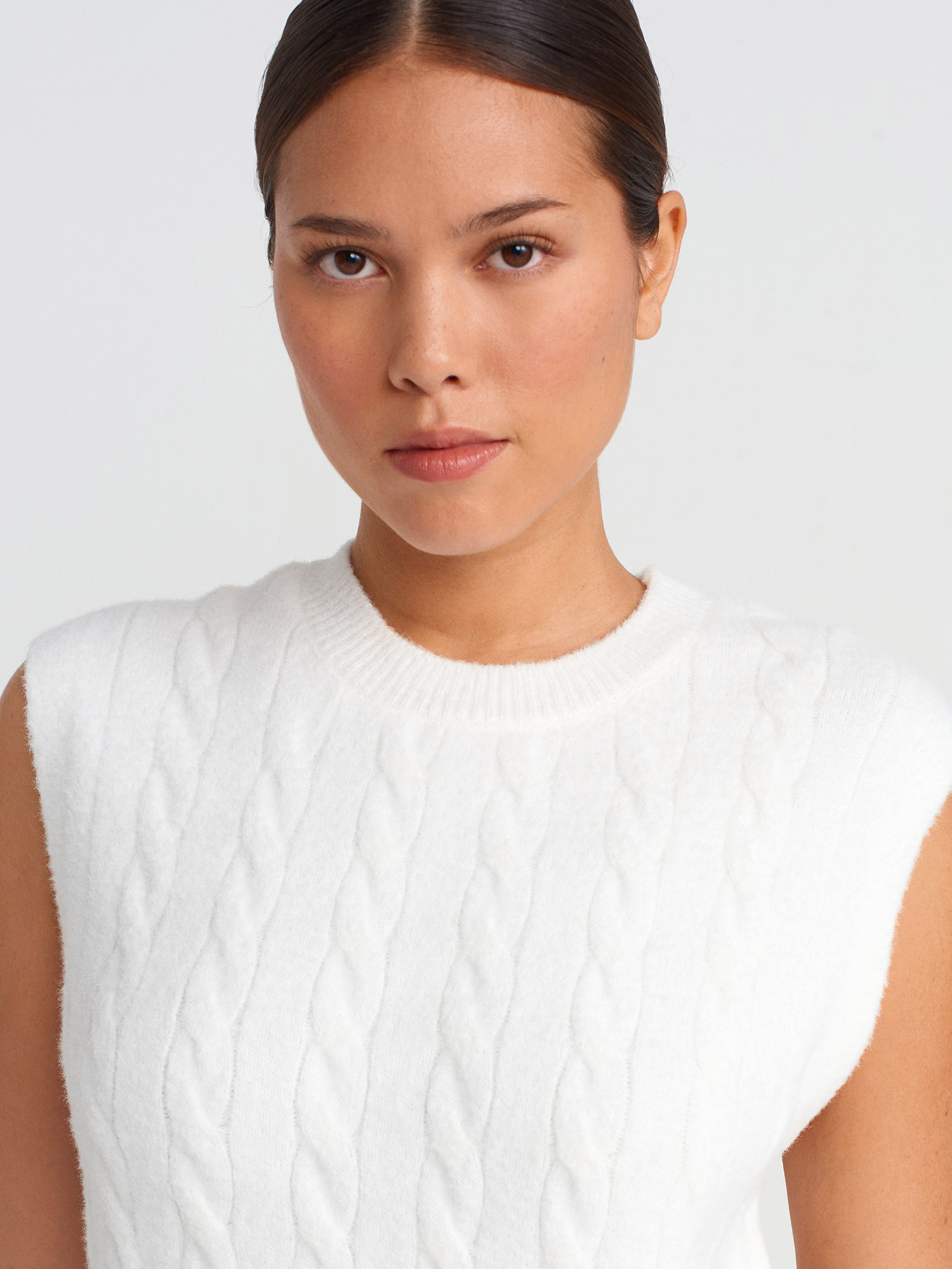 10674 Bisiklet Yaka Saç Örgü Yumuşak Dokulu Triko Süveter-Ekru