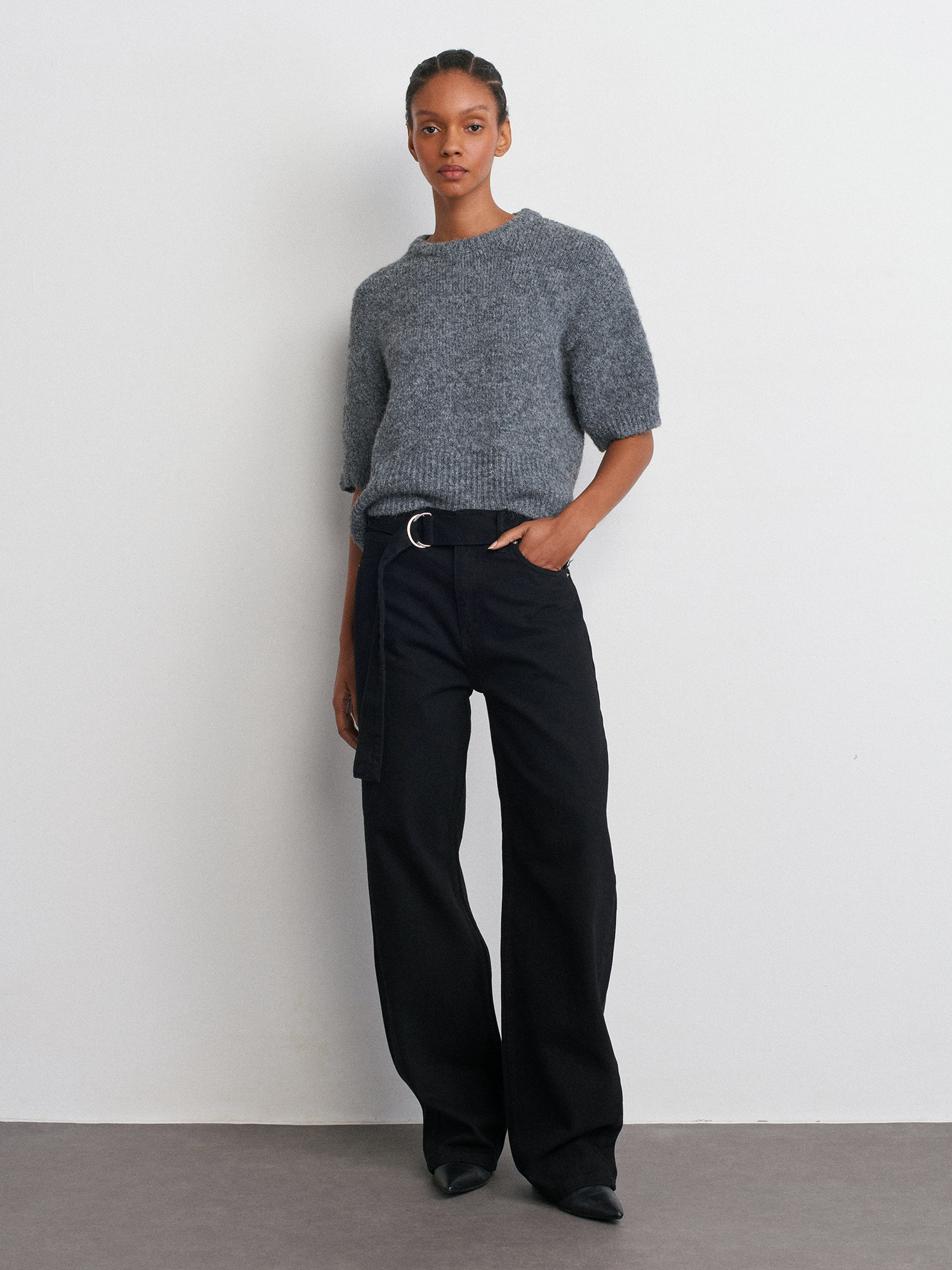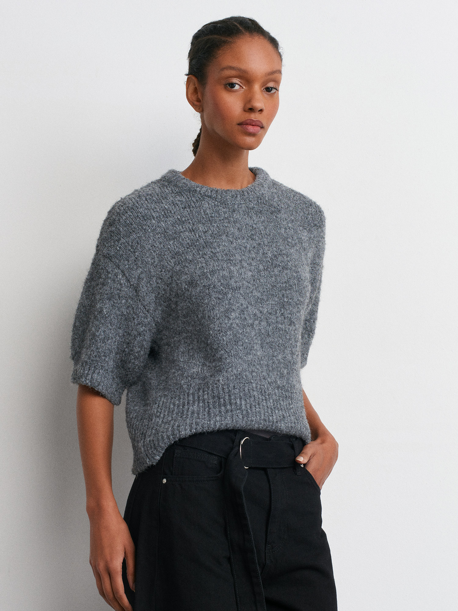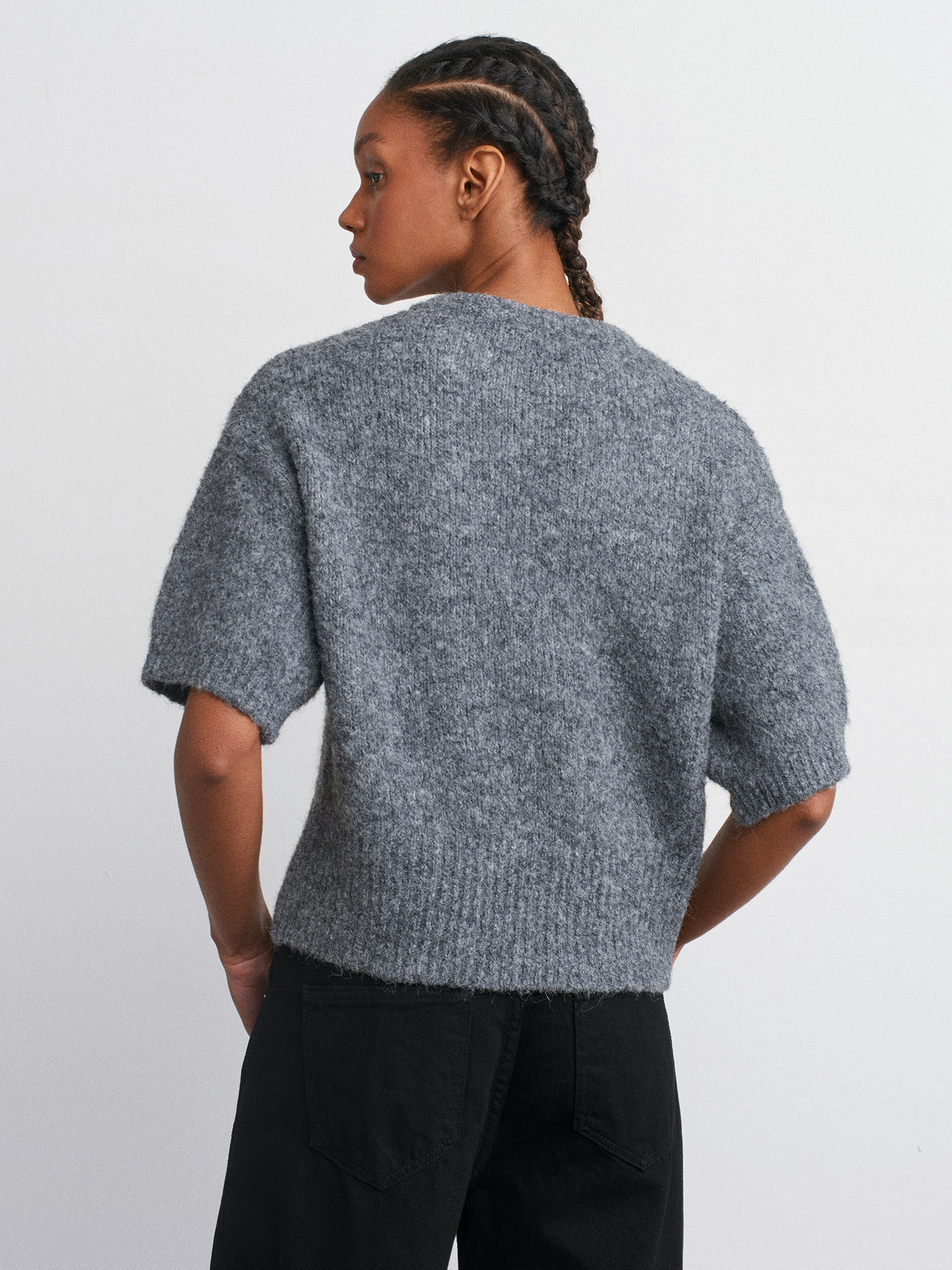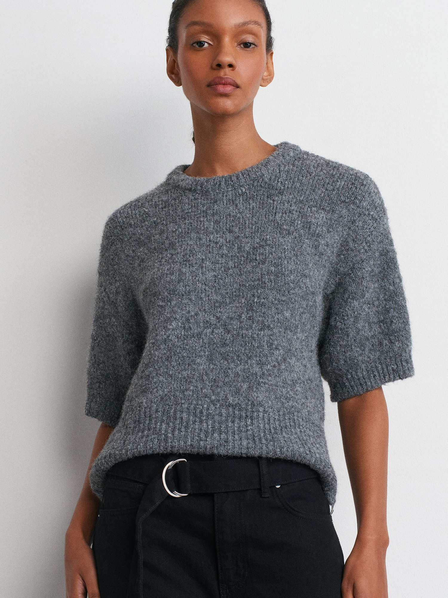10677 Bisiklet Yaka Yumuşak Dokulu Kısa Kollu Triko Kazak-Füme M.