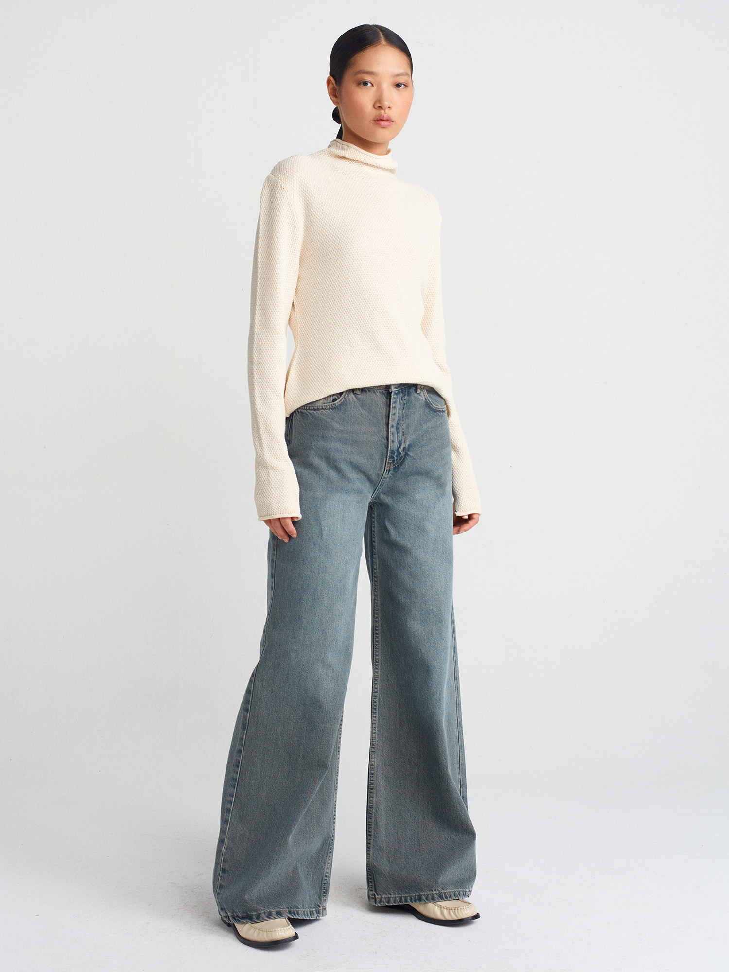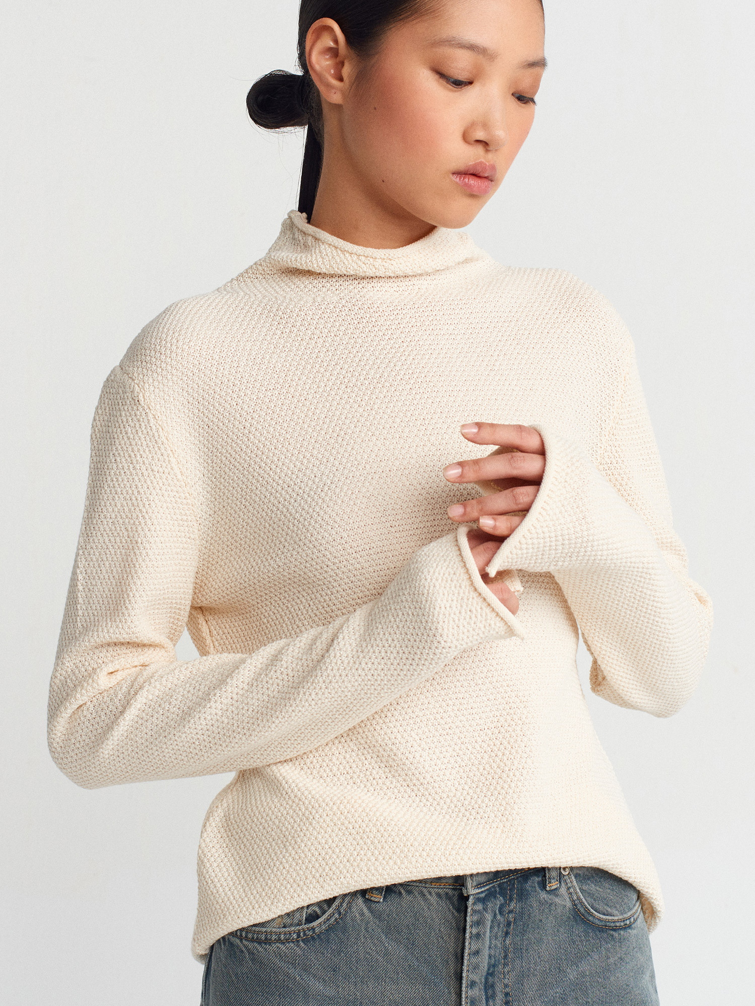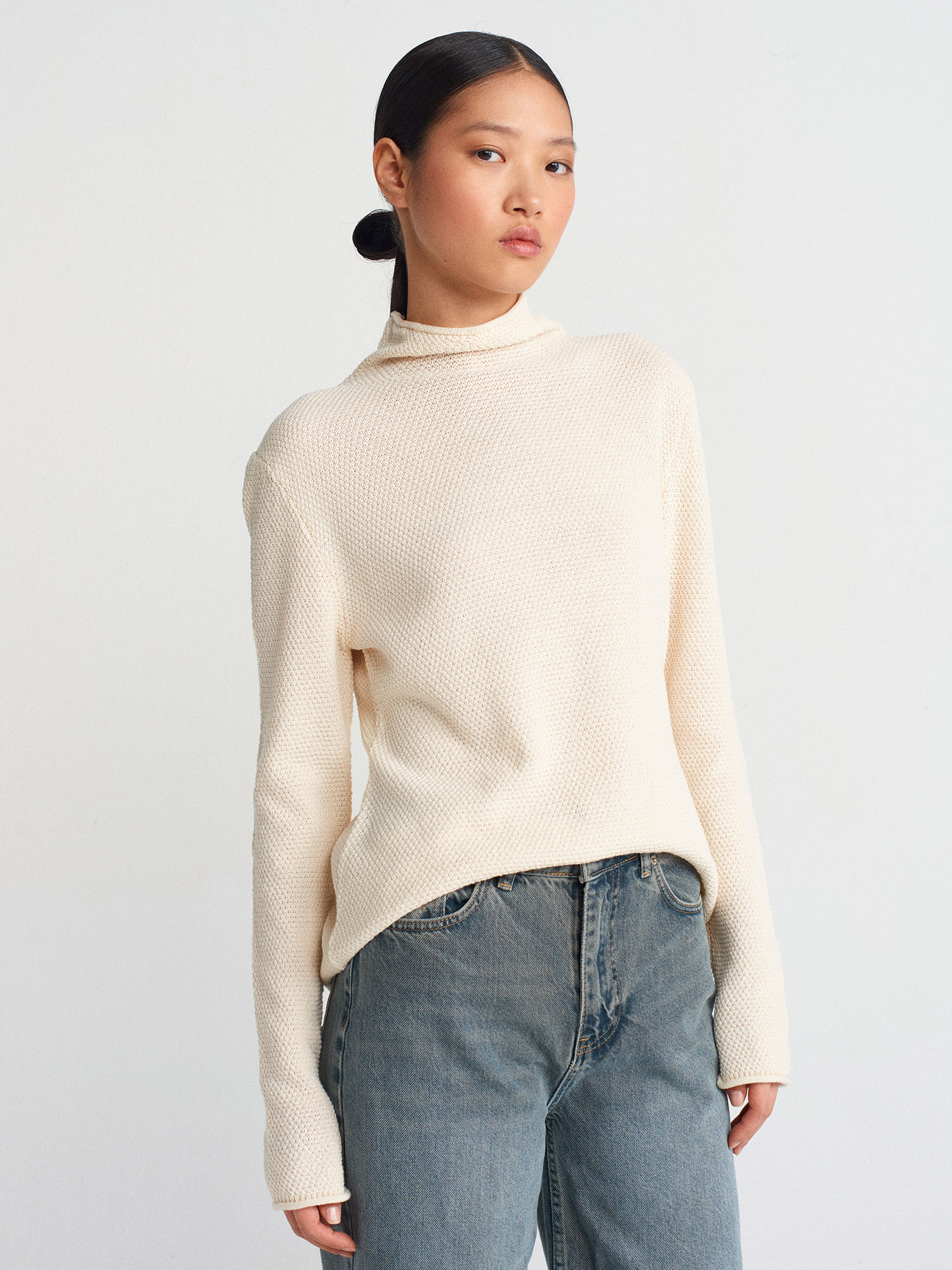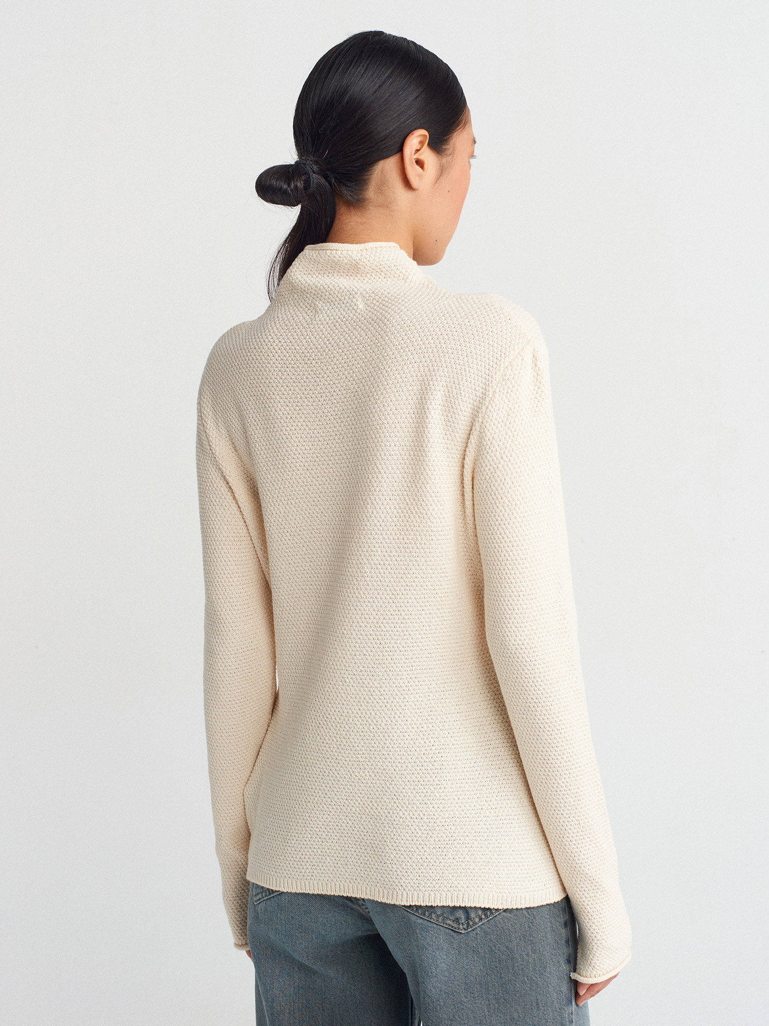 10681 Dik Yaka İnce Dokulu Triko Kazak-Ekru