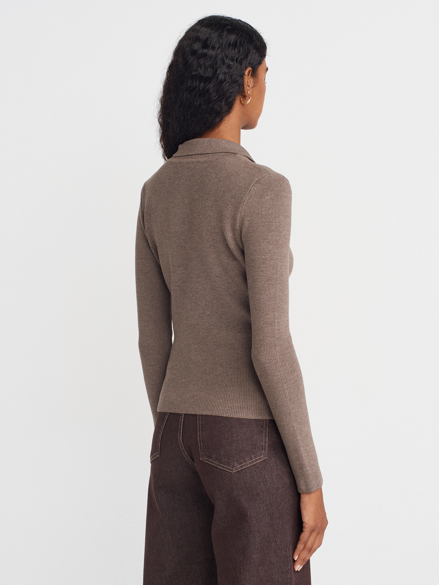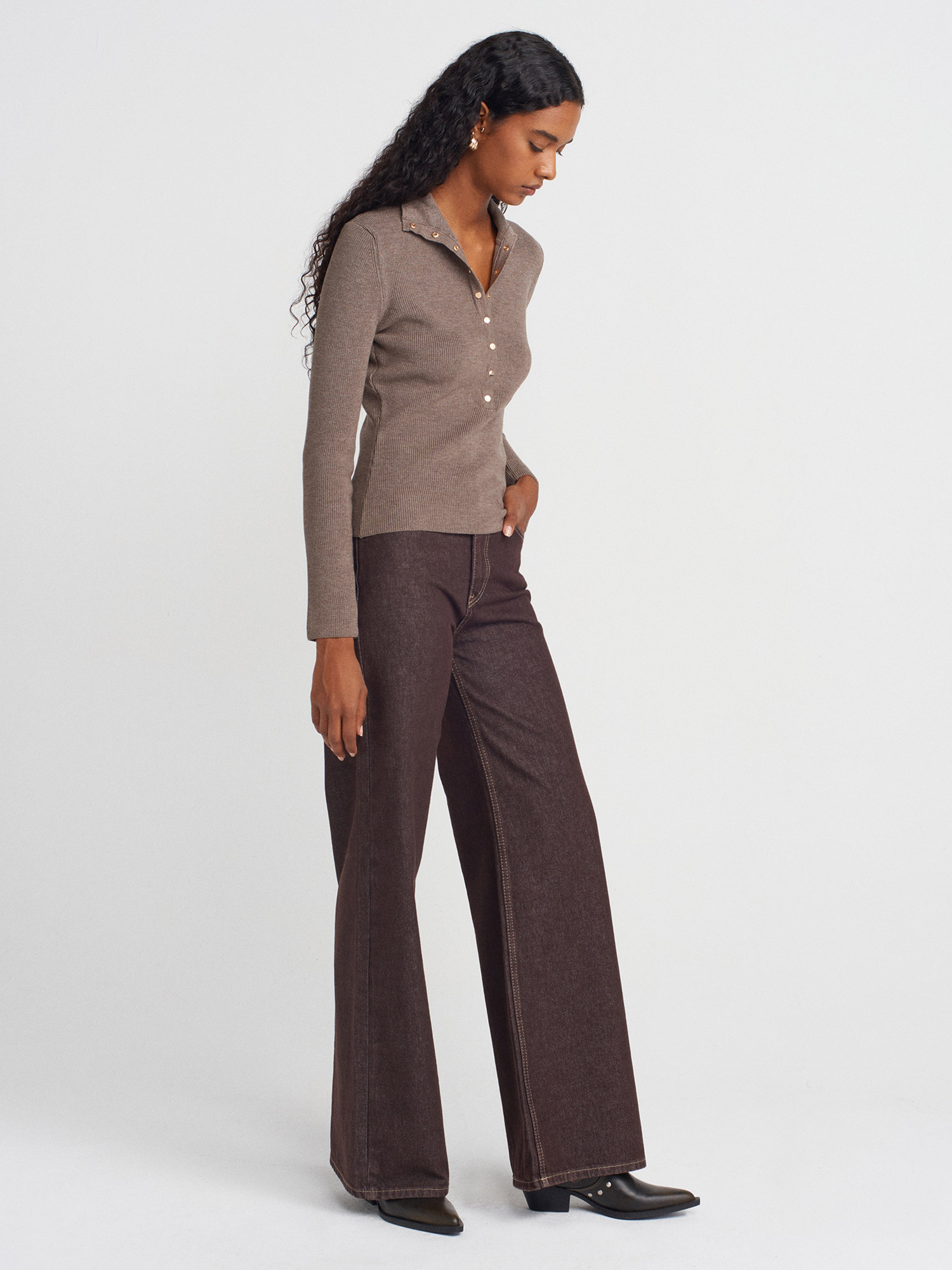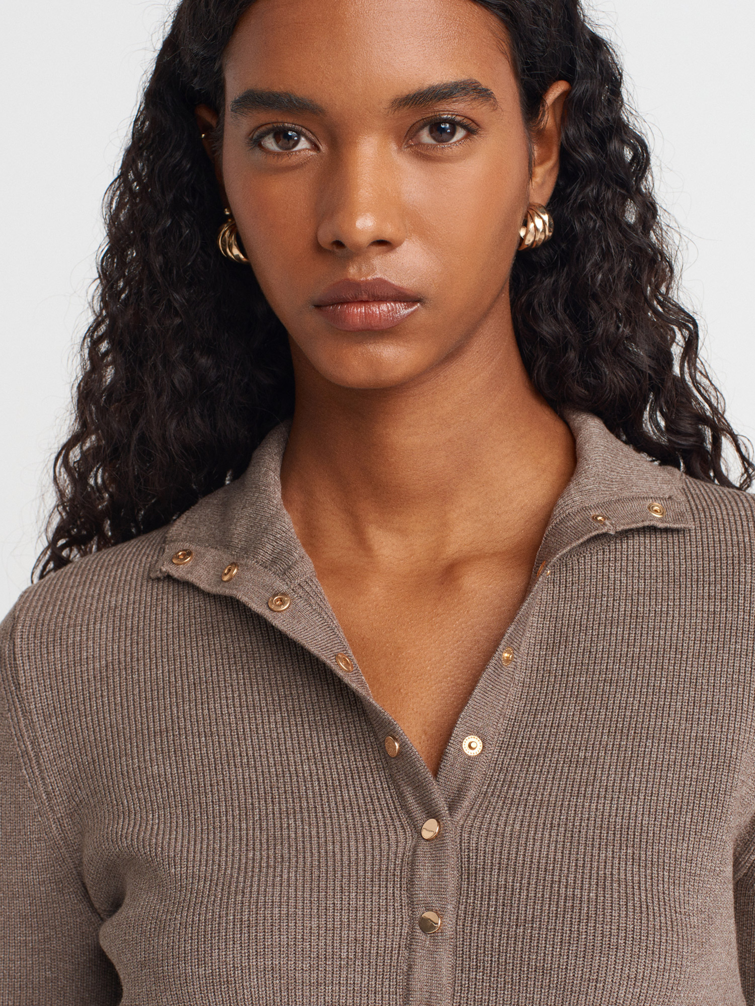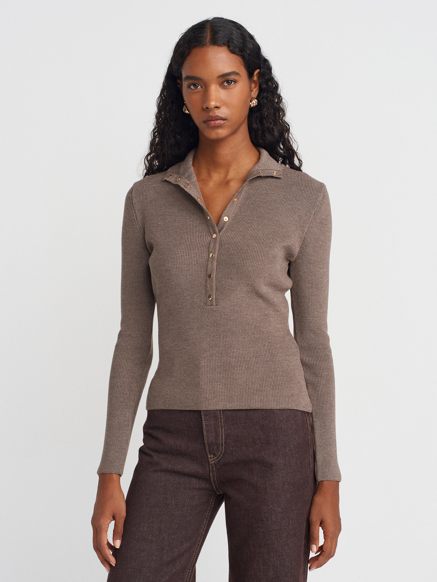 10686 Dik Yaka Çıtçıtlı Triko Kazak-Vizon