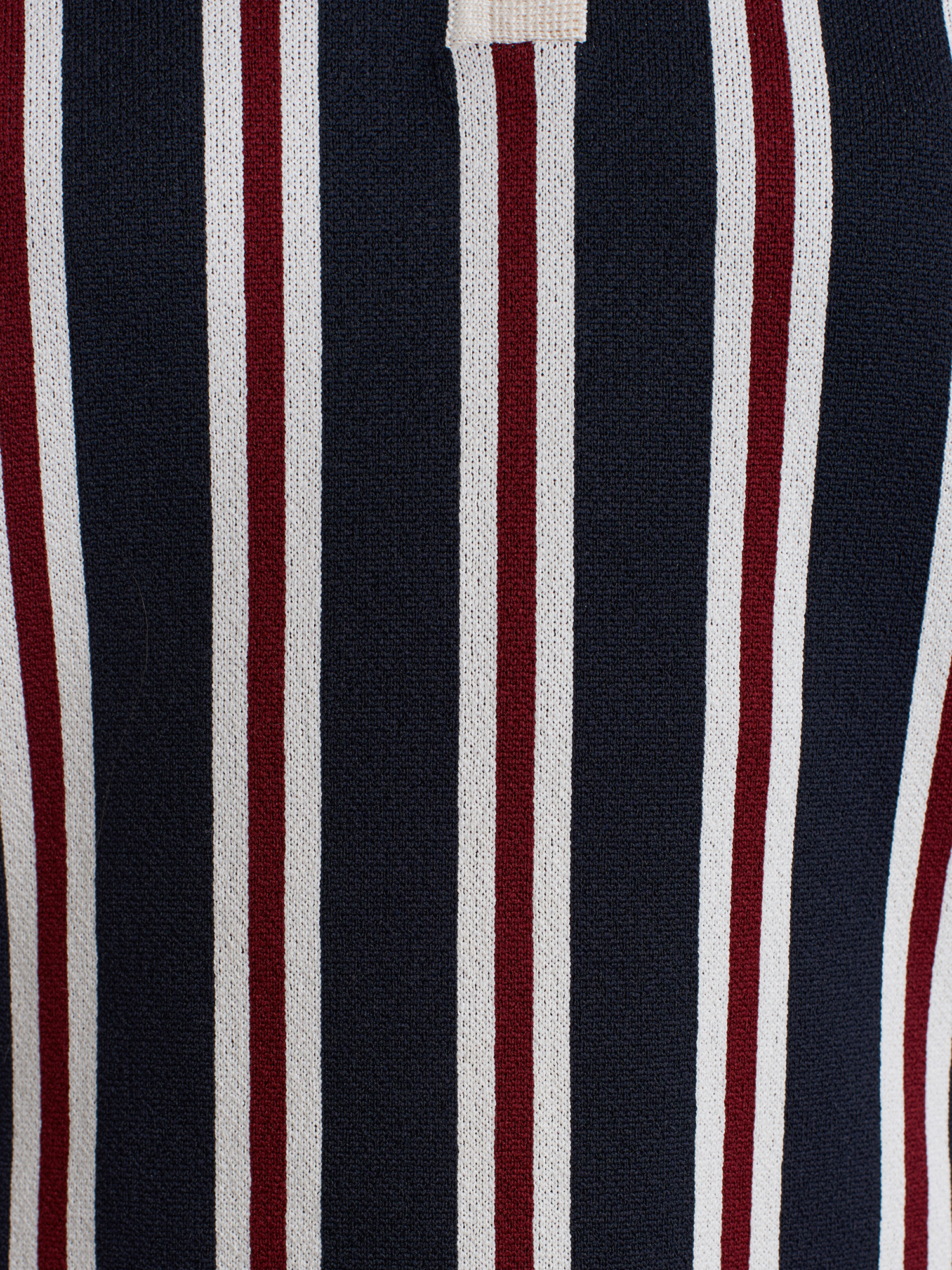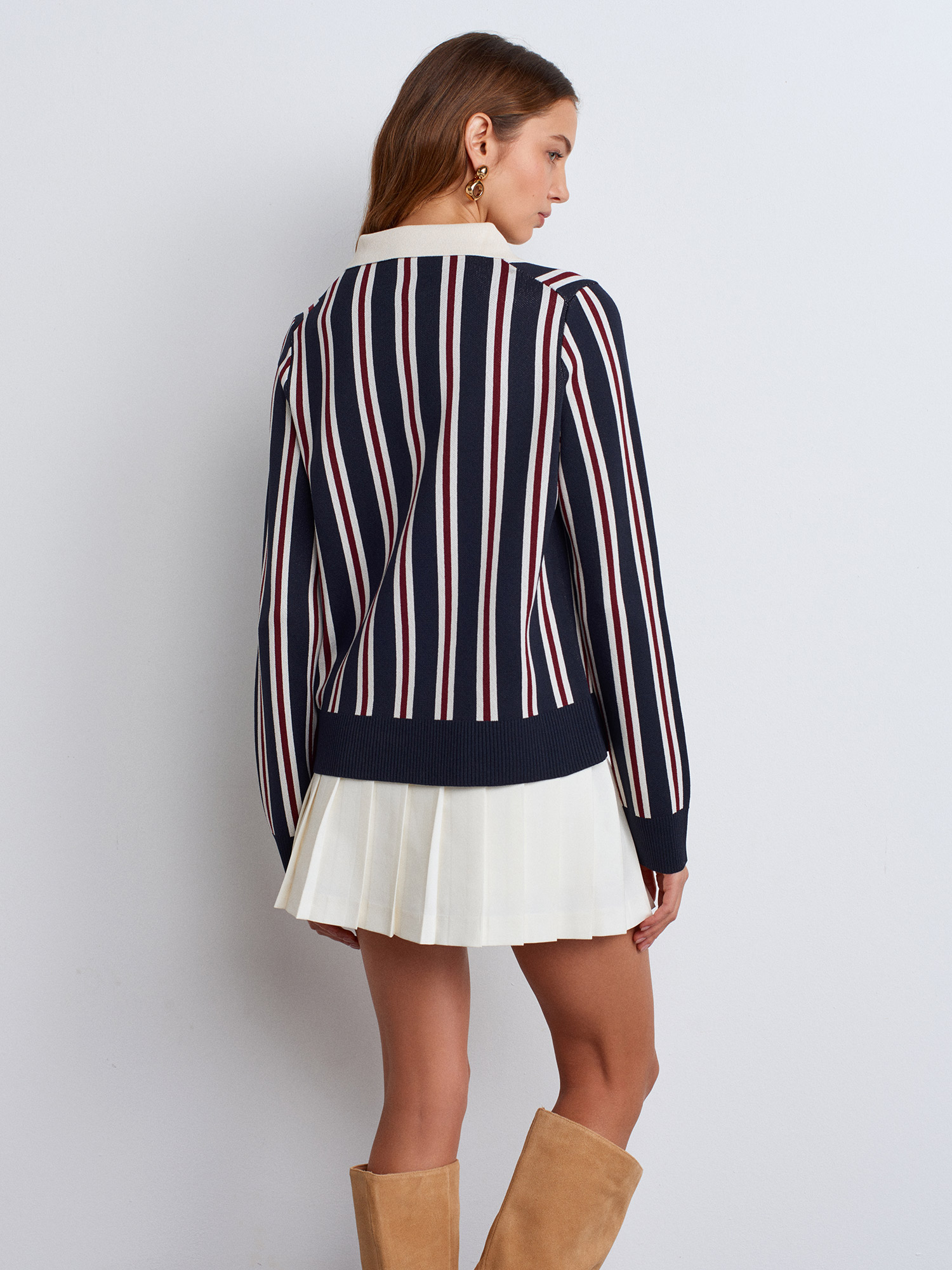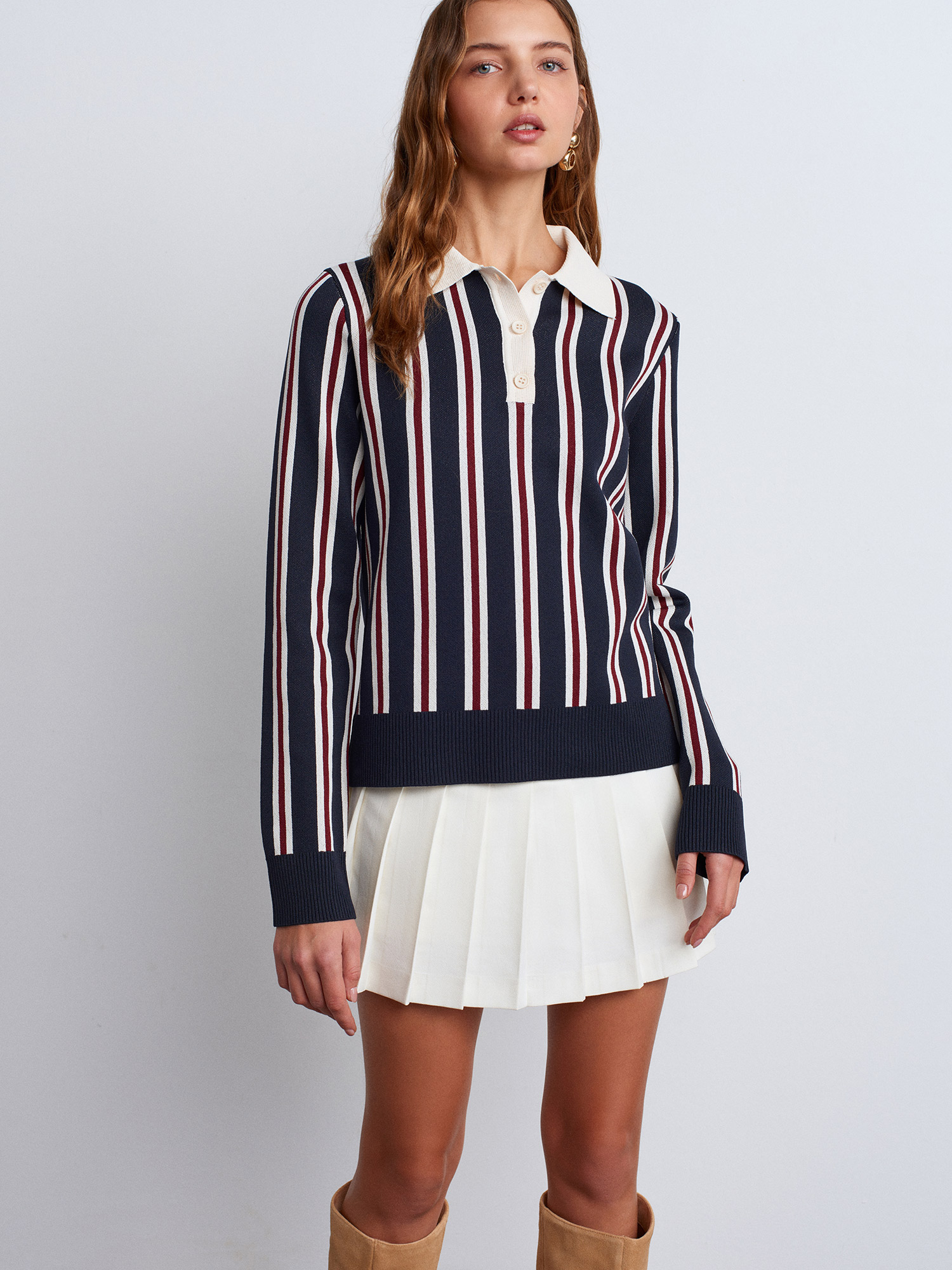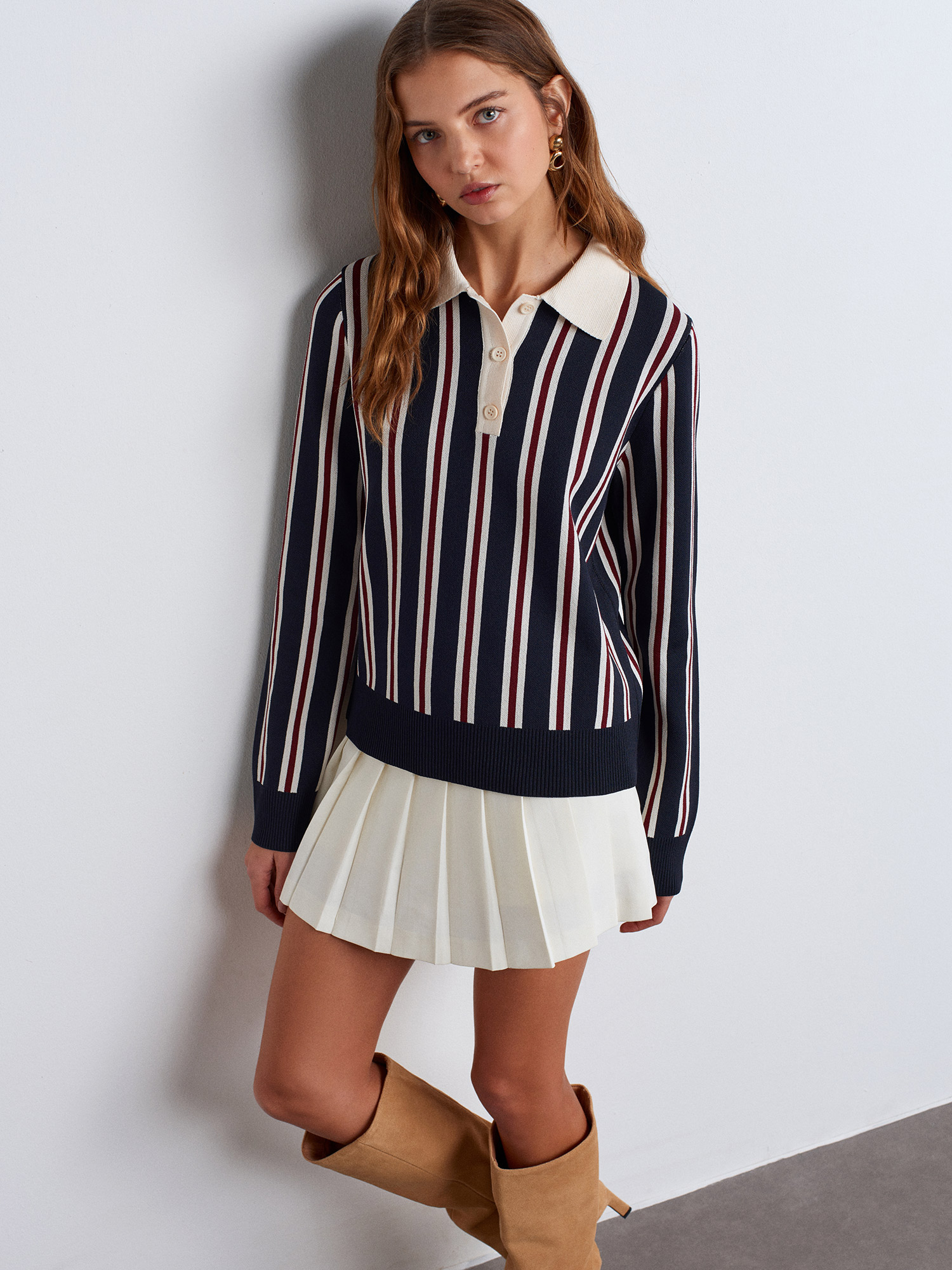 10711 Polo Yaka Çizgili Düğmeli İnce Triko Kazak-Laci-Krem