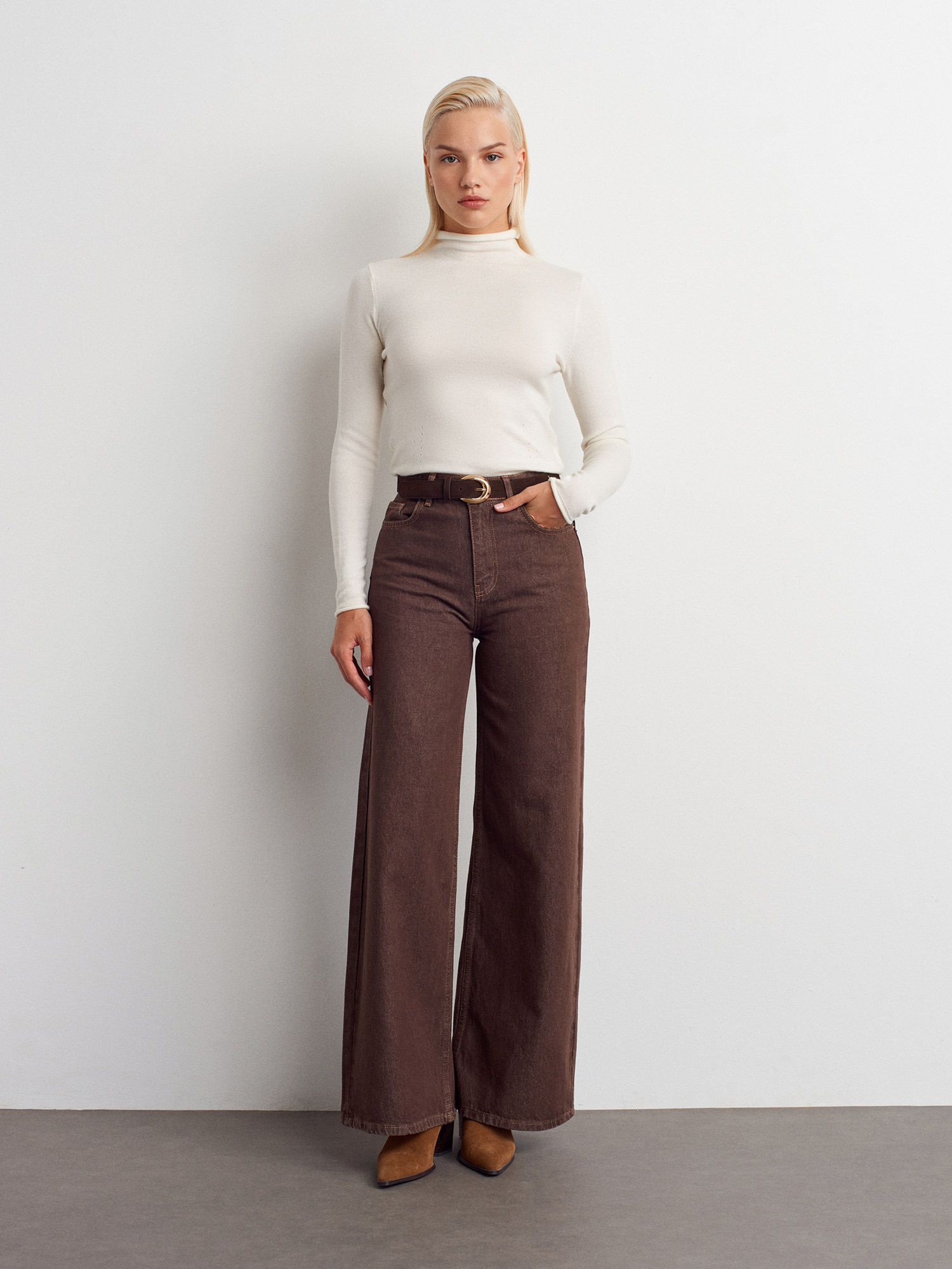 10714 Dik Yaka Yünlü Yumuşak İnce Dokulu Triko Kazak-Ekru