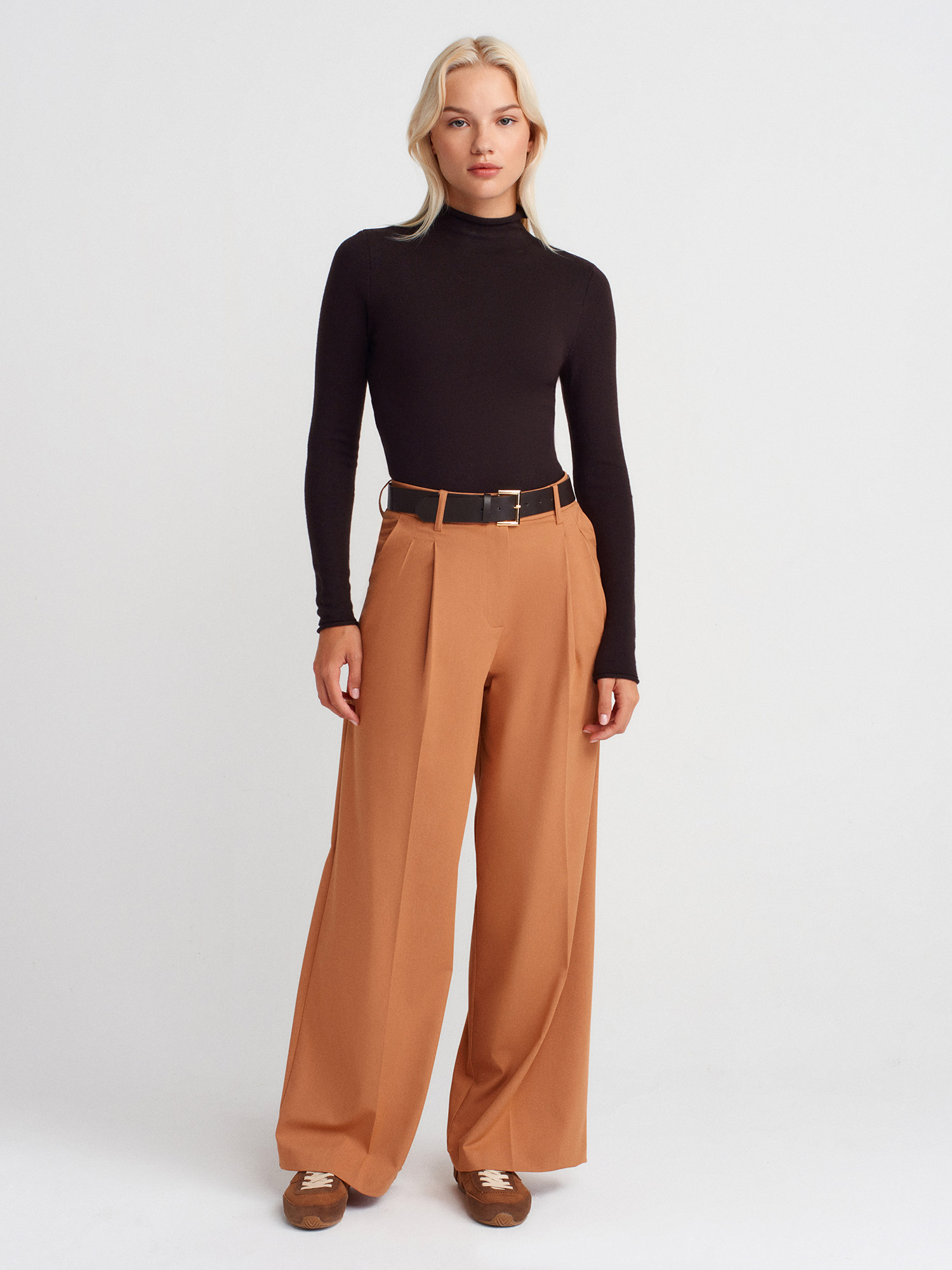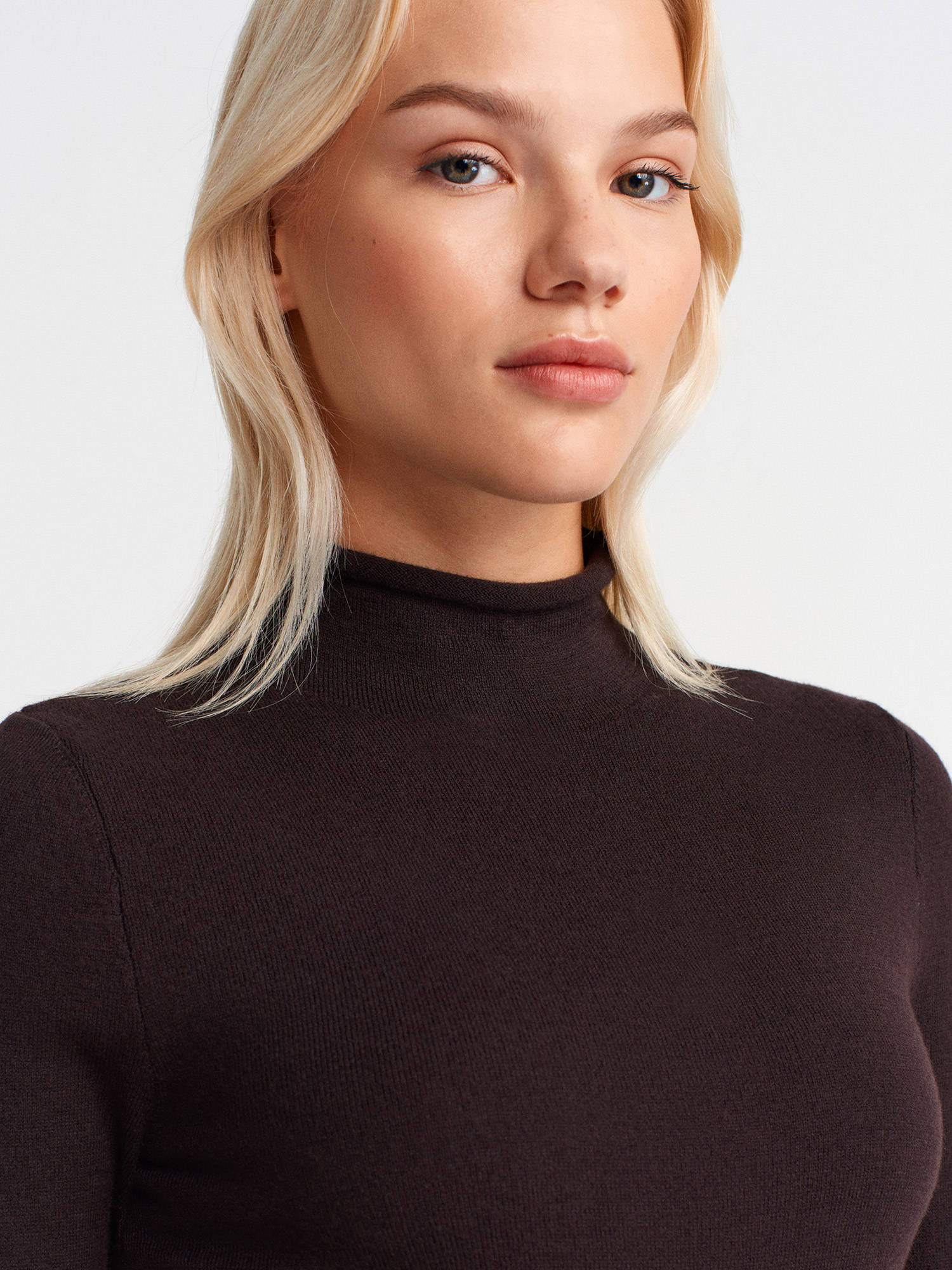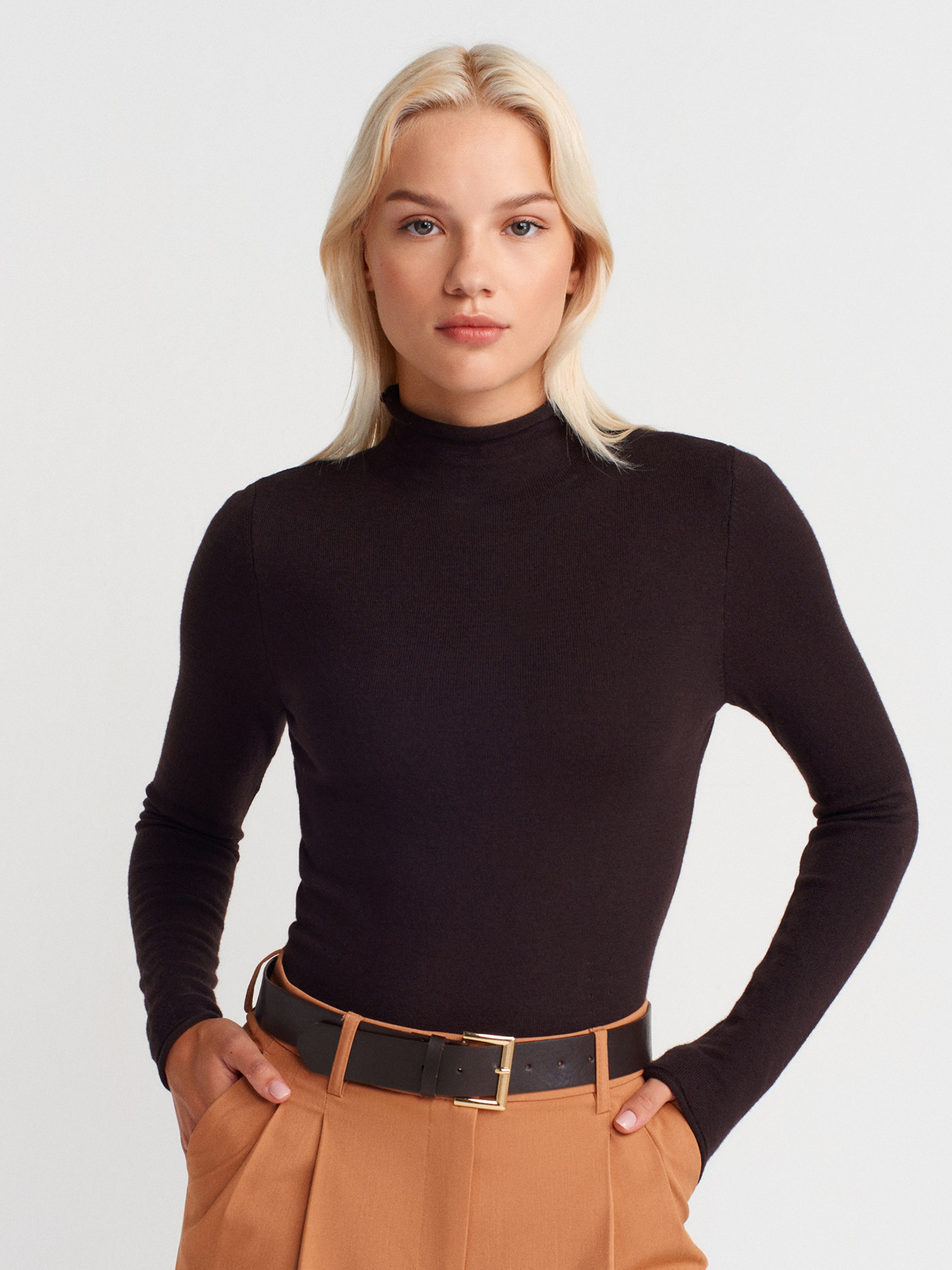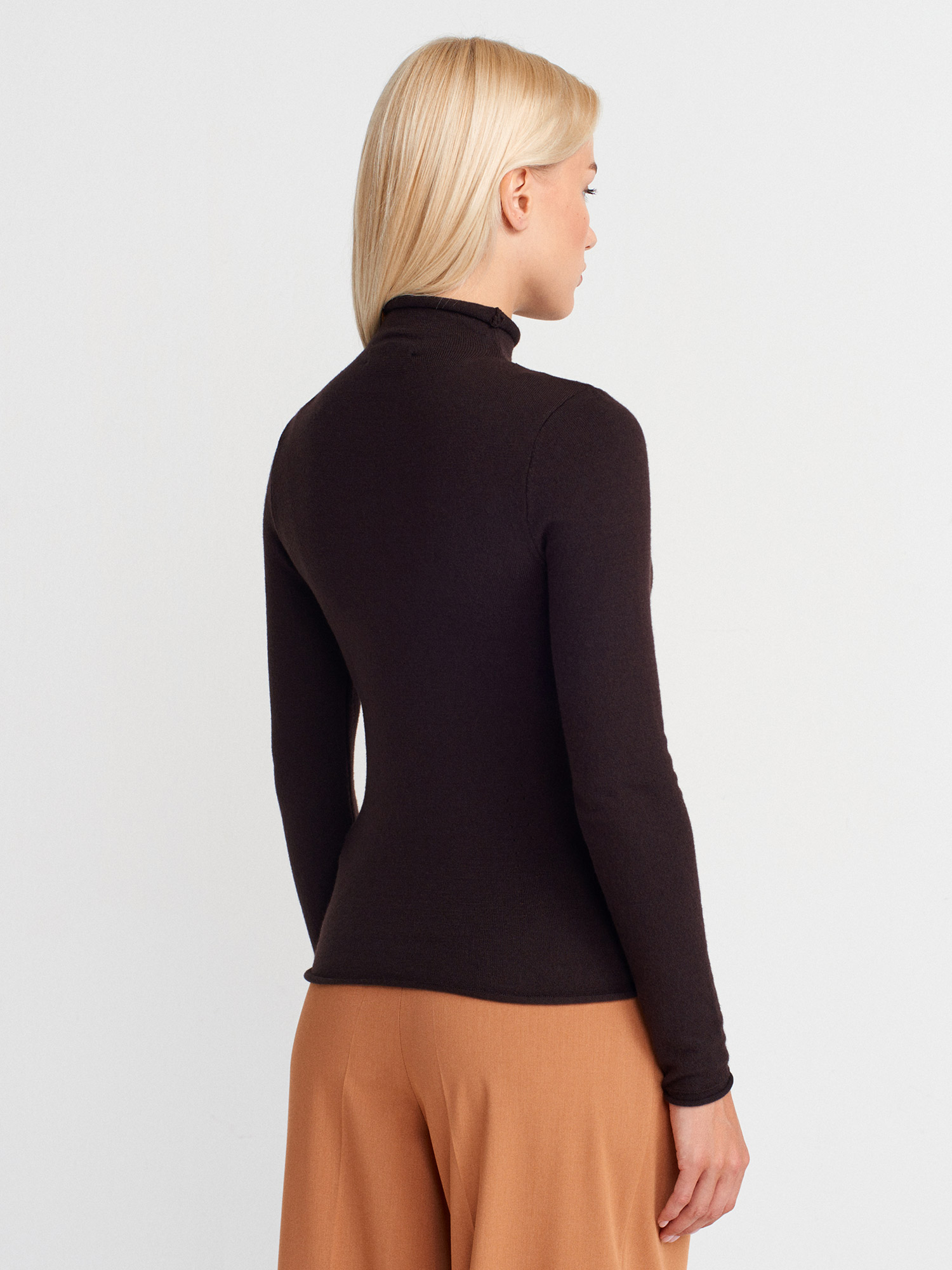 10714 Dik Yaka Yünlü Yumuşak İnce Dokulu Triko Kazak-Koyu Kahve