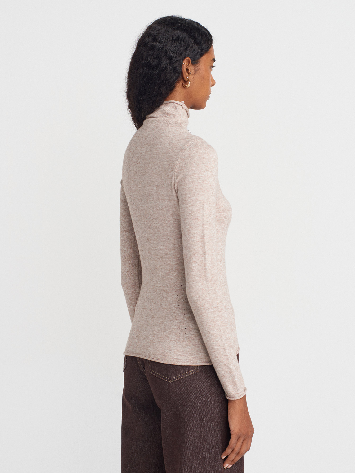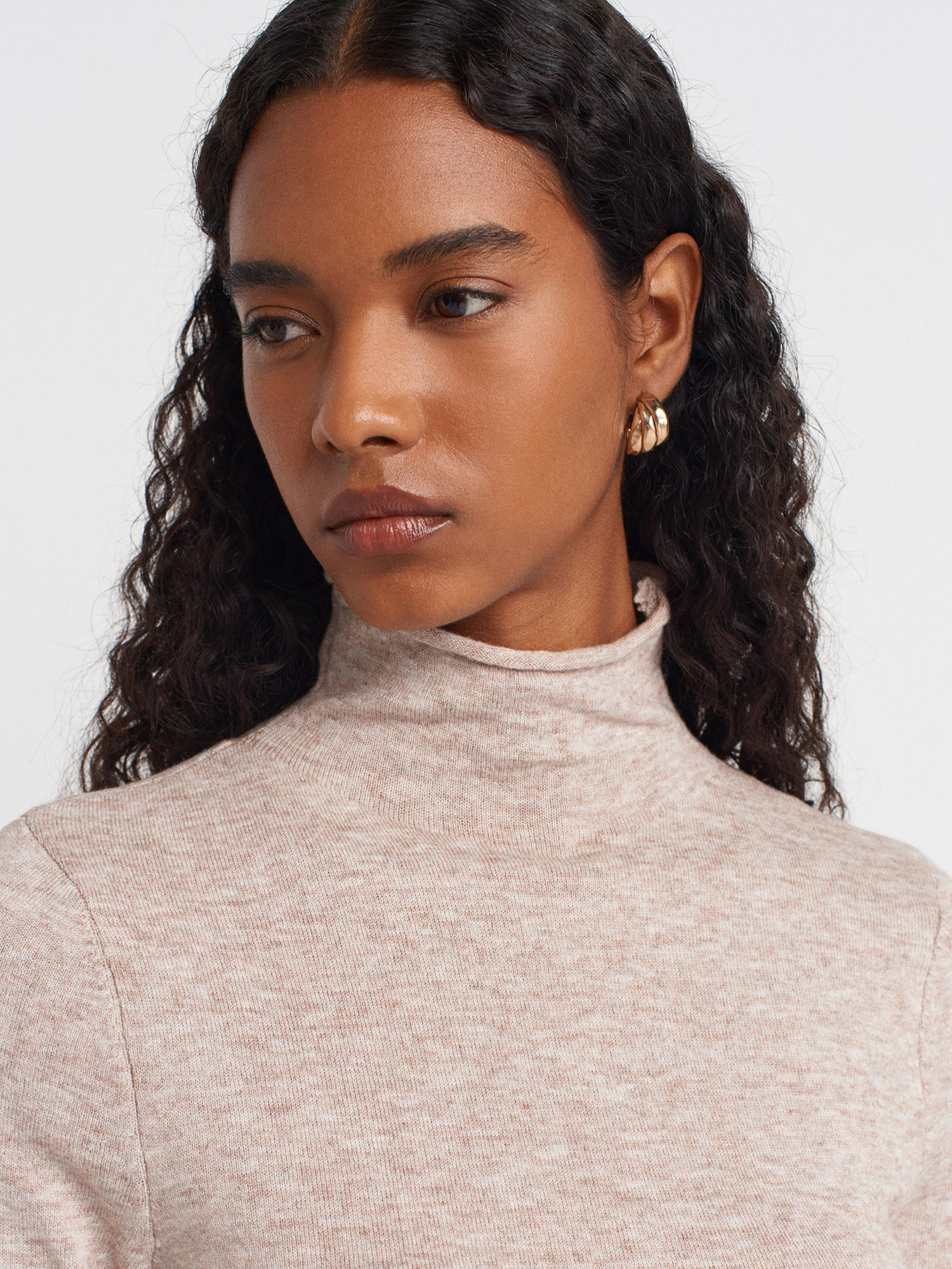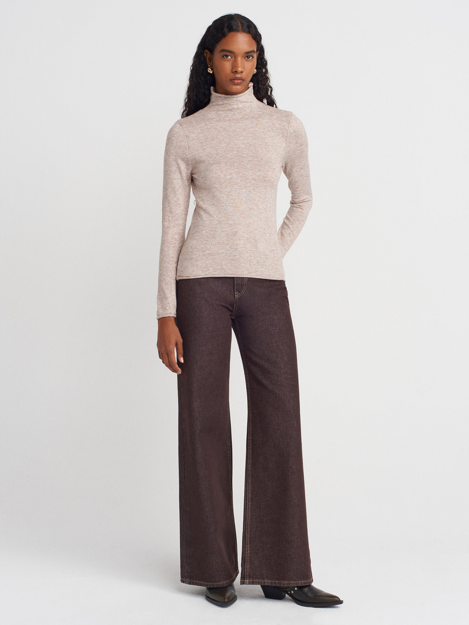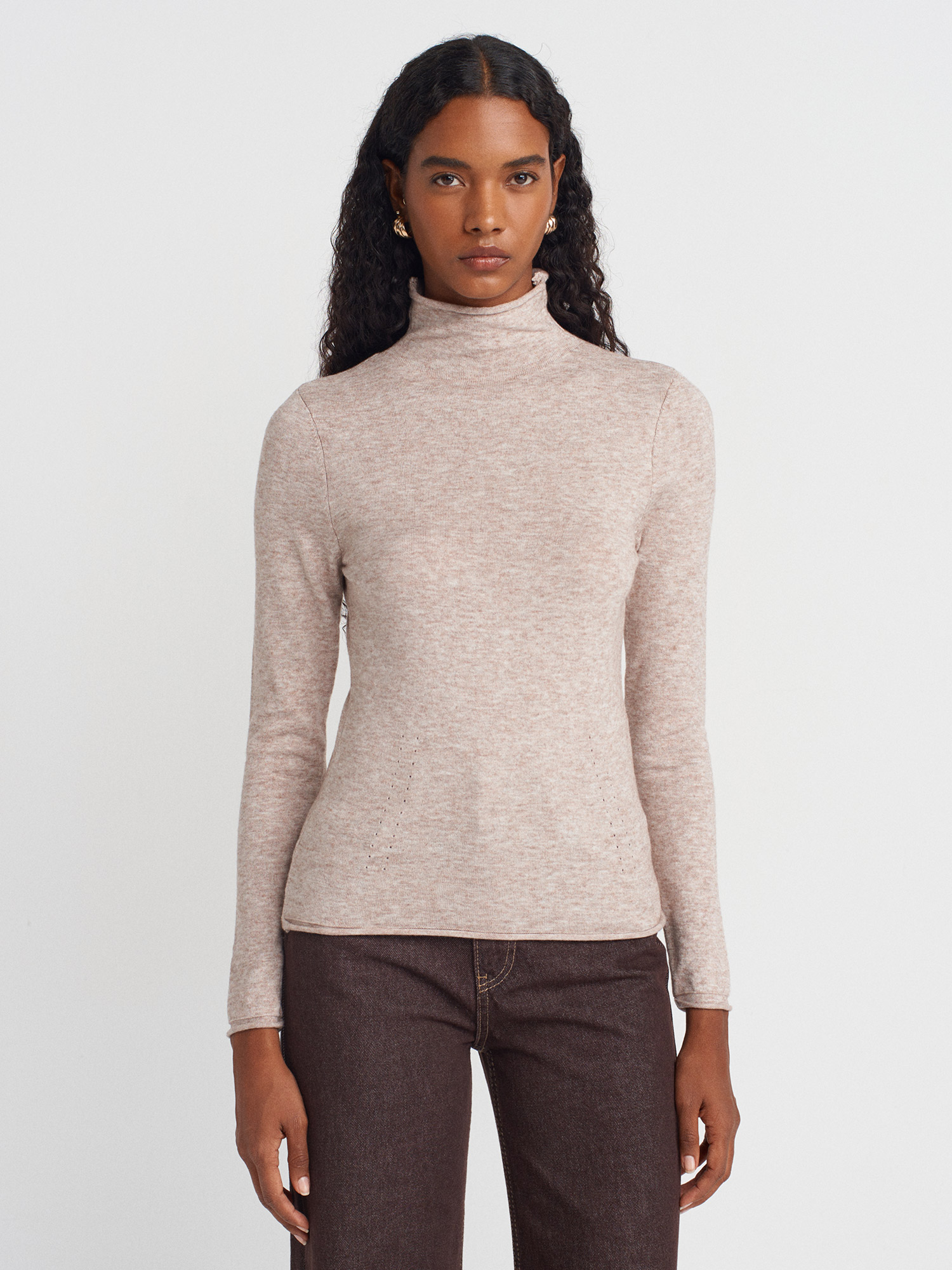 10714 Dik Yaka Yünlü Yumuşak İnce Dokulu Triko Kazak-Vizon M.