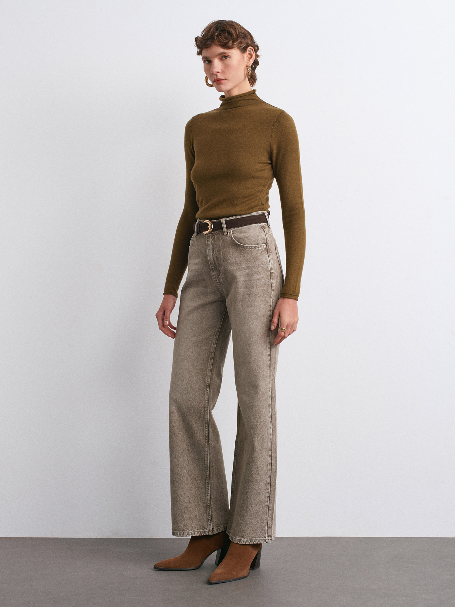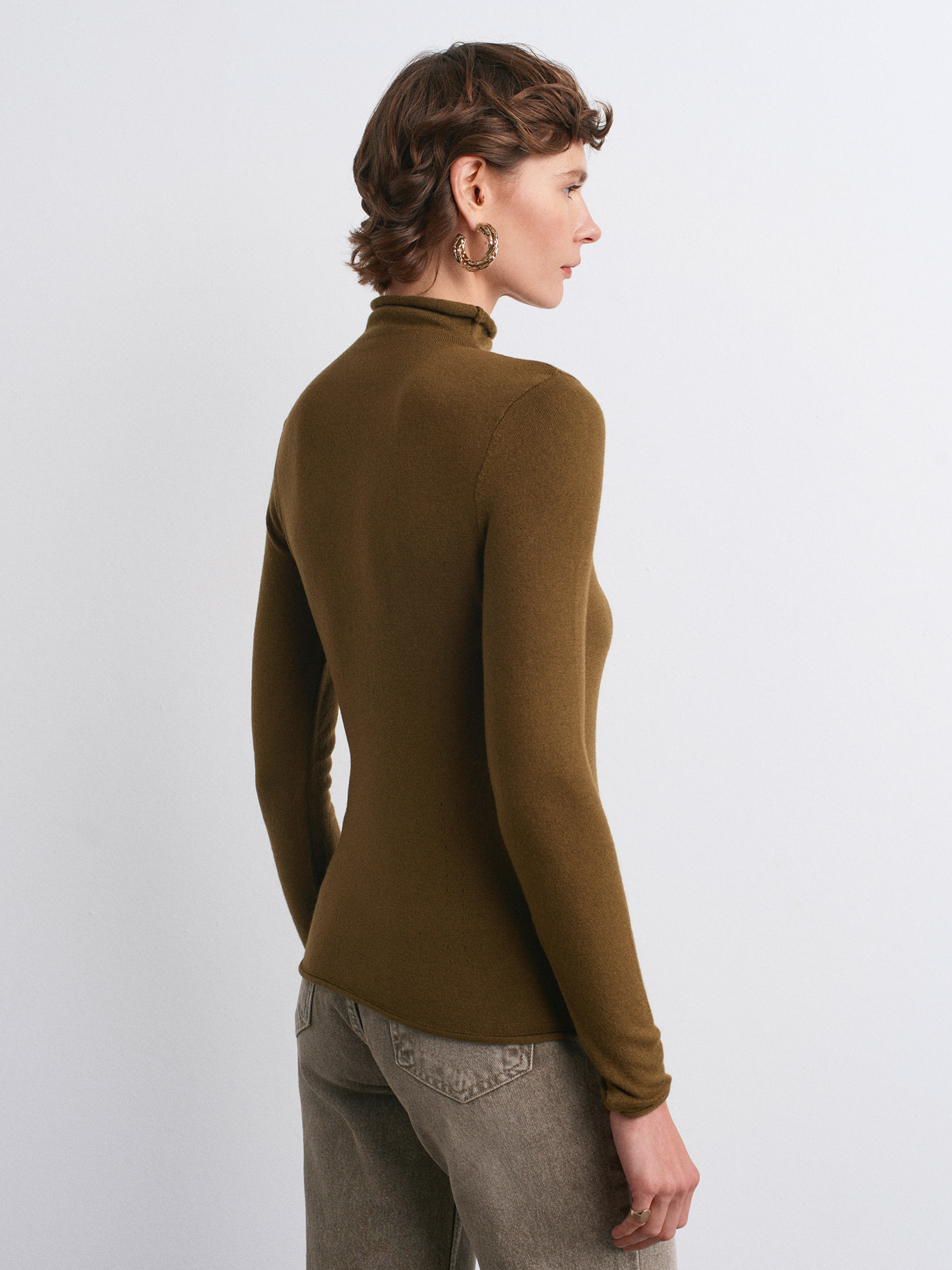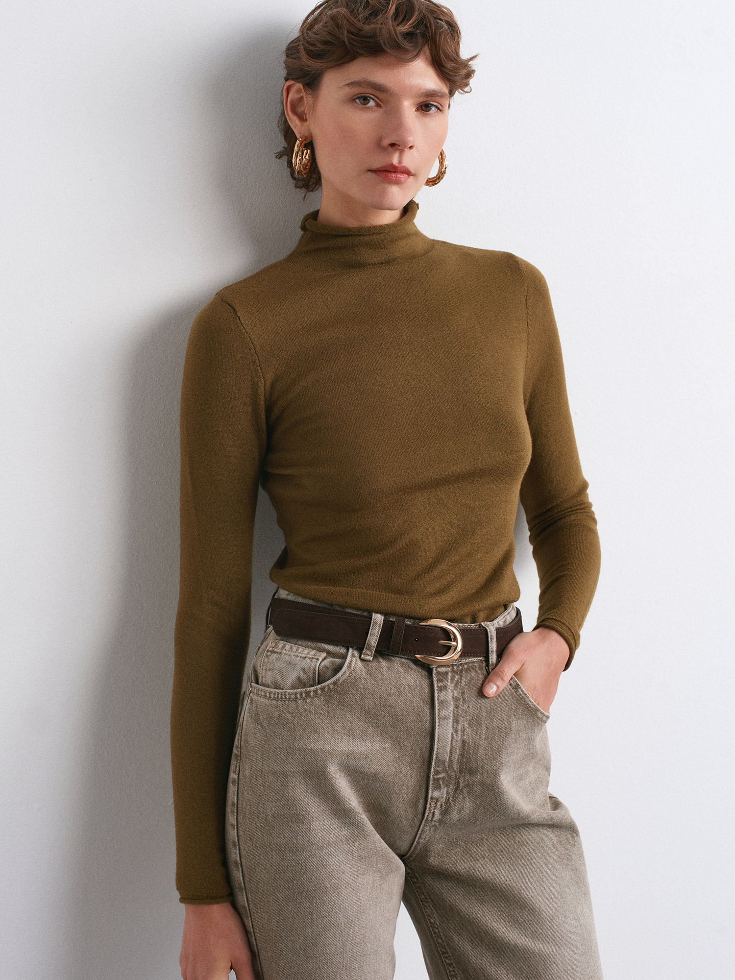 10714 Dik Yaka Yünlü Yumuşak İnce Dokulu Triko Kazak-Yağ Yeşil