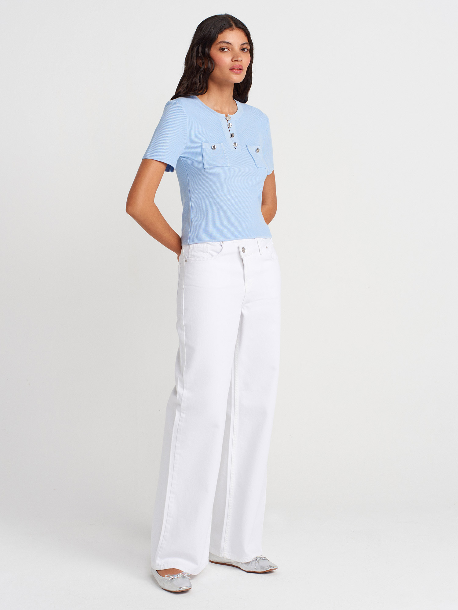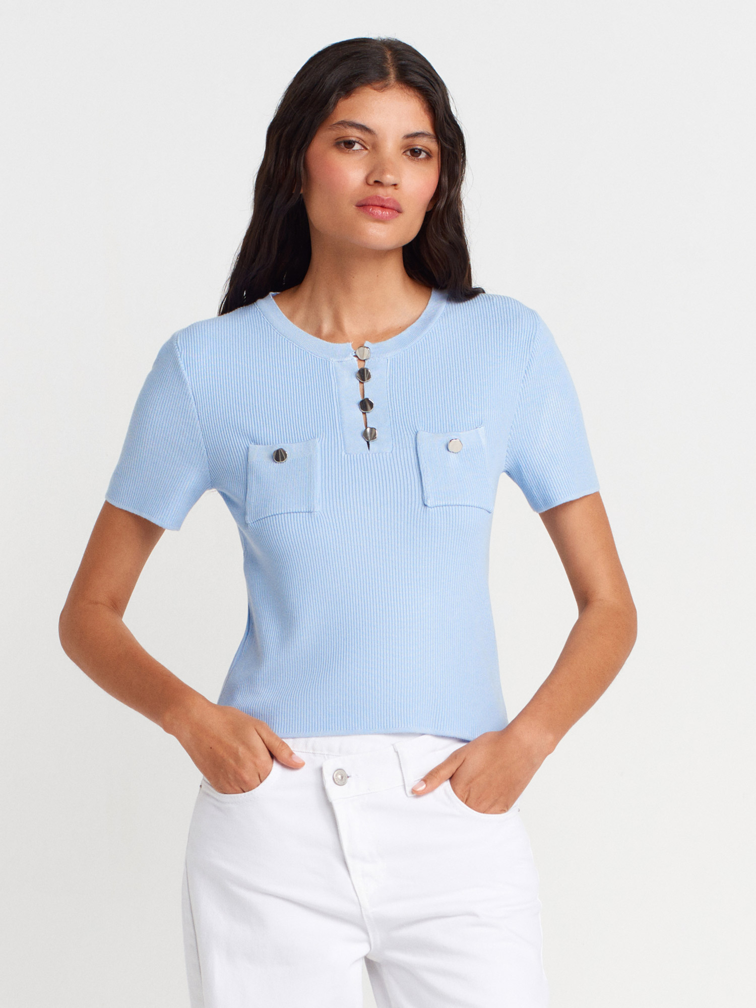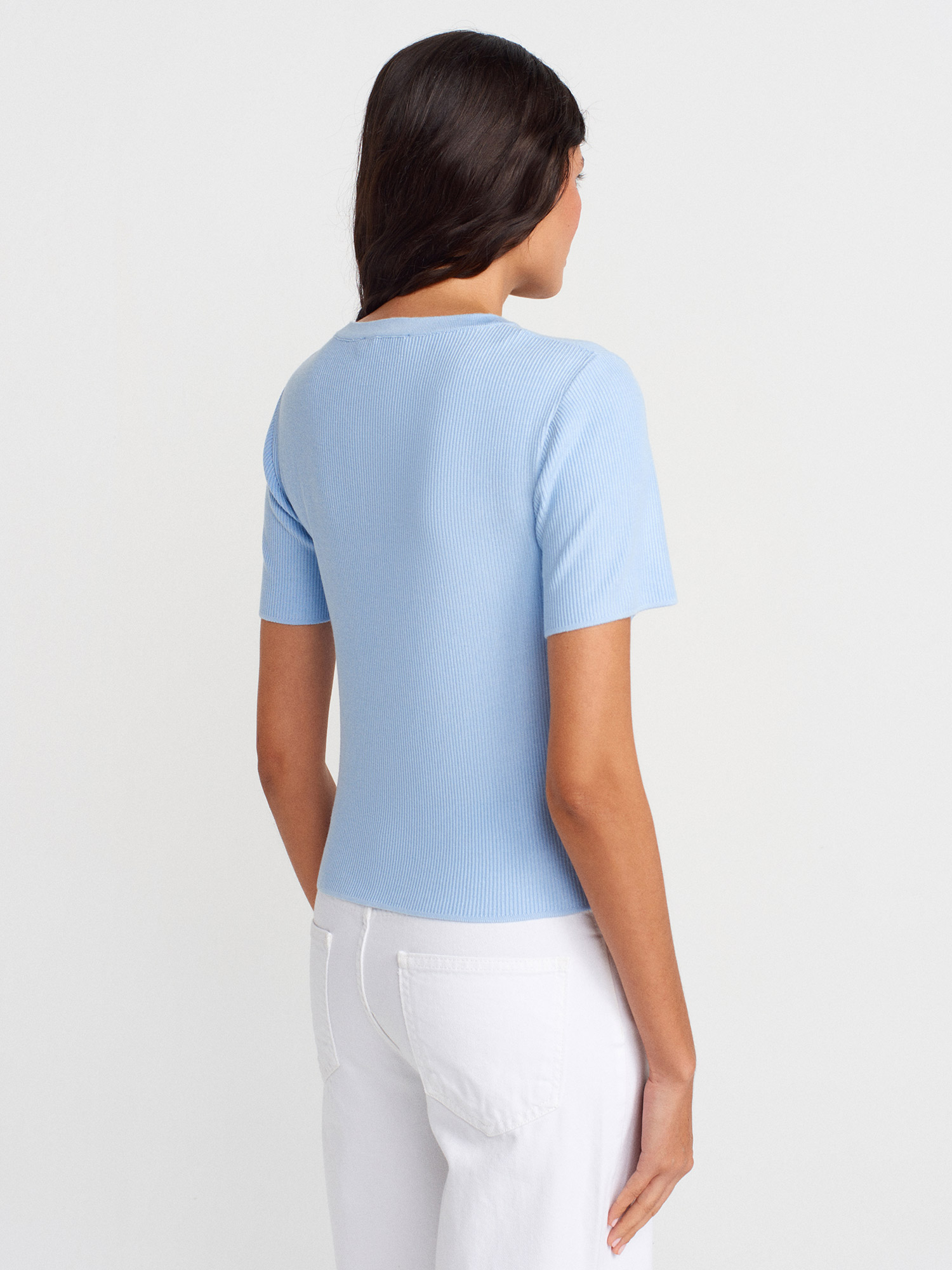 10733 Bisiklet Yaka Cepli Düğmeli Triko Bluz-Mavi