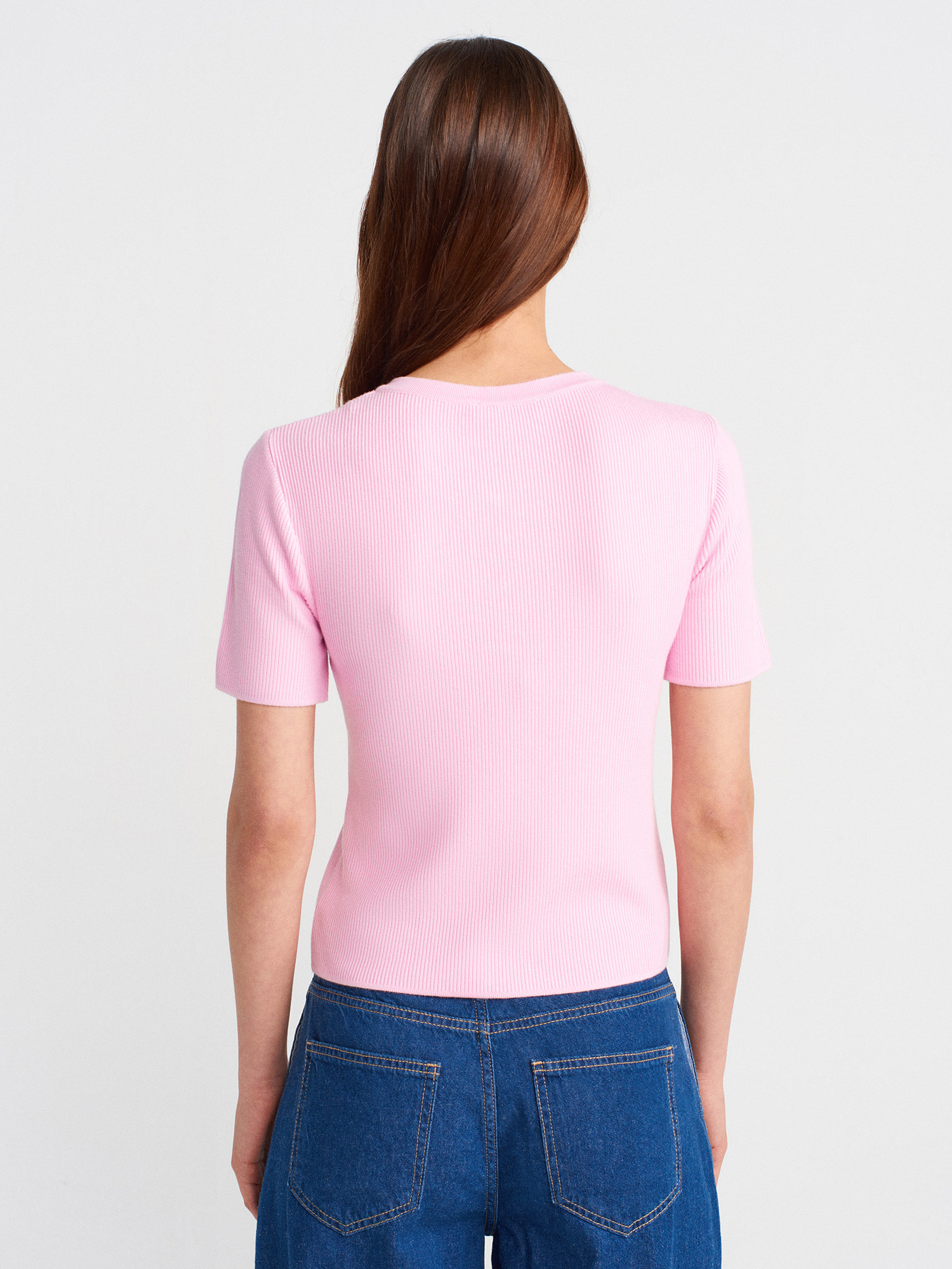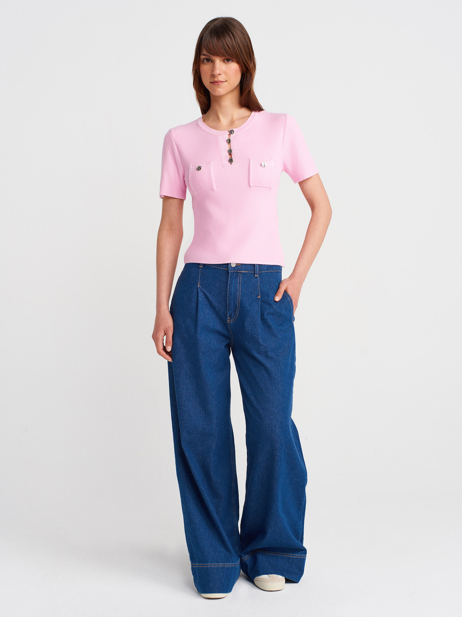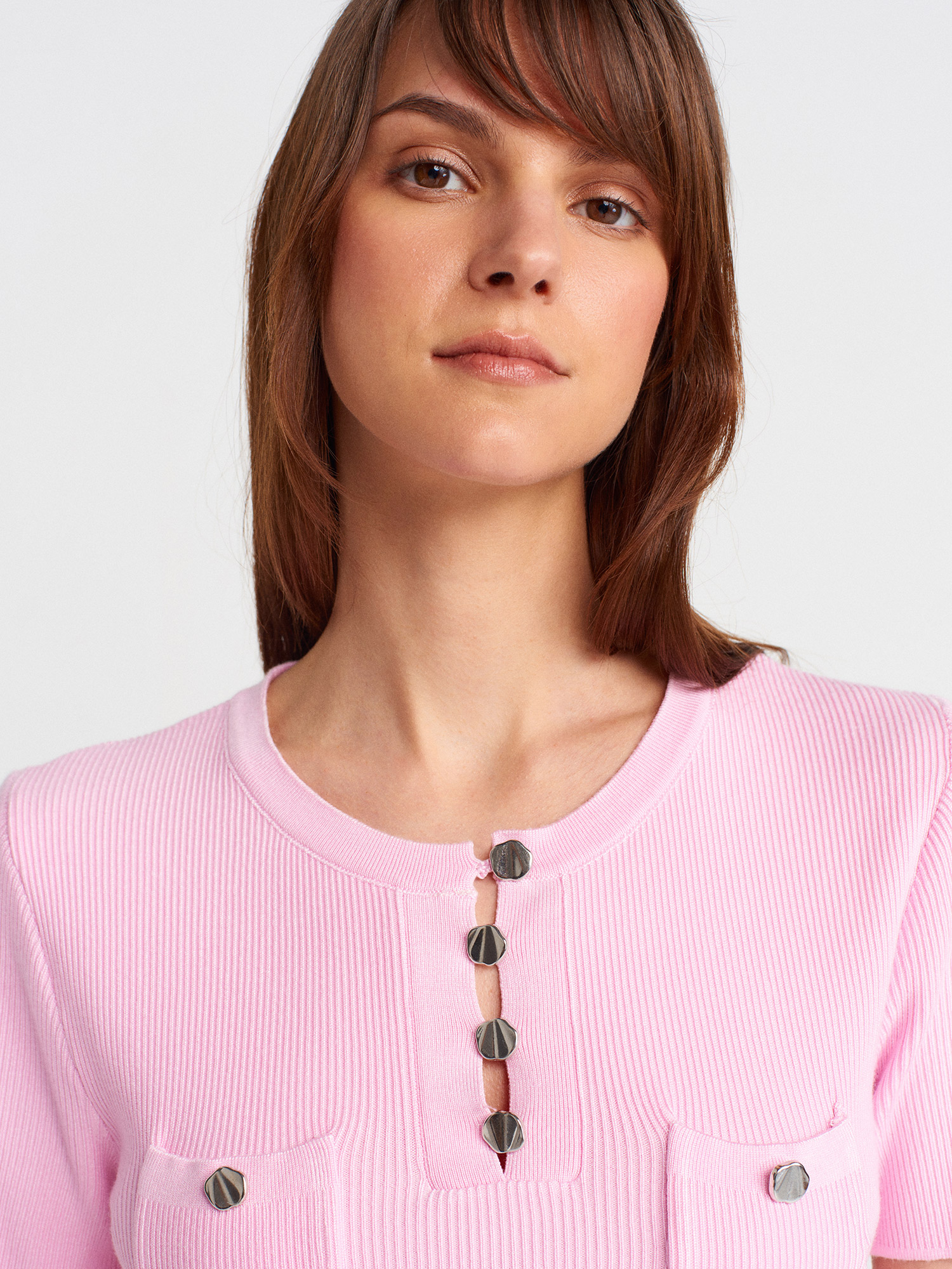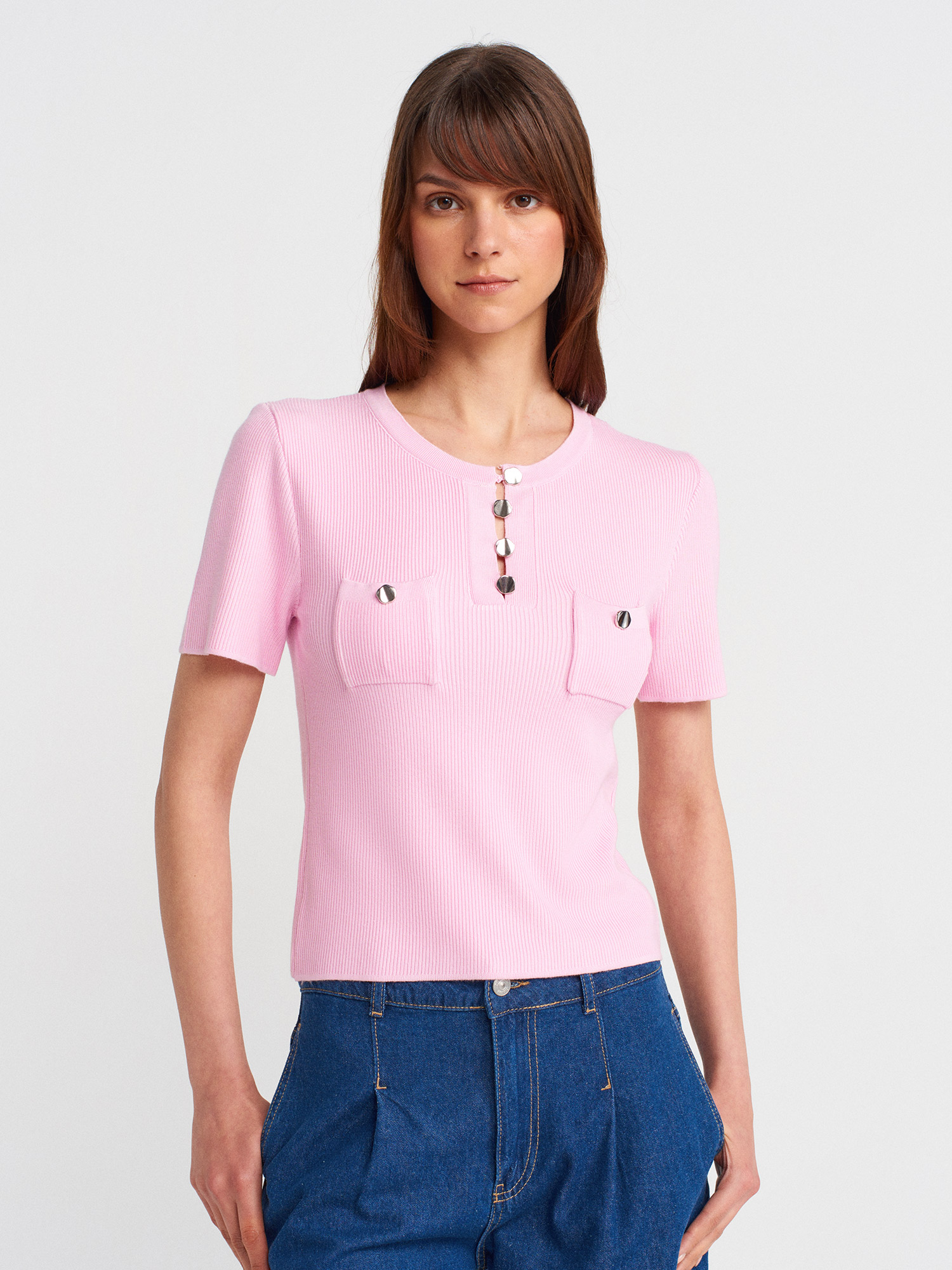 10733 Bisiklet Yaka Cepli Düğmeli Triko Bluz-Pembe
