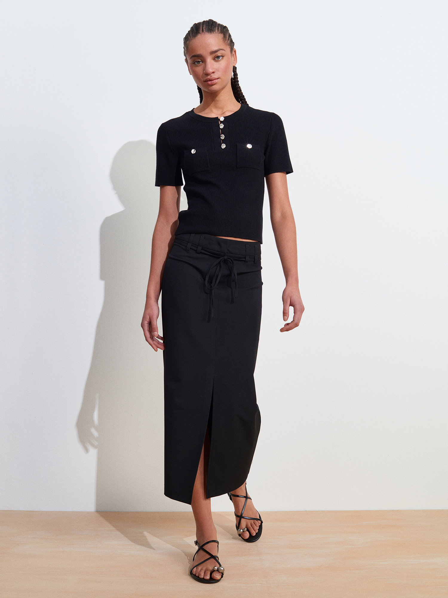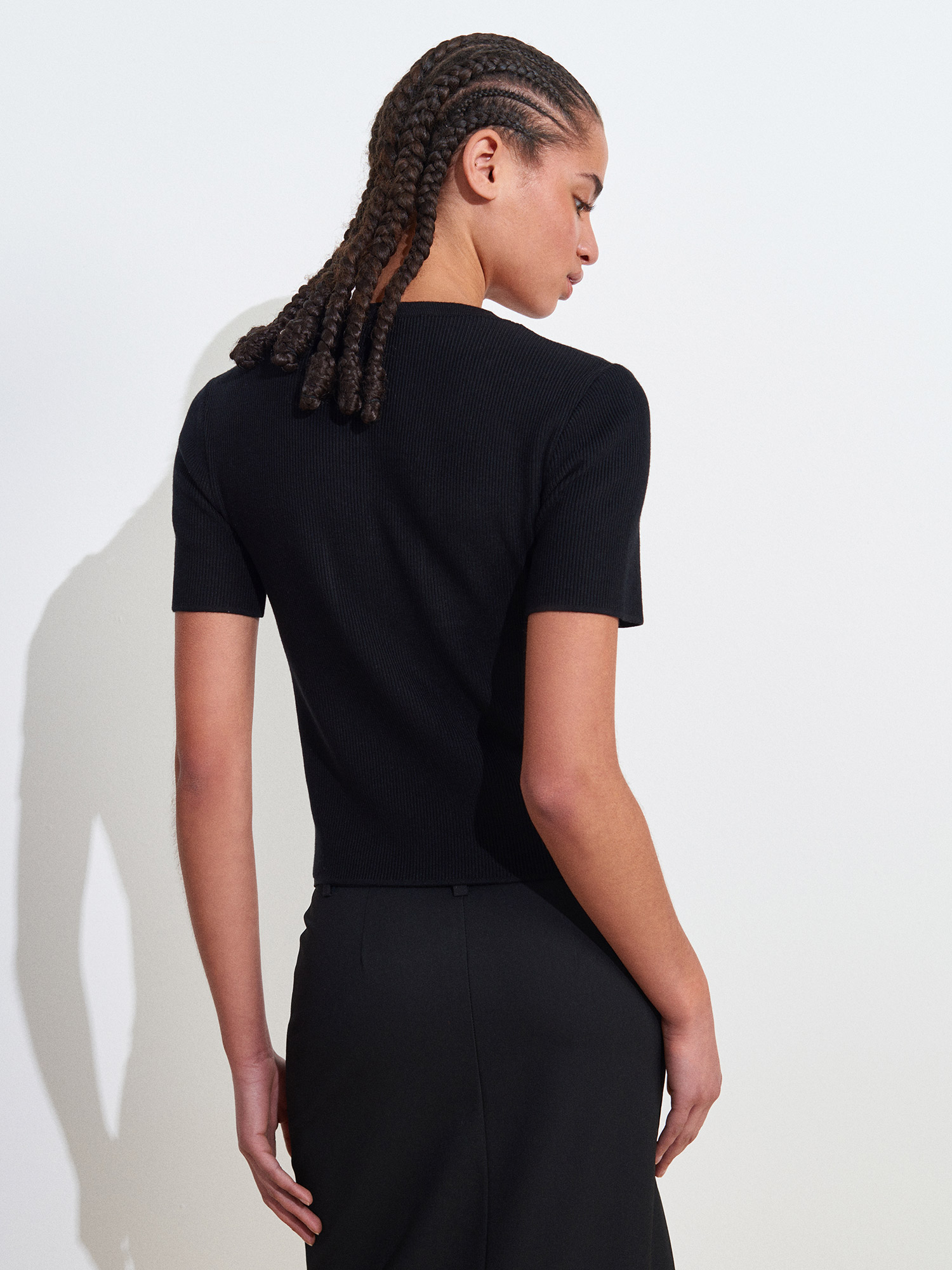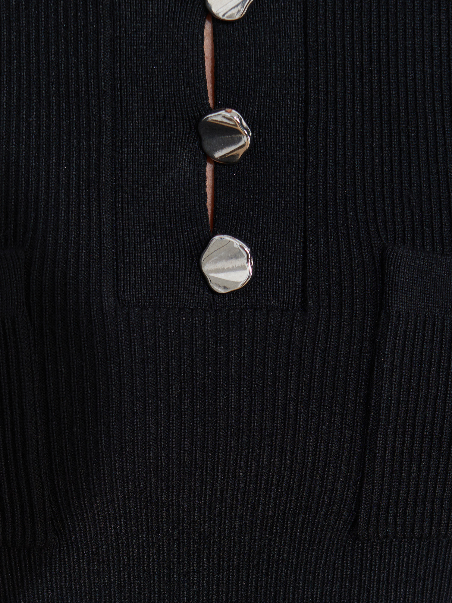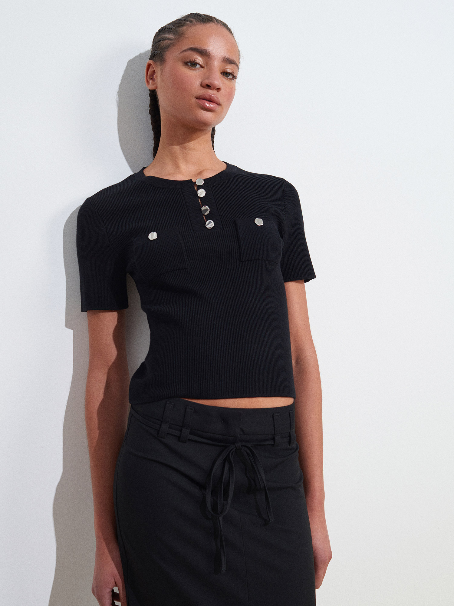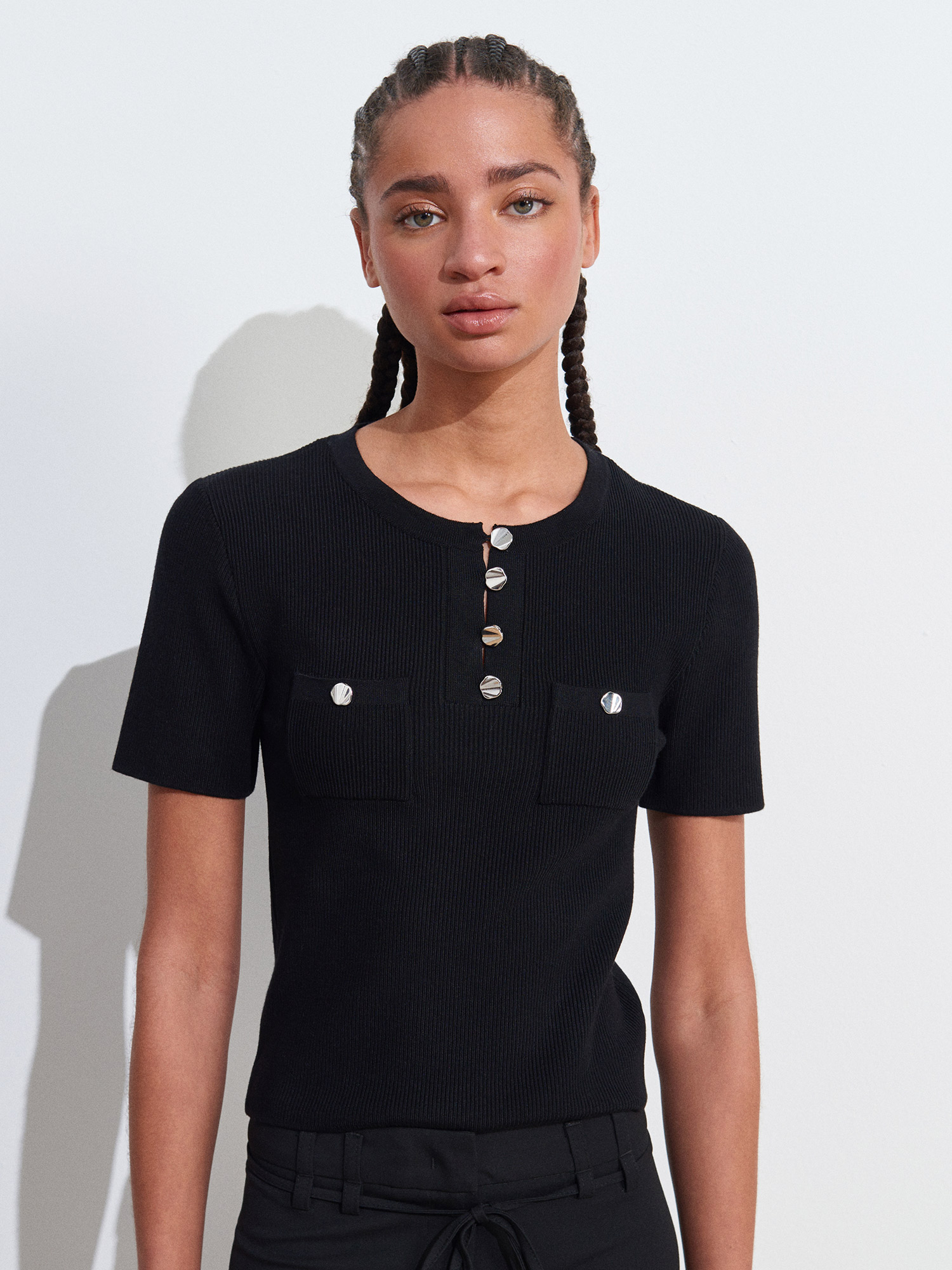10733 Bisiklet Yaka Cepli Düğmeli Triko Bluz-Siyah