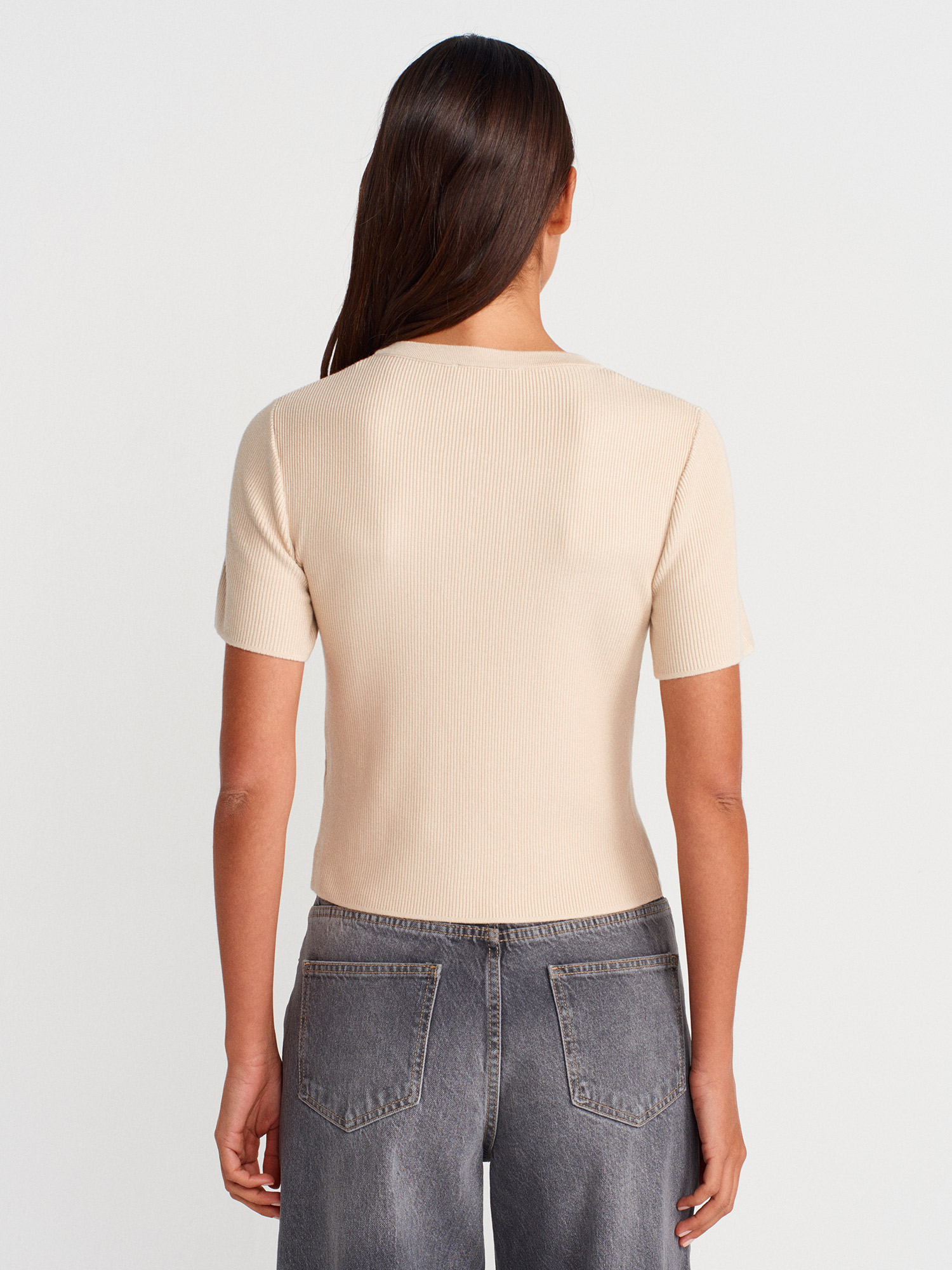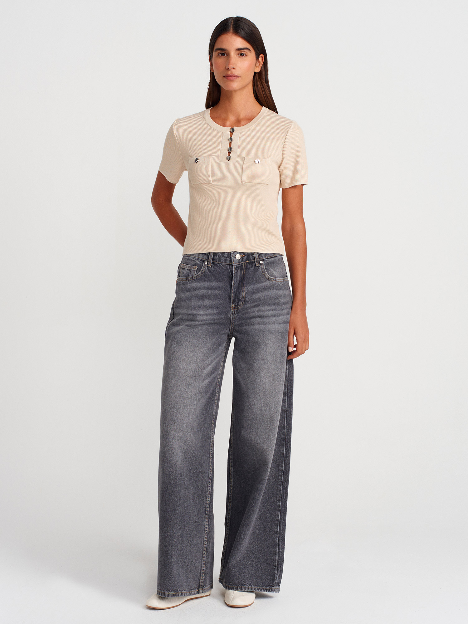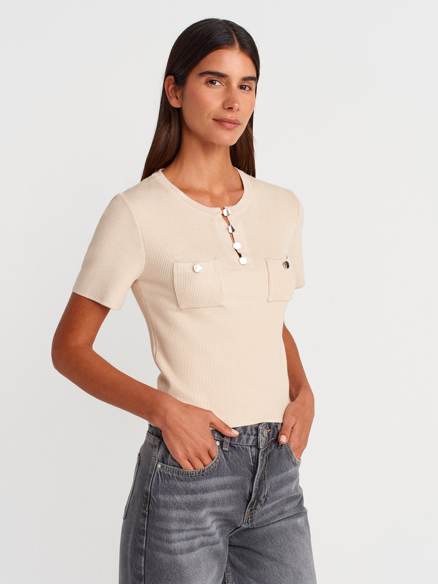 10733 Bisiklet Yaka Cepli Düğmeli Triko Bluz-Taş