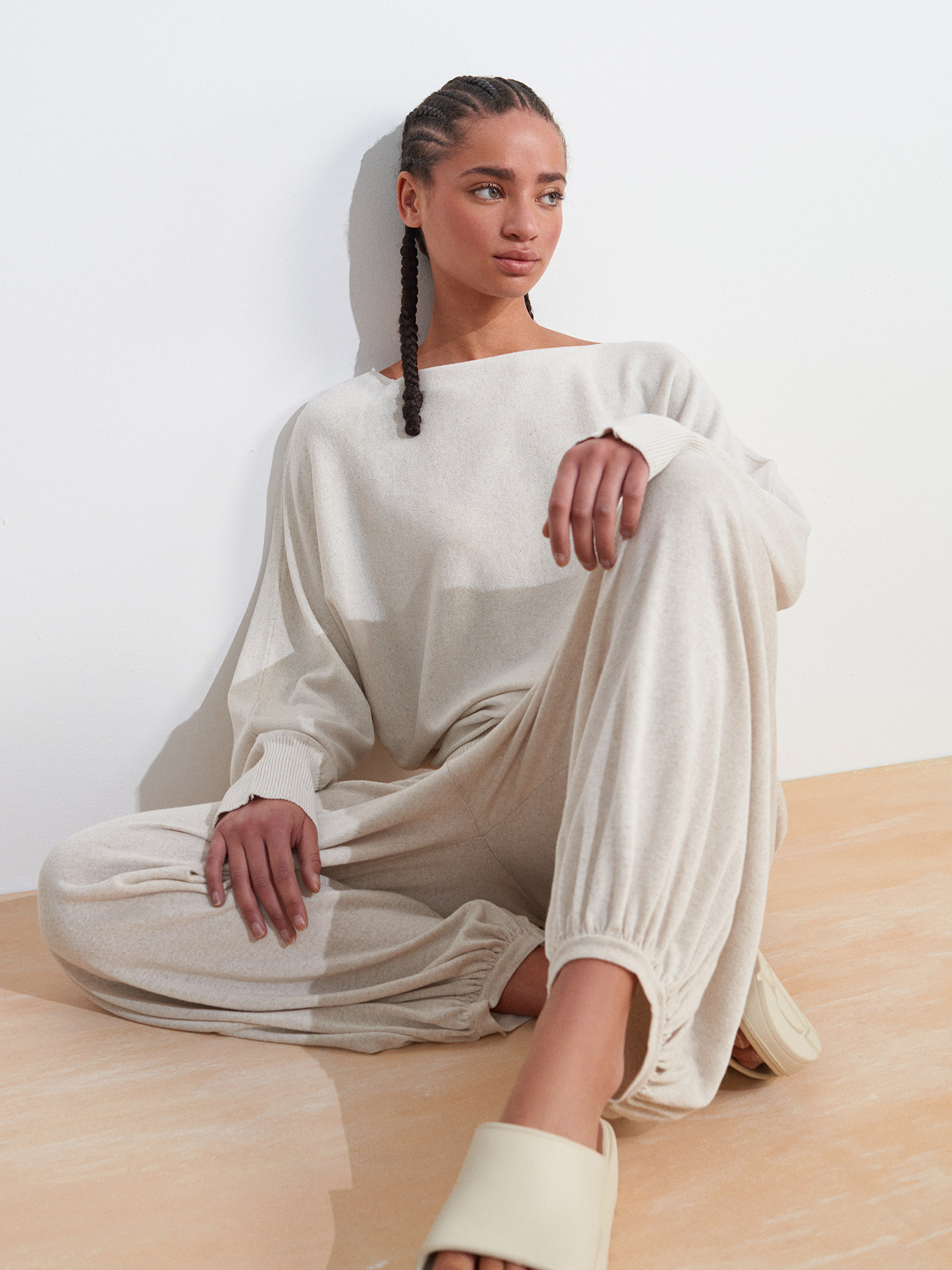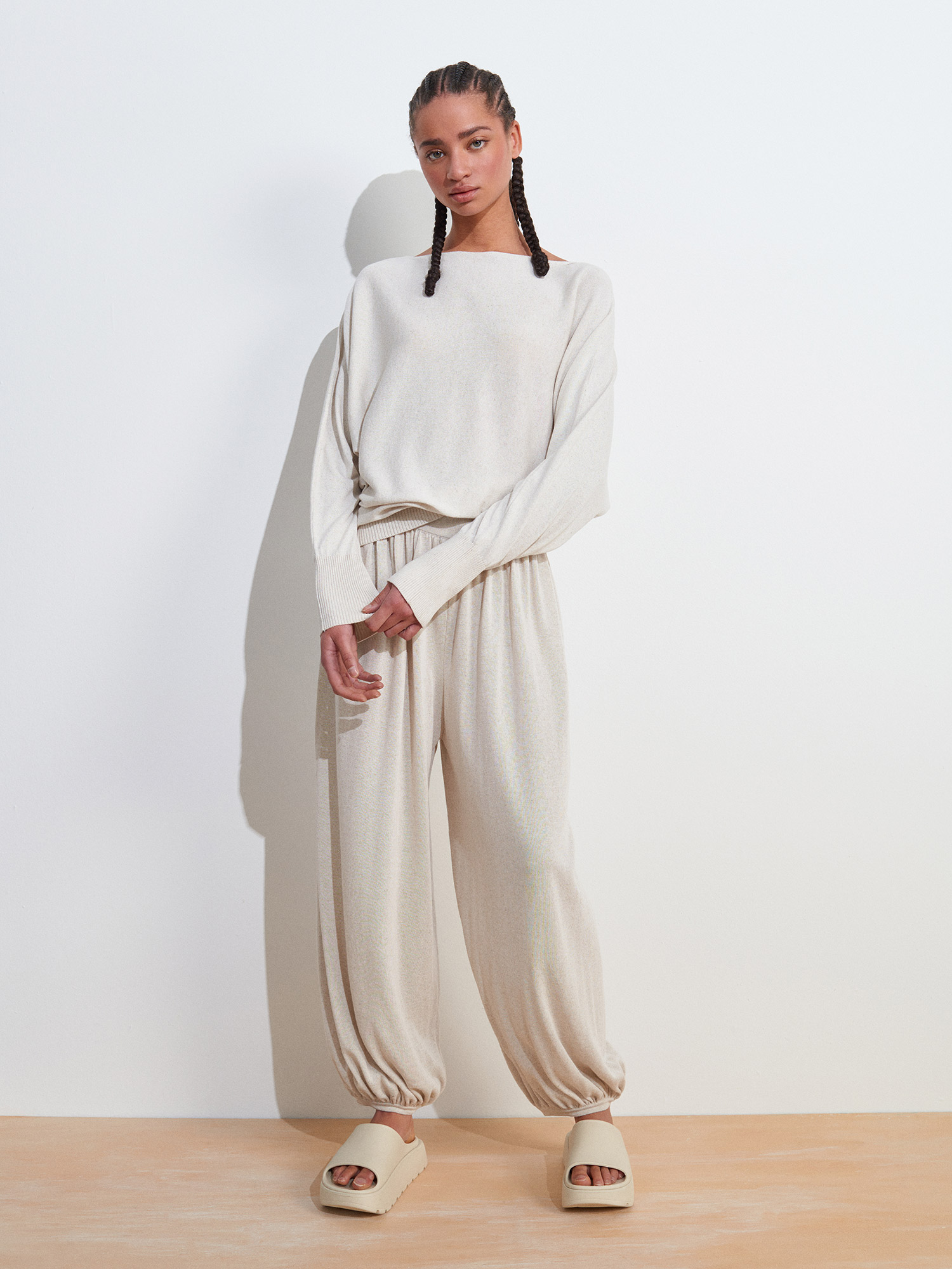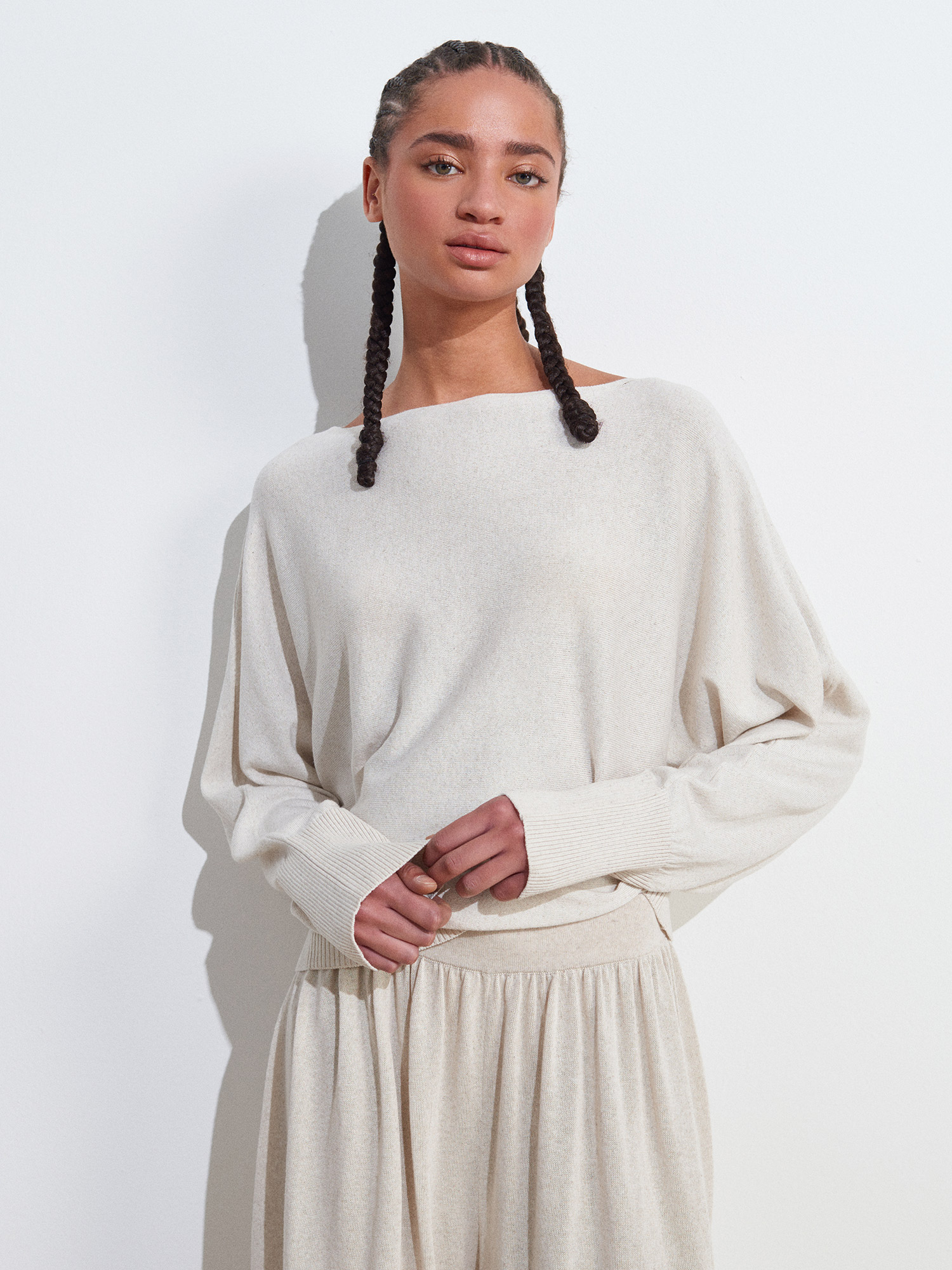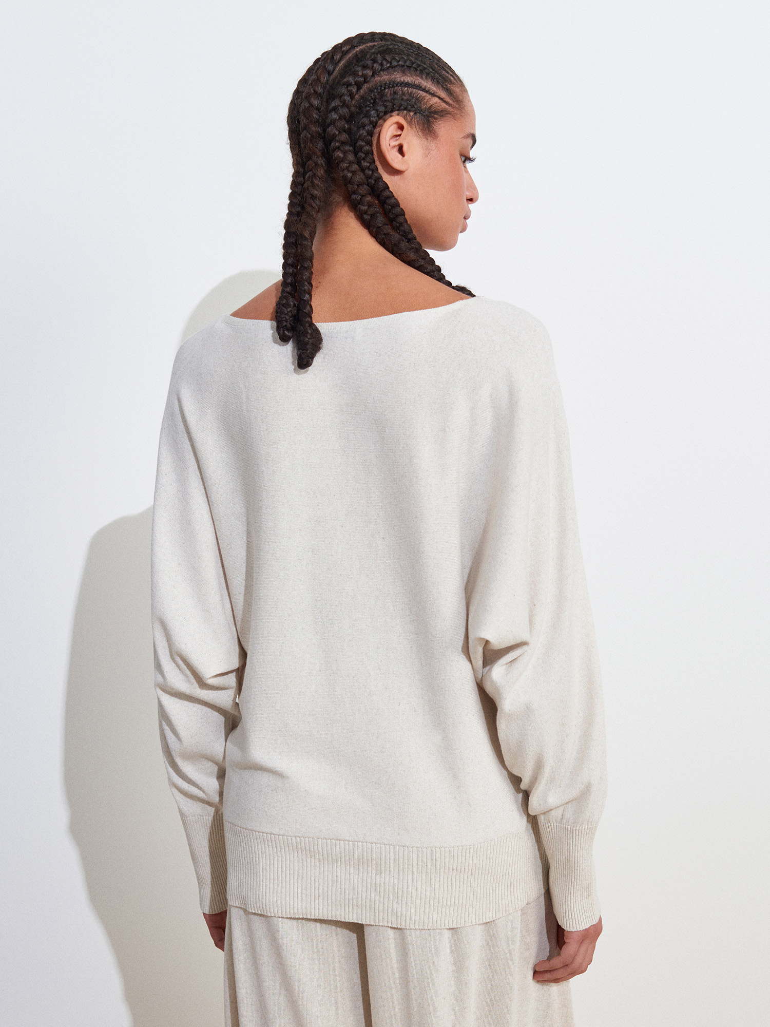 10735 Kayık Yaka İnce Triko Kazak-Bej Melanj