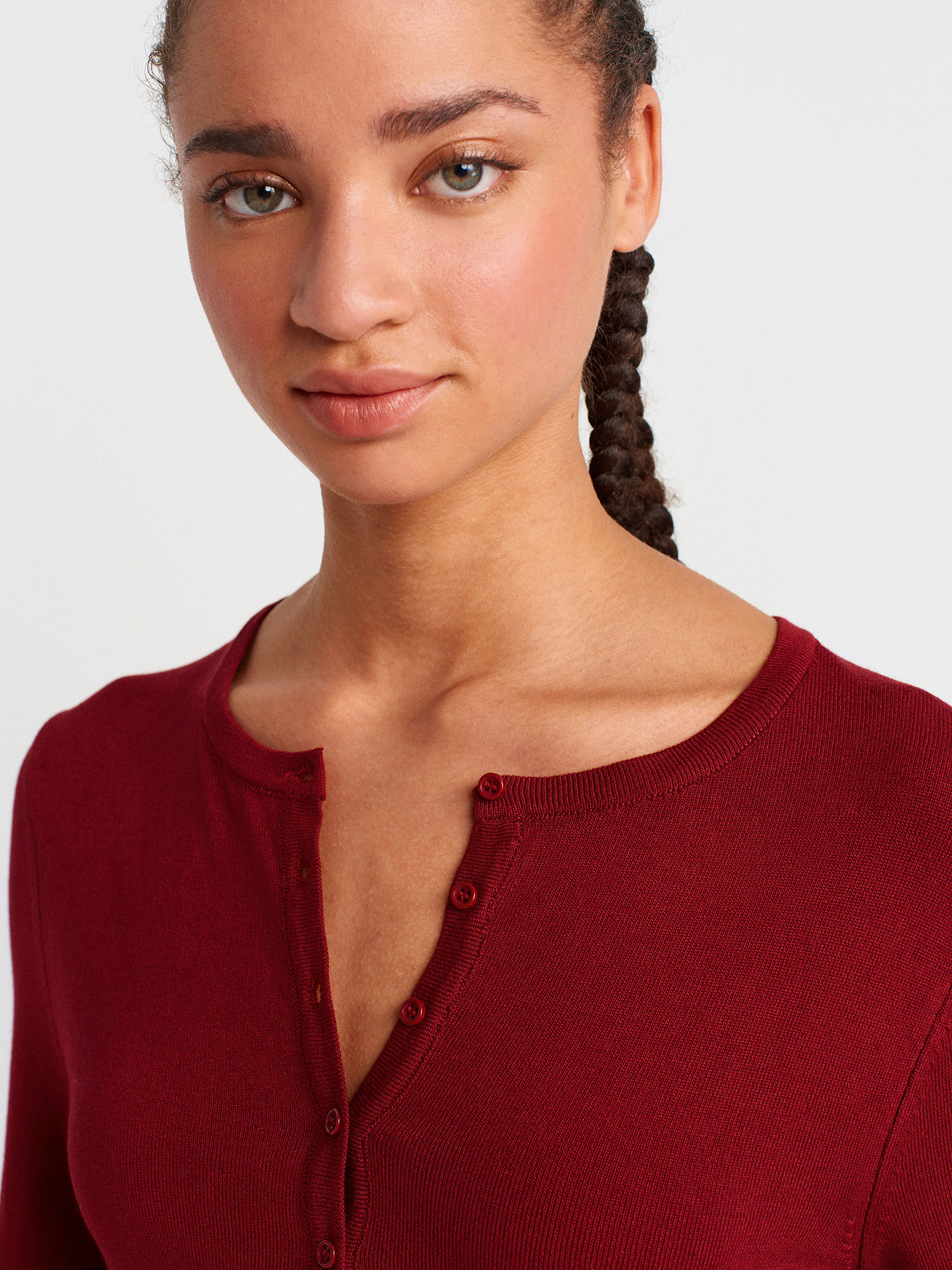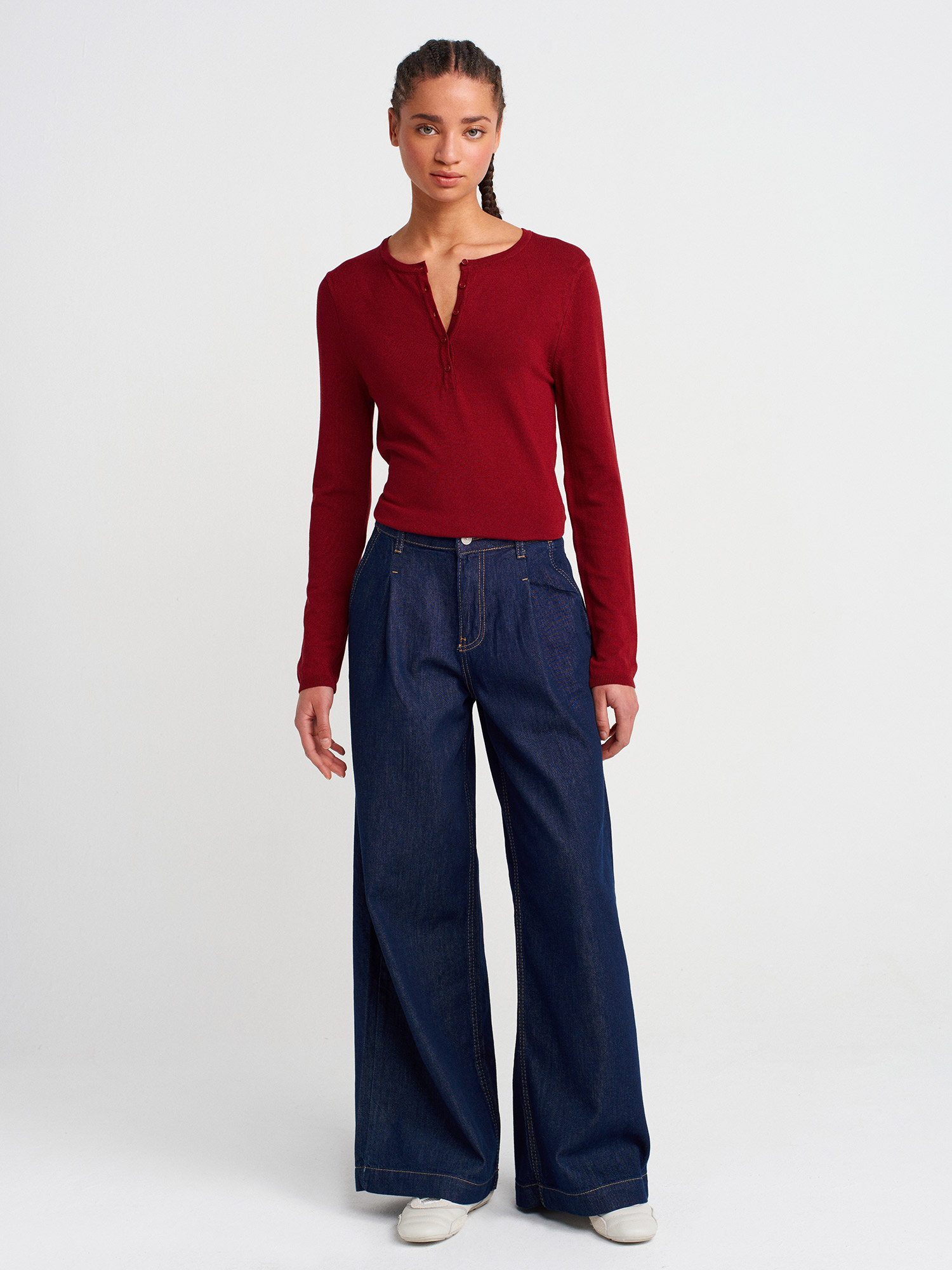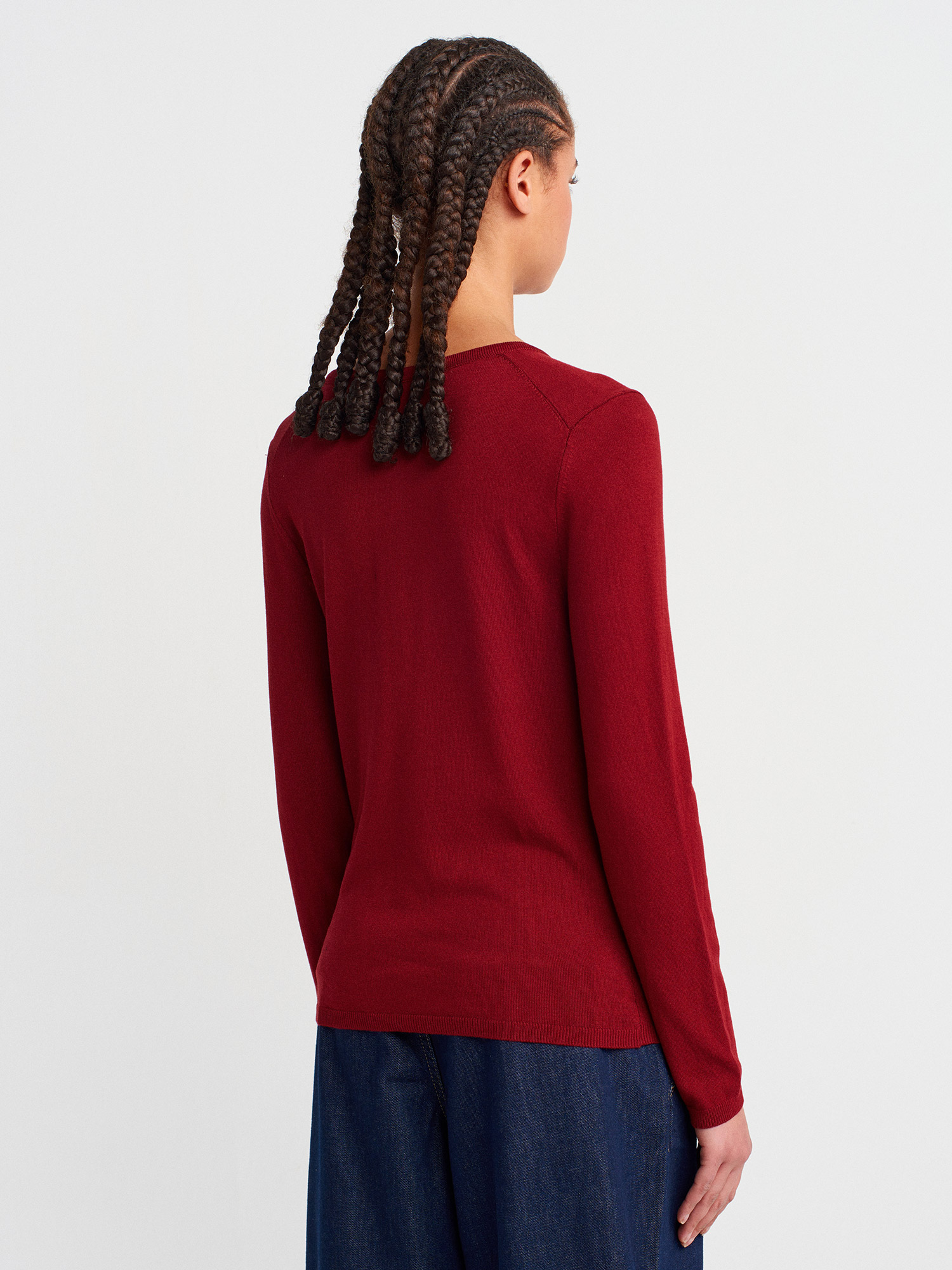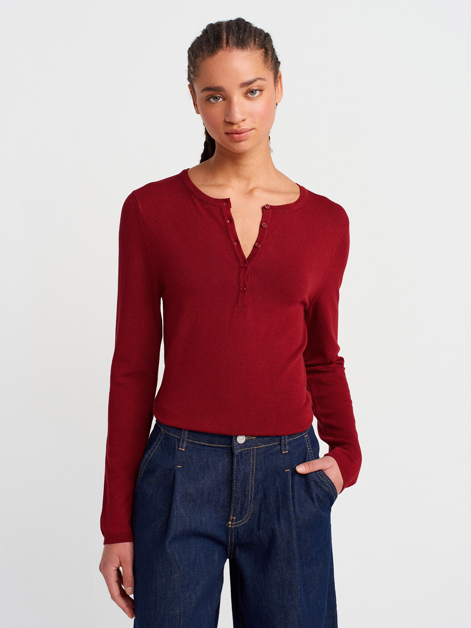 10736 Bisiklet Yaka Düğmeli Basic İnce Triko Kazak-Bordo
